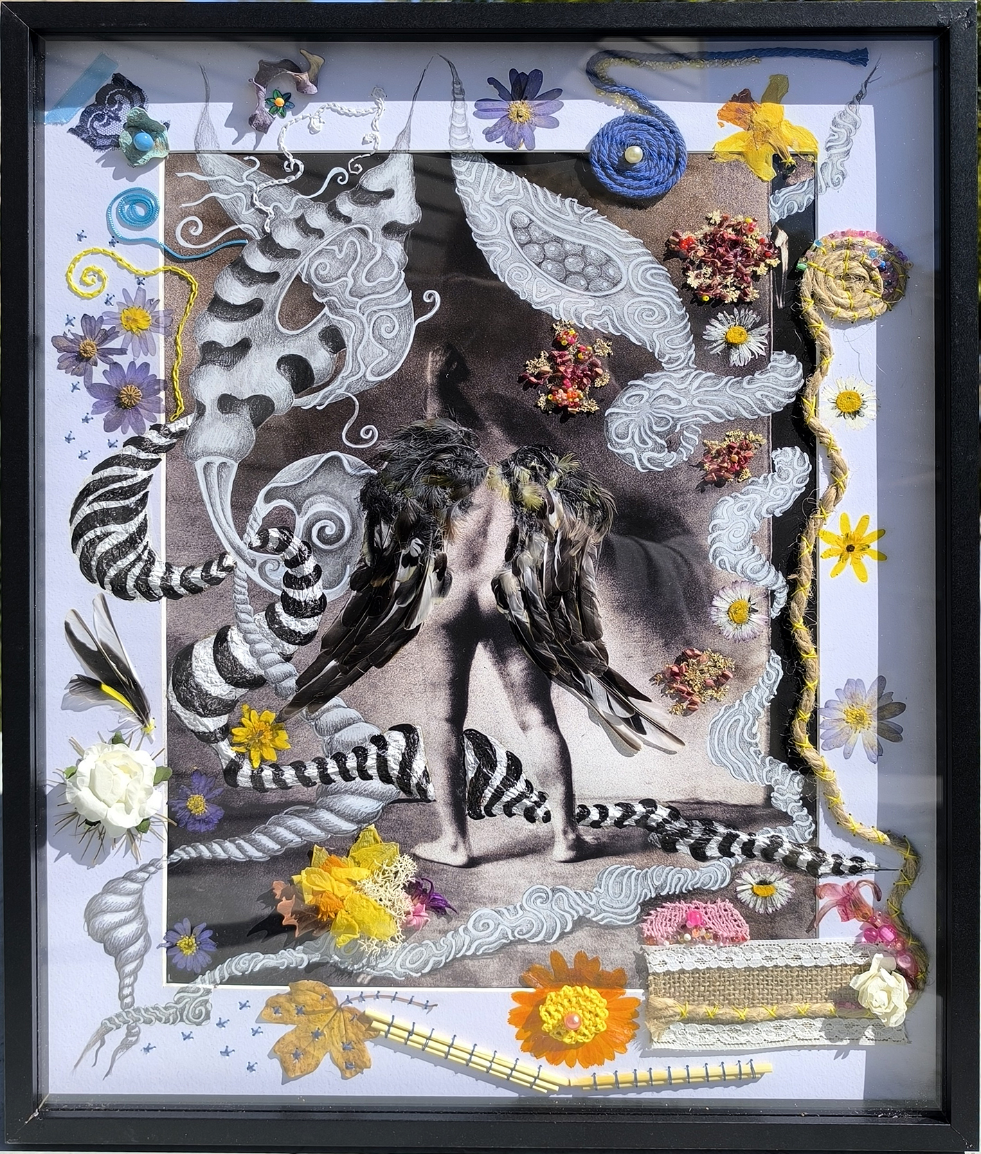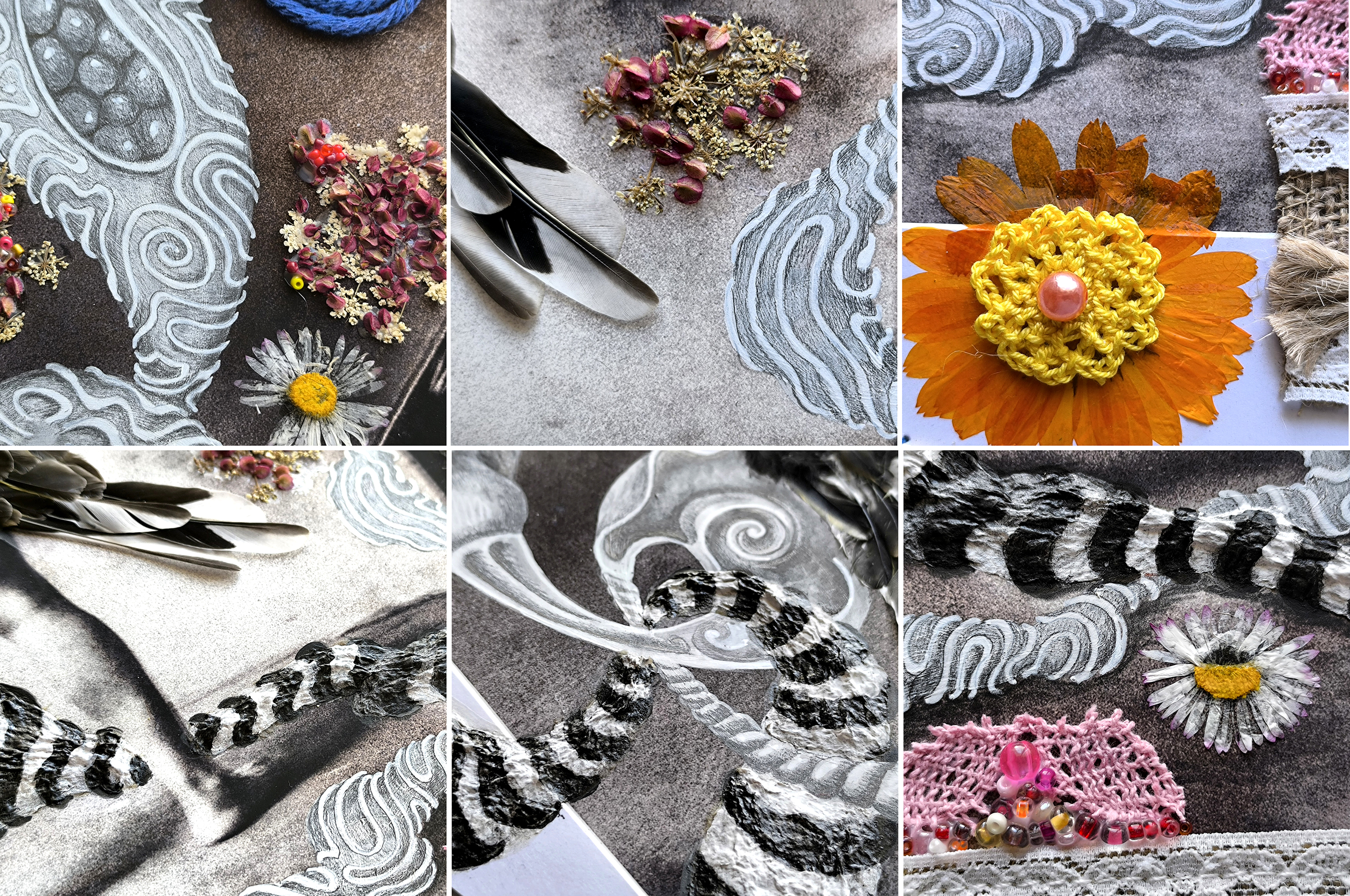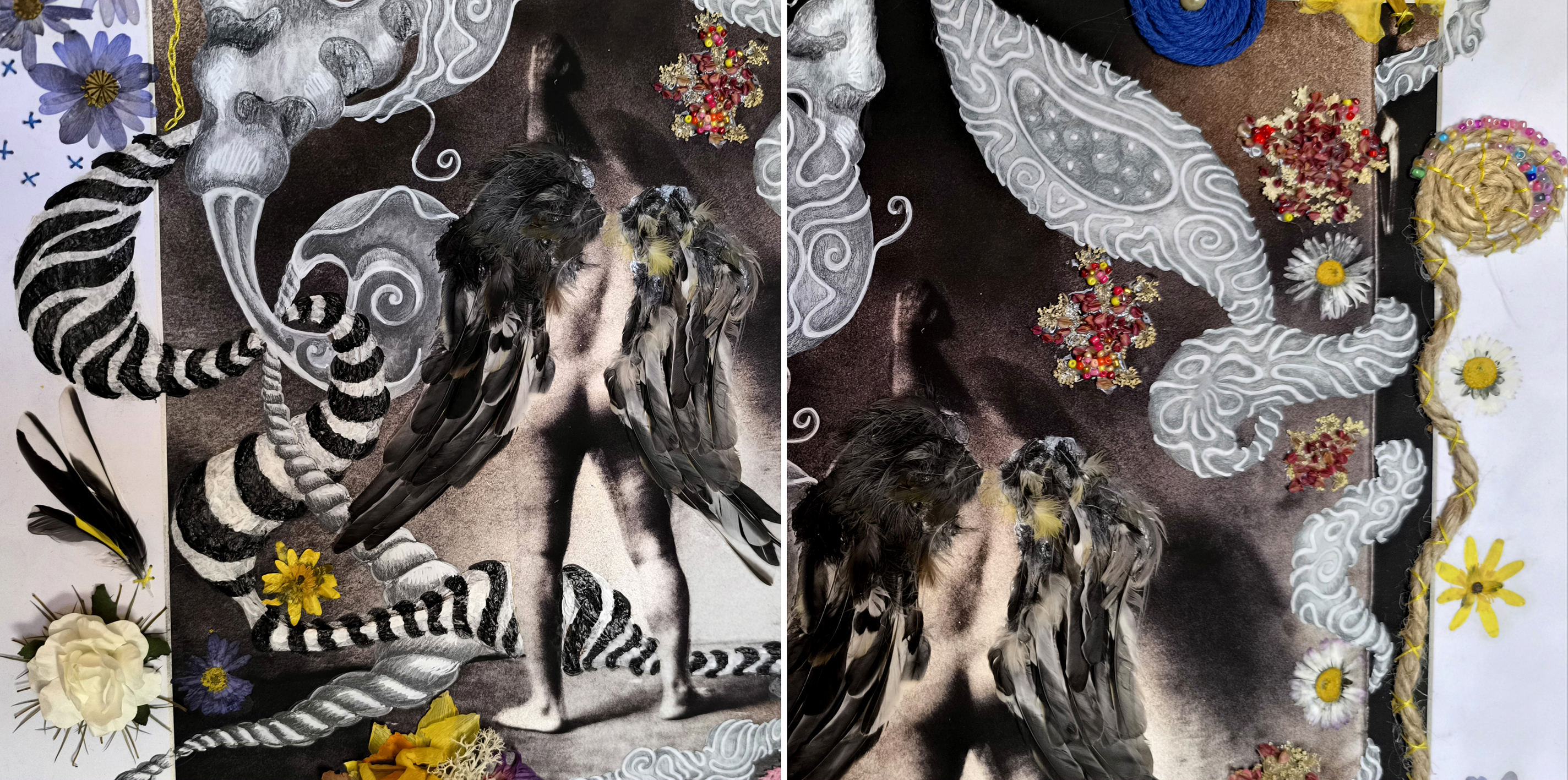 Chaque photographie appelle son propre langage plastique : feutre noir ou blanc, peinture acrylique, graphite, sanguine, craie. Dans un second temps, je prolonge ce dialogue par le collage de matières naturelles et artificielles : plumes, fleurs séchées, écorce, graminées, rubans, dentelles, perles…