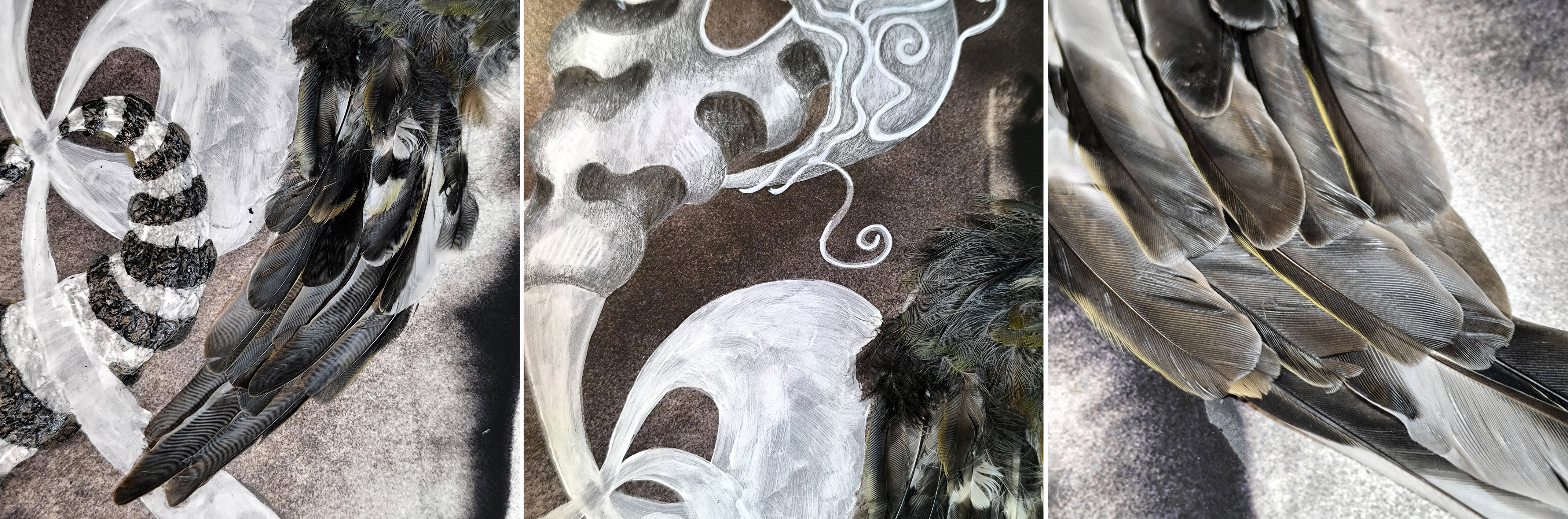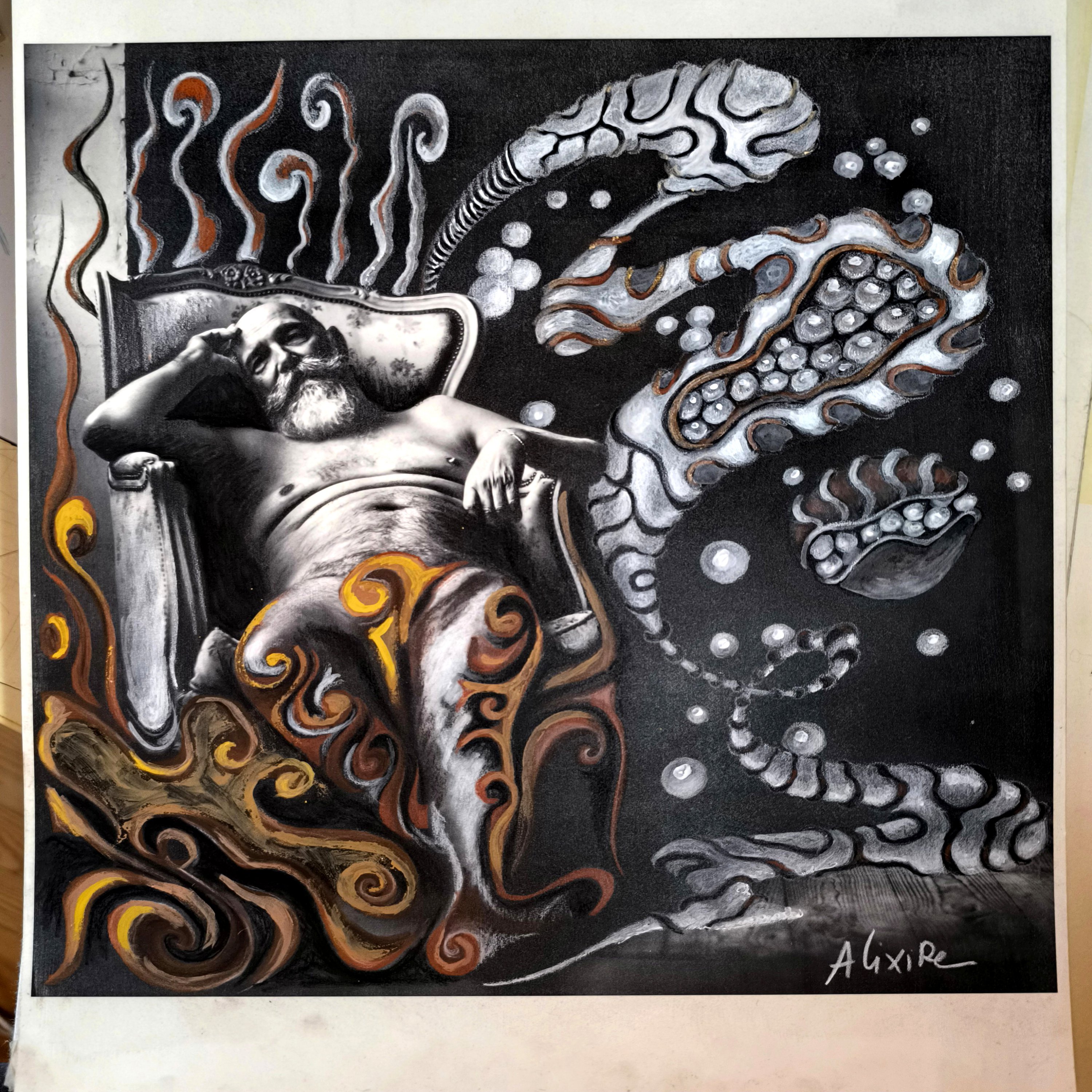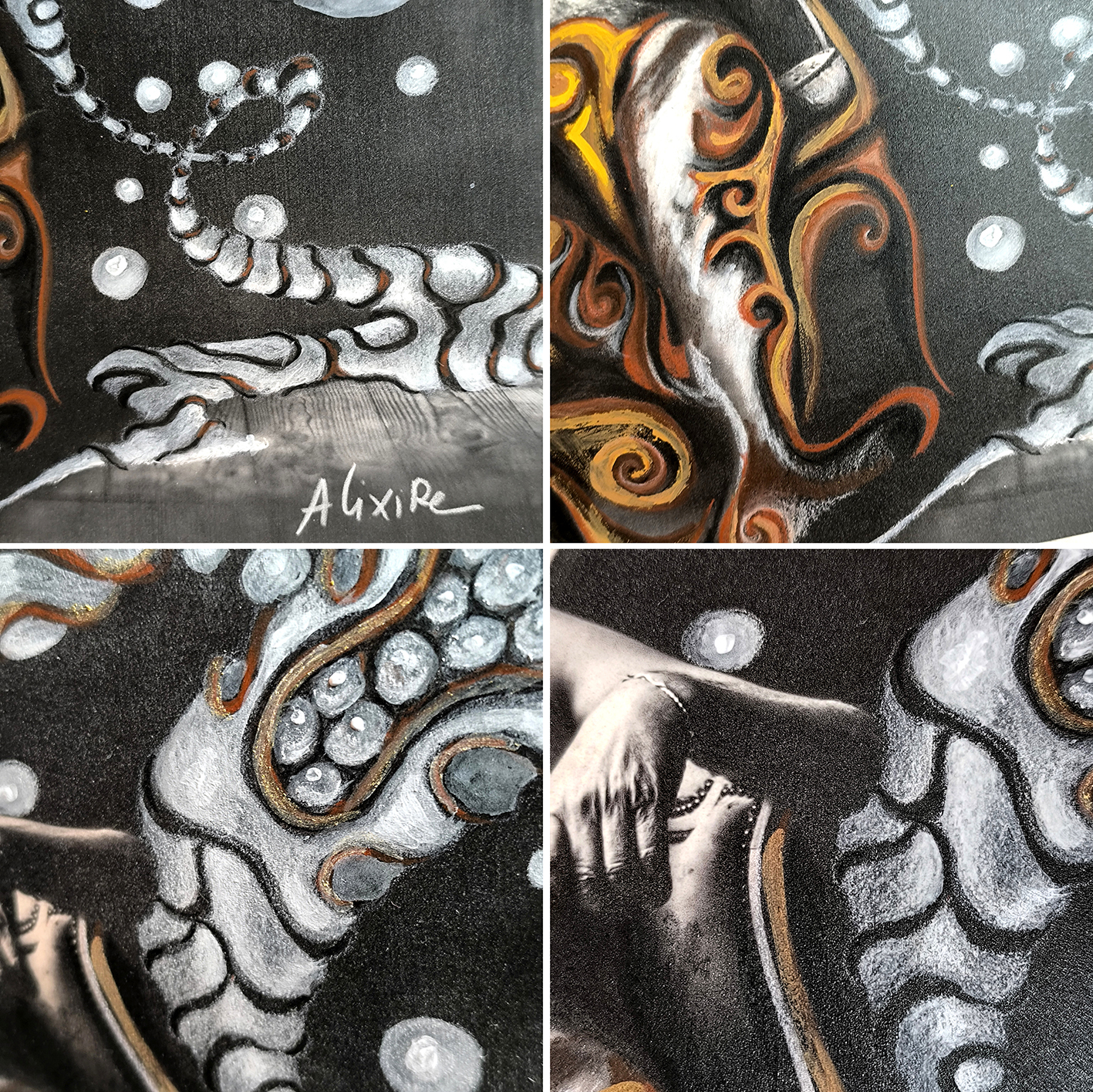 Sur ces images déjà chargées de présence, je déploie mon imaginaire : volutes et formes abstraites, modelées avec soin pour acquérir une densité presque tangible. Mais aussi des motifs figuratifs surgissent, tels que des ailes (écho à mon goût pour les anges) ou des créatures inspirées de mythes anciens.