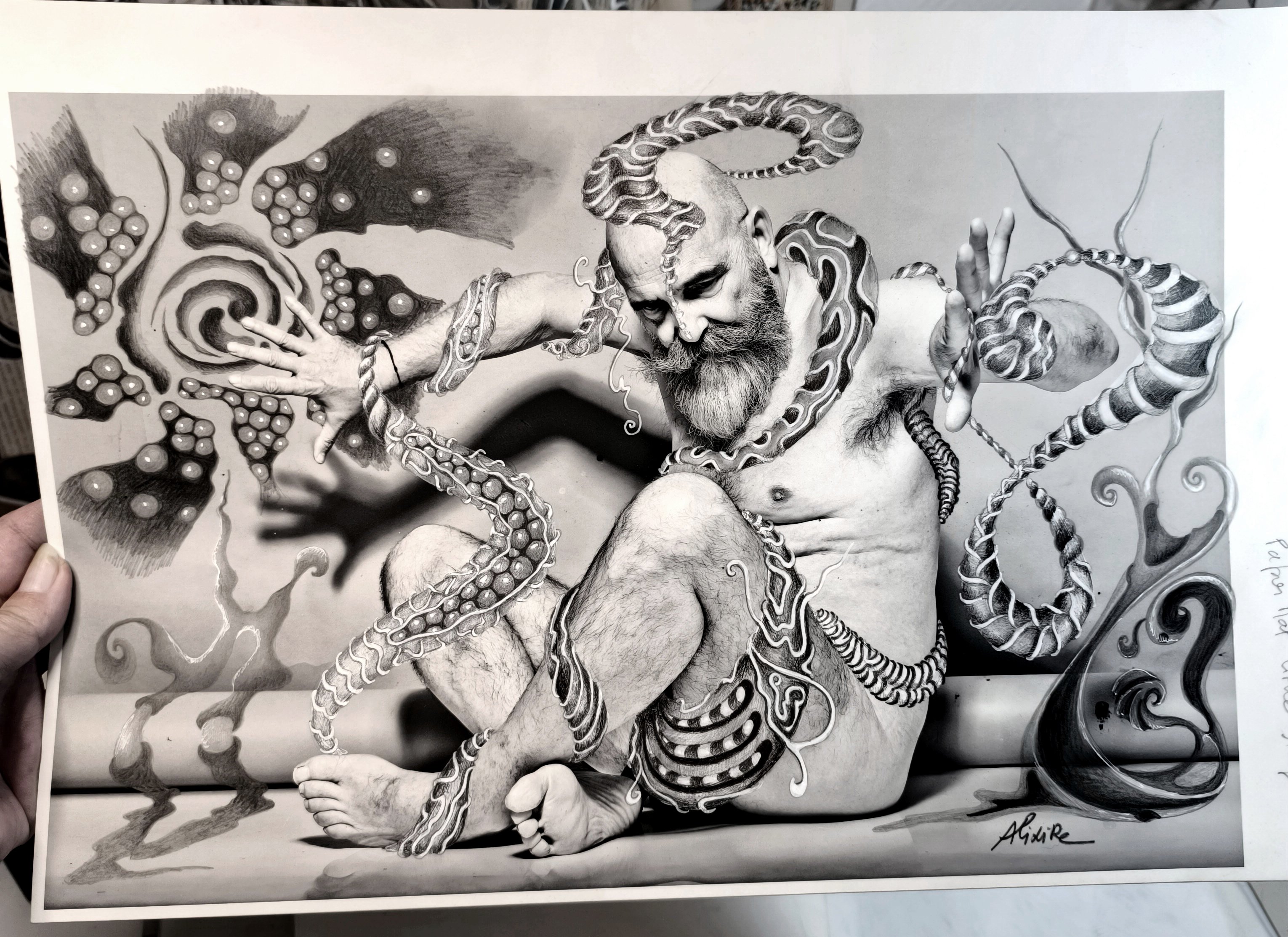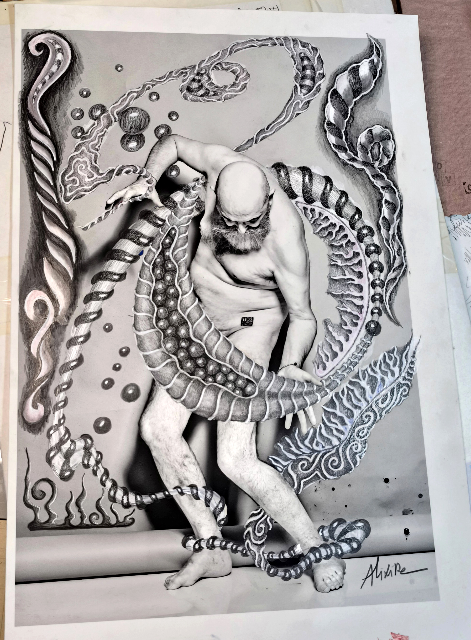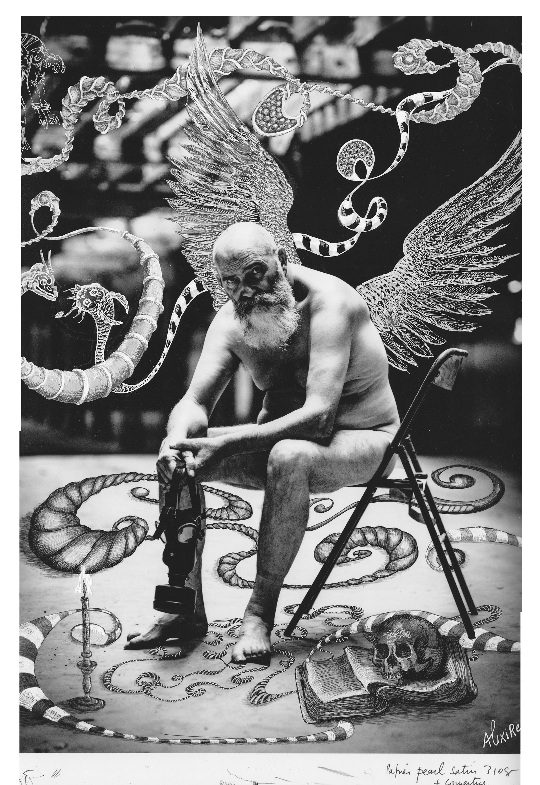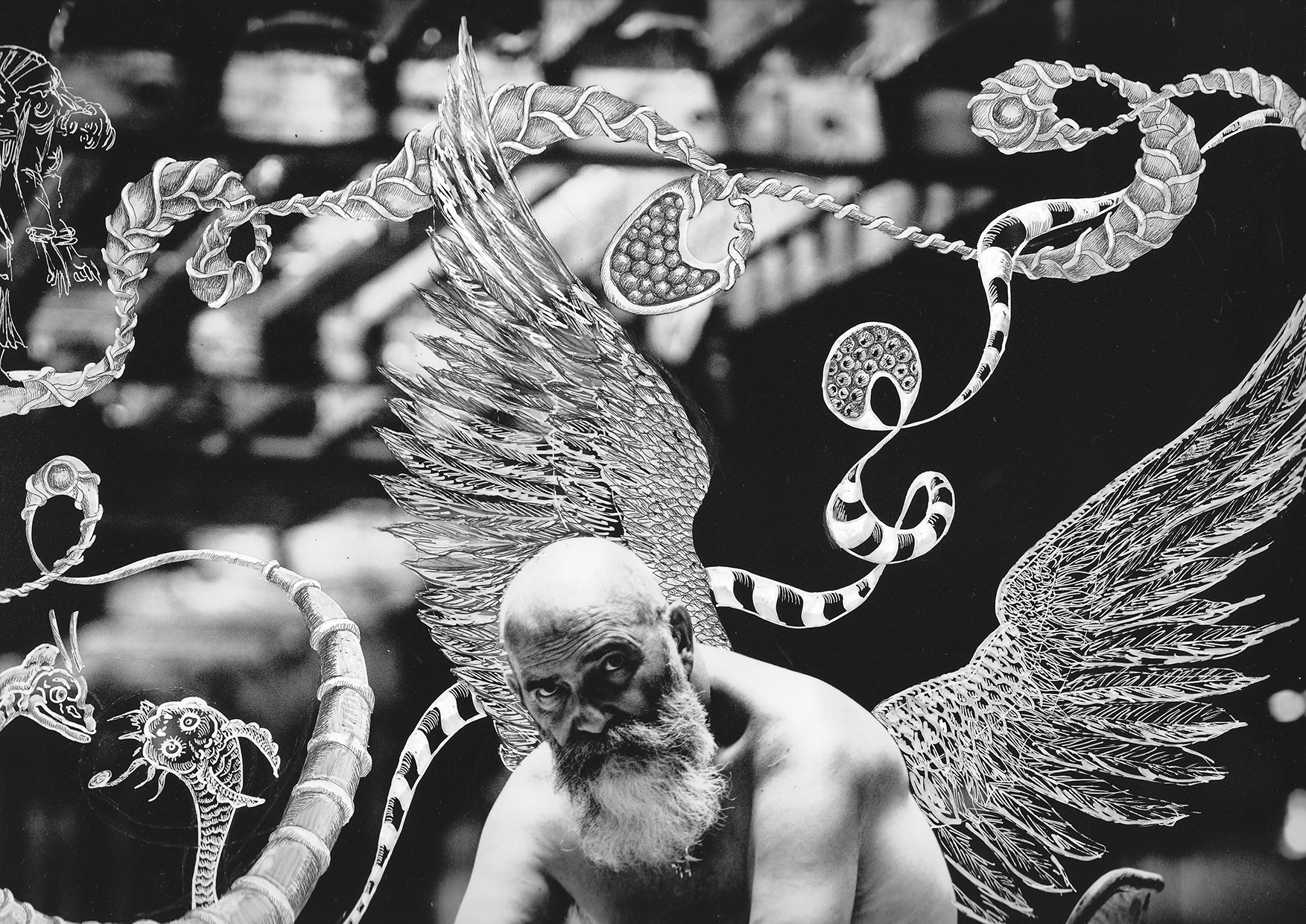 Sur ces images déjà chargées de présence, je déploie mon imaginaire : volutes et formes abstraites, modelées avec soin pour acquérir une densité presque tangible. Mais aussi des motifs figuratifs surgissent, tels que des ailes (écho à mon goût pour les anges) ou des créatures inspirées de mythes anciens.
