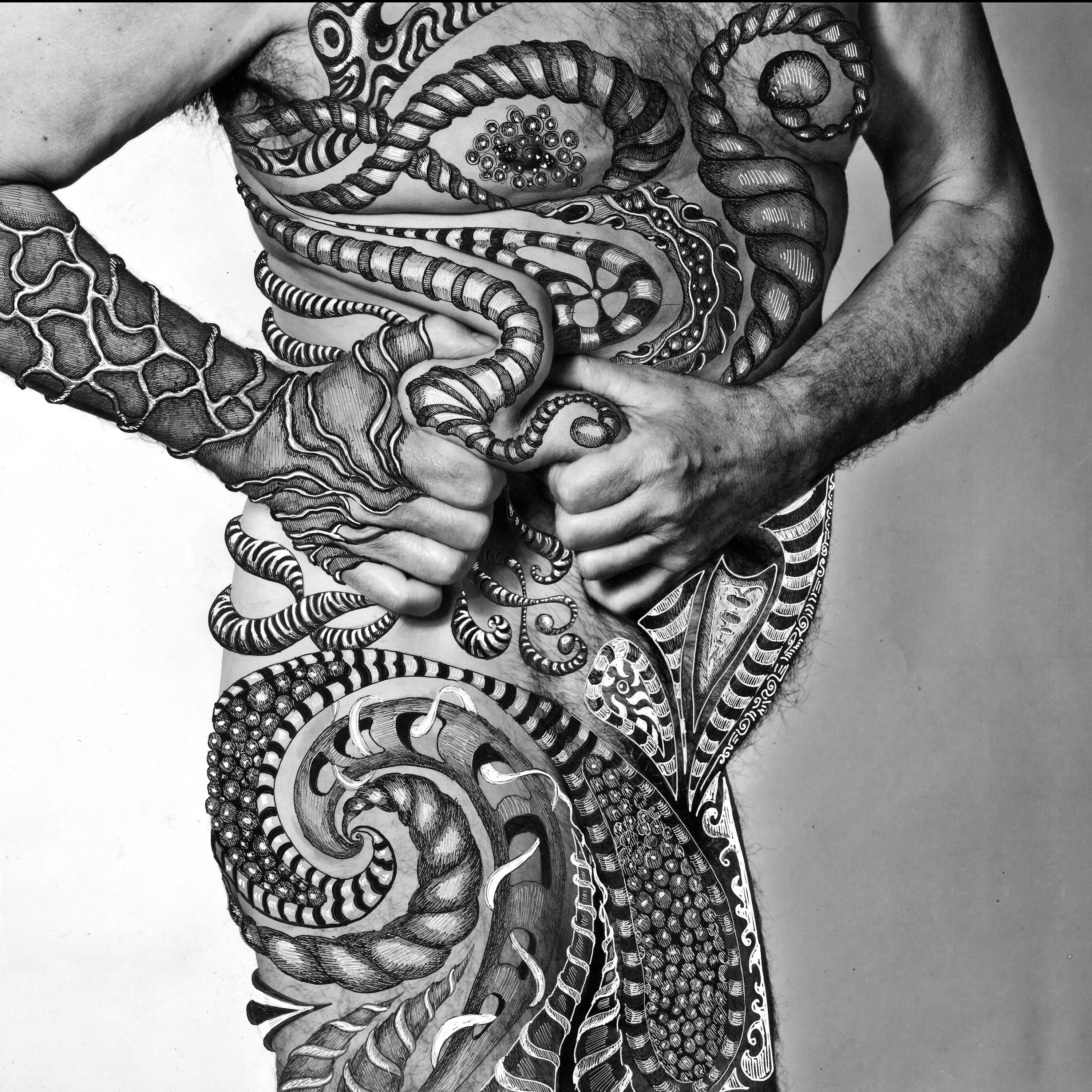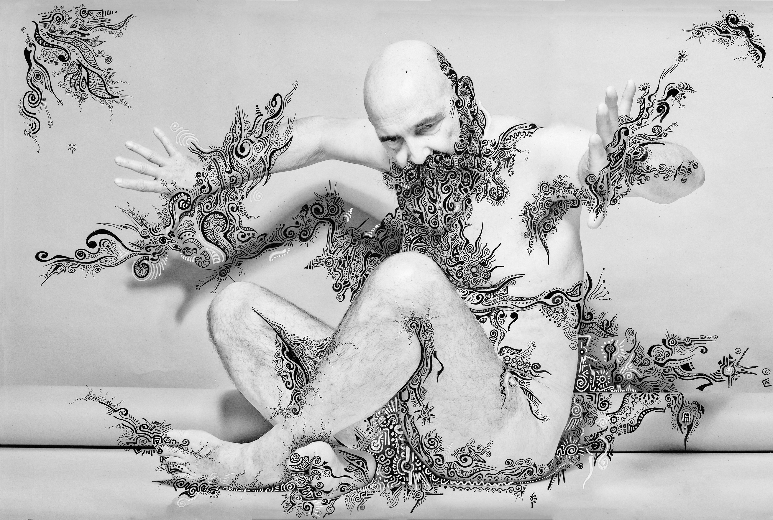 Cette série naît d’une rencontre artistique : les autoportraits en noir et blanc d’un photographe, travaillant sur le corps et sa temporalité, deviennent le support de mon intervention.