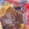 Stylo-bille, acrylique et feuille de vigne sur bois, 26x23 cm