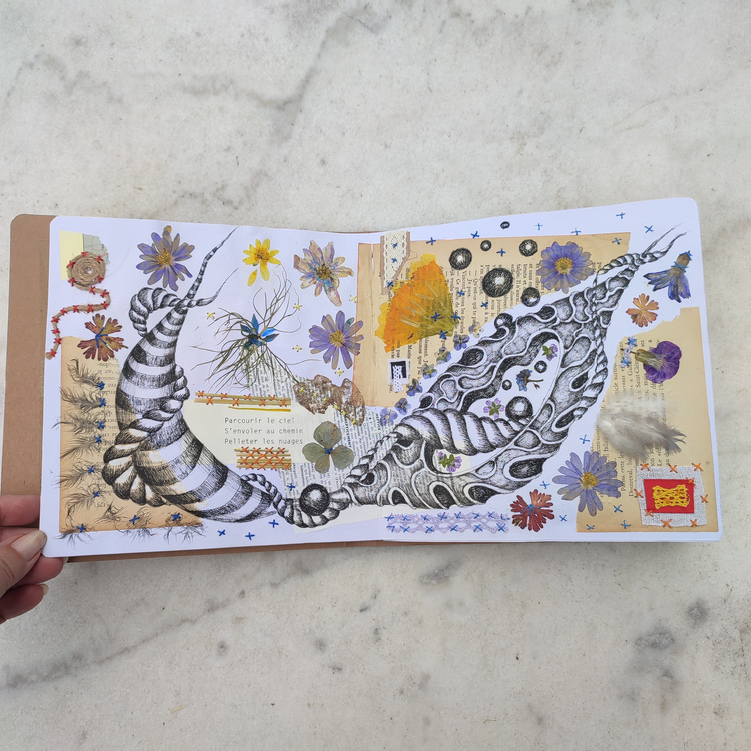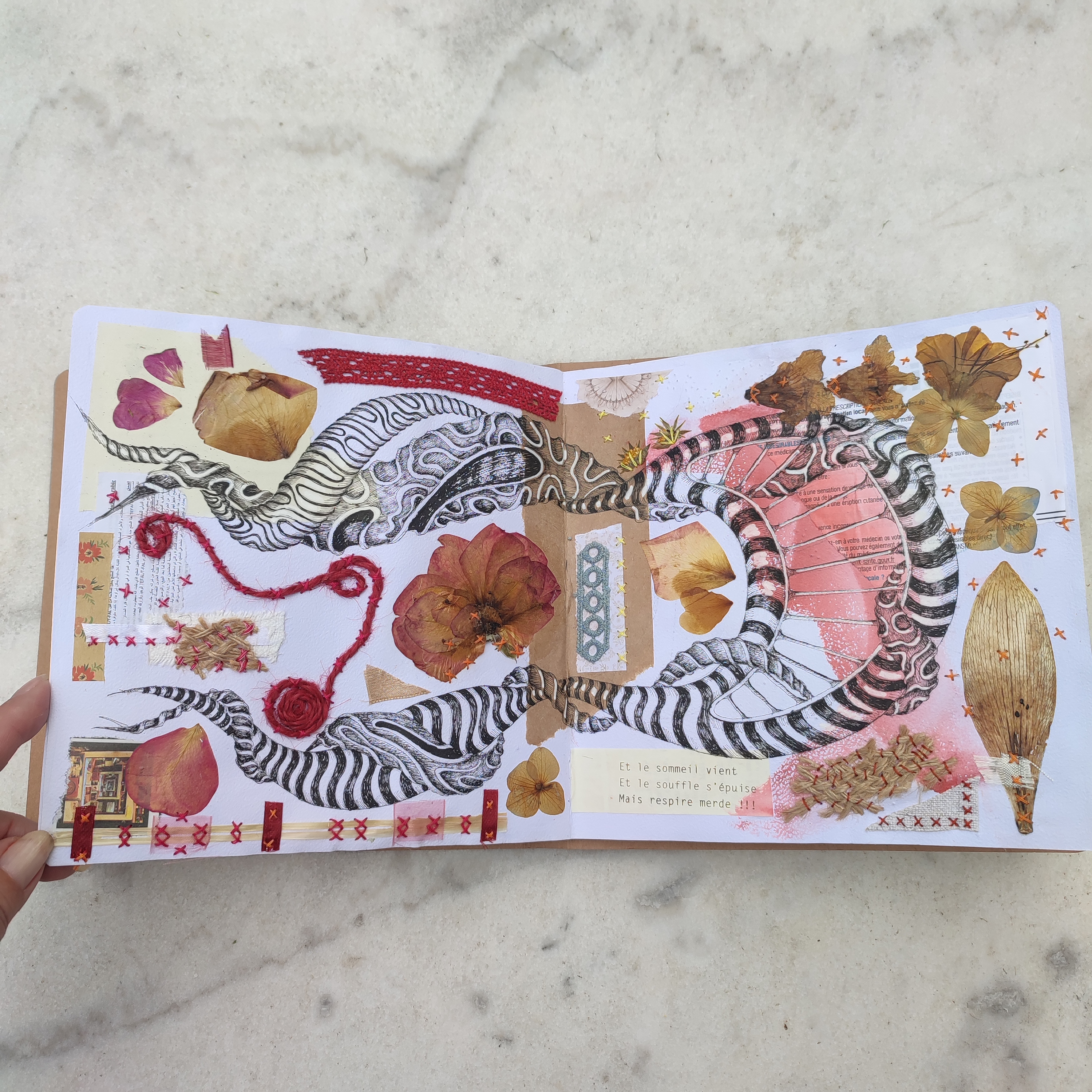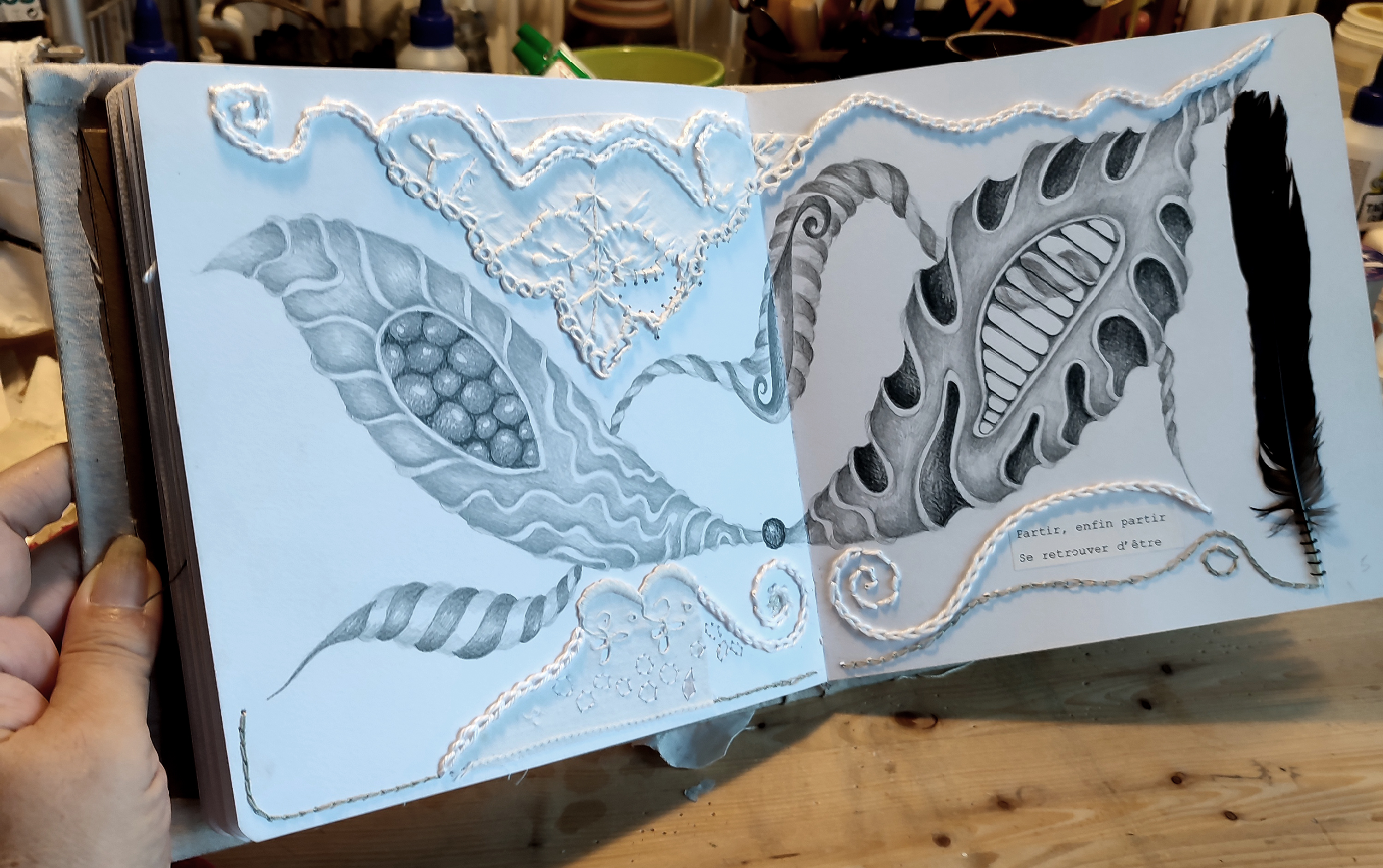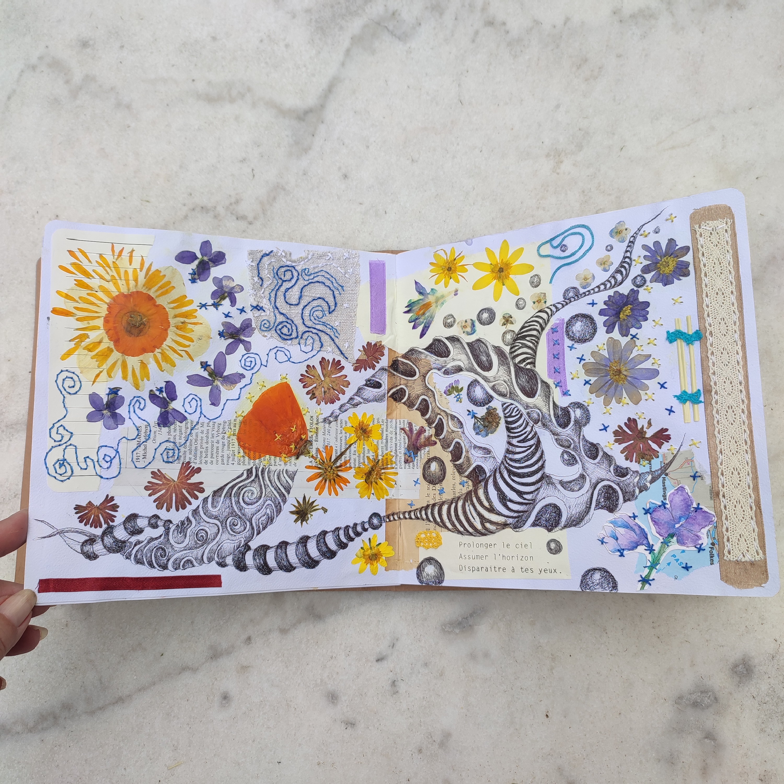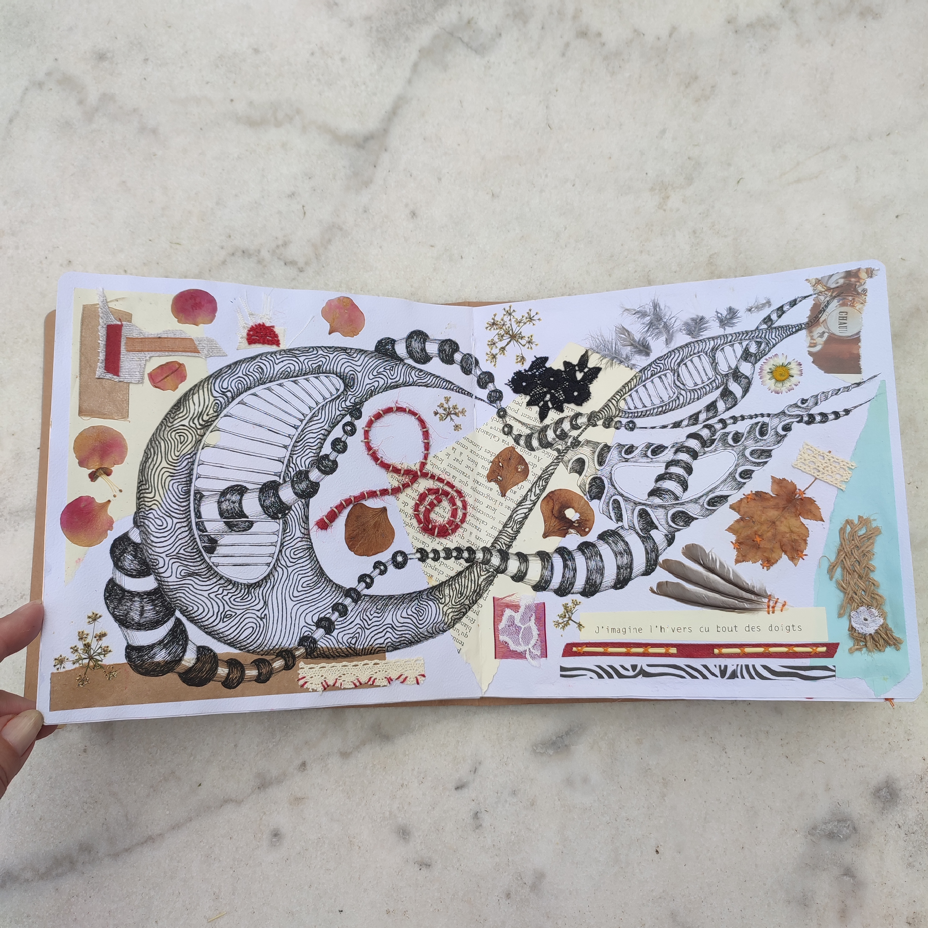 Je transforme un simple carnet trouvé dans le commerce (j’adore les carnets) en une œuvre unique, où chaque page devient un monde à part.