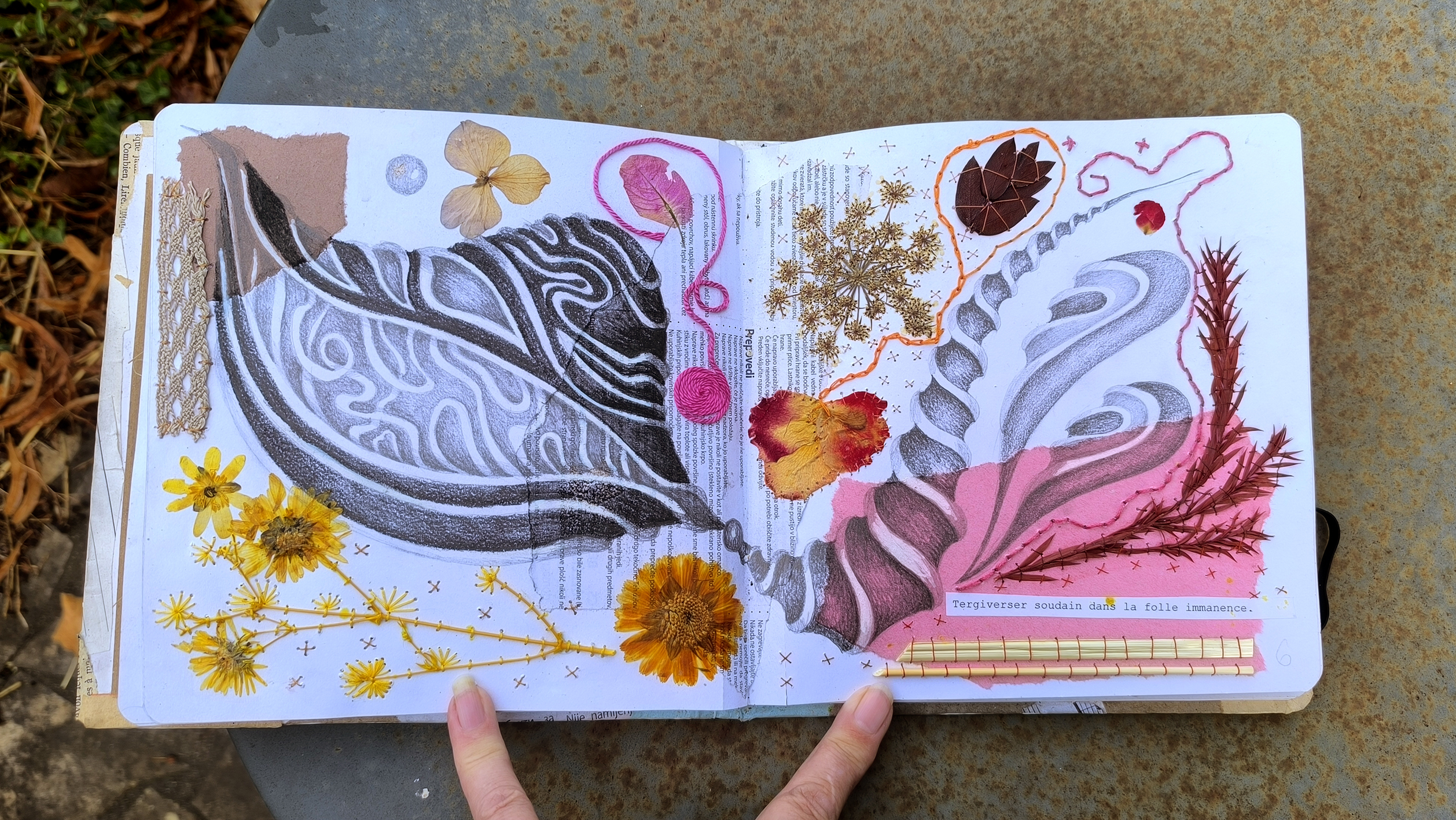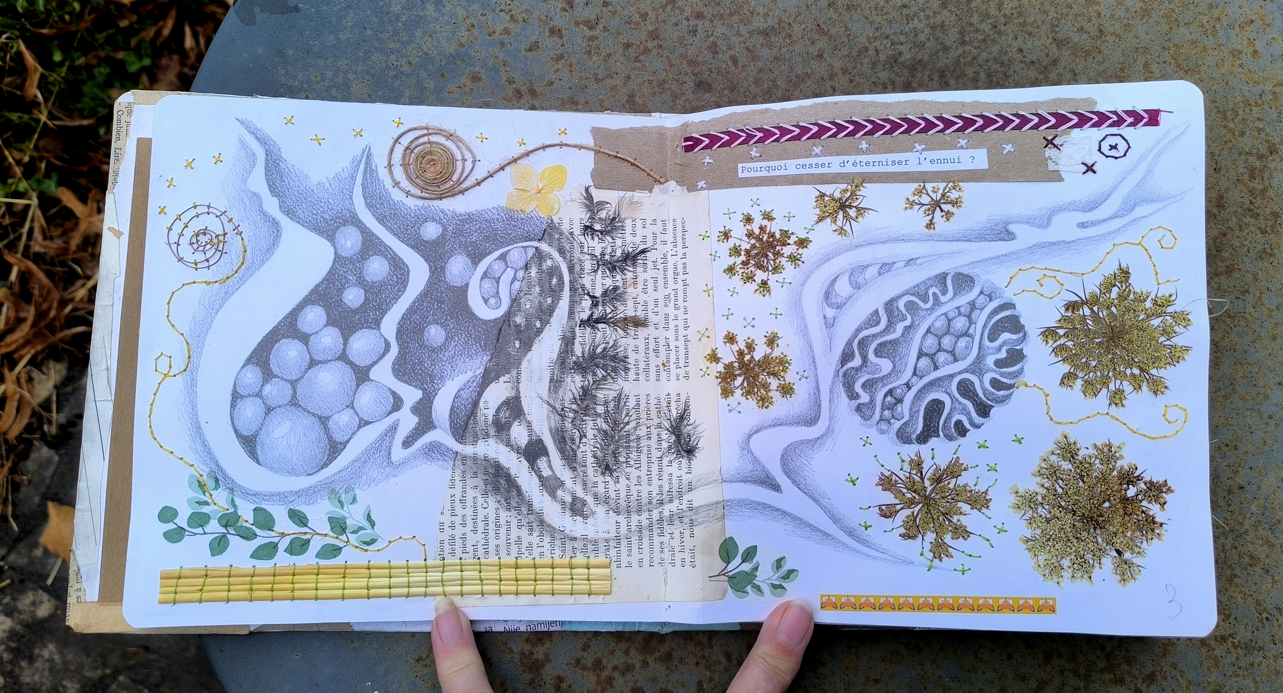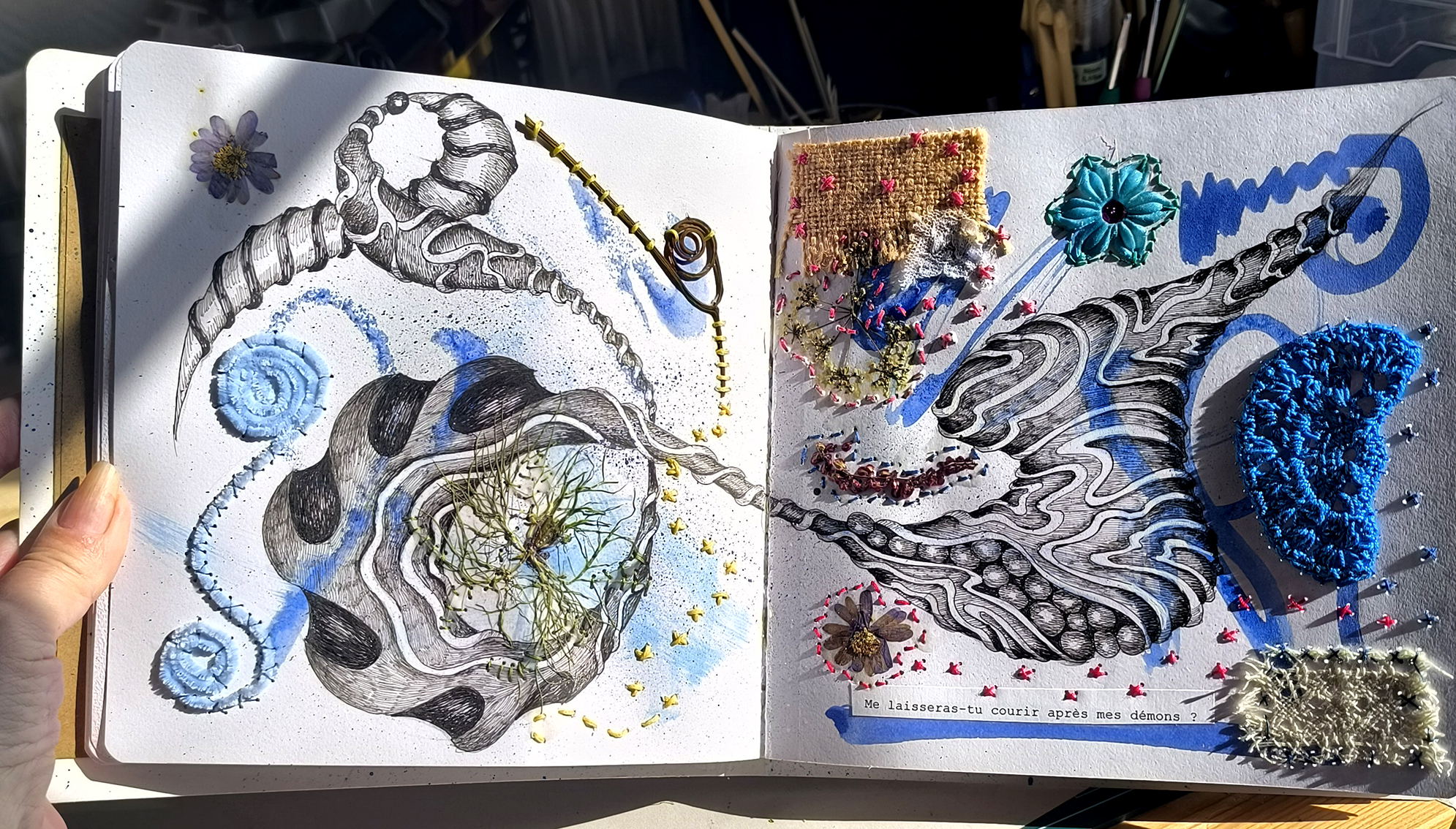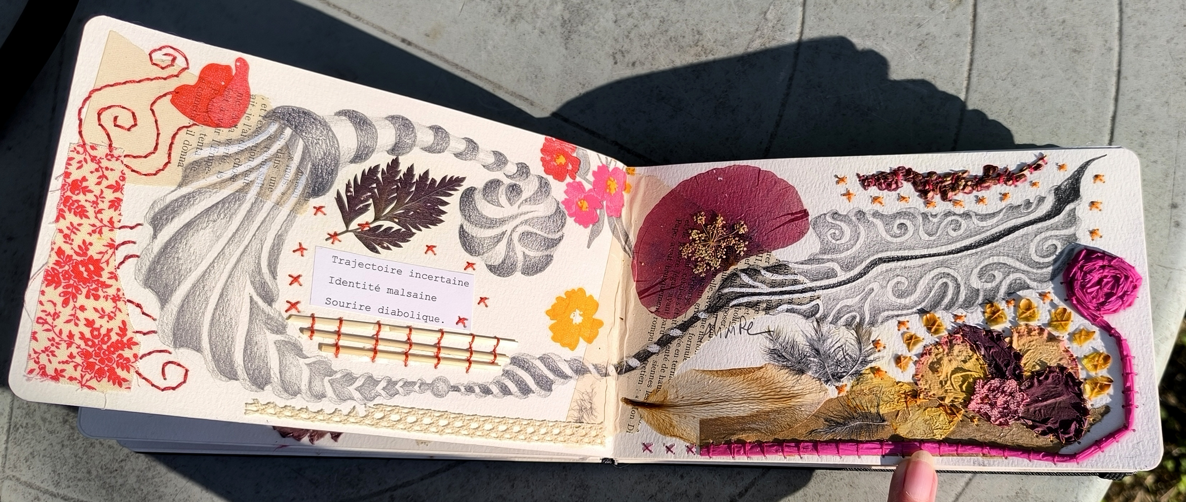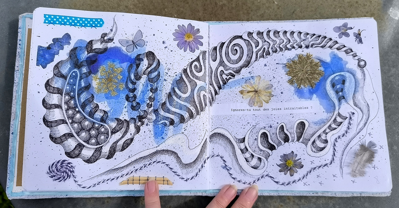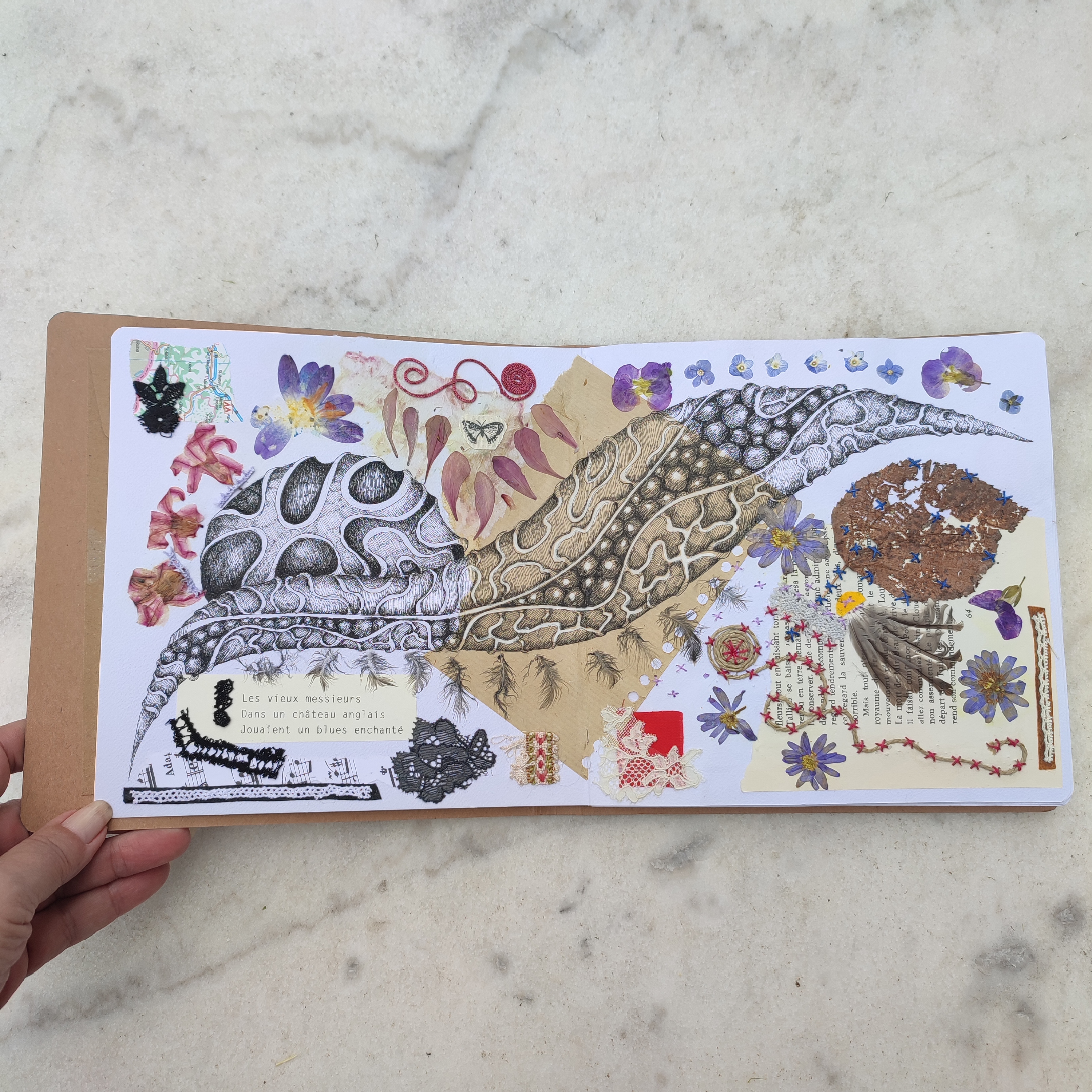 Je transforme un simple carnet trouvé dans le commerce (j’adore les carnets) en une œuvre unique, où chaque page devient un monde à part.