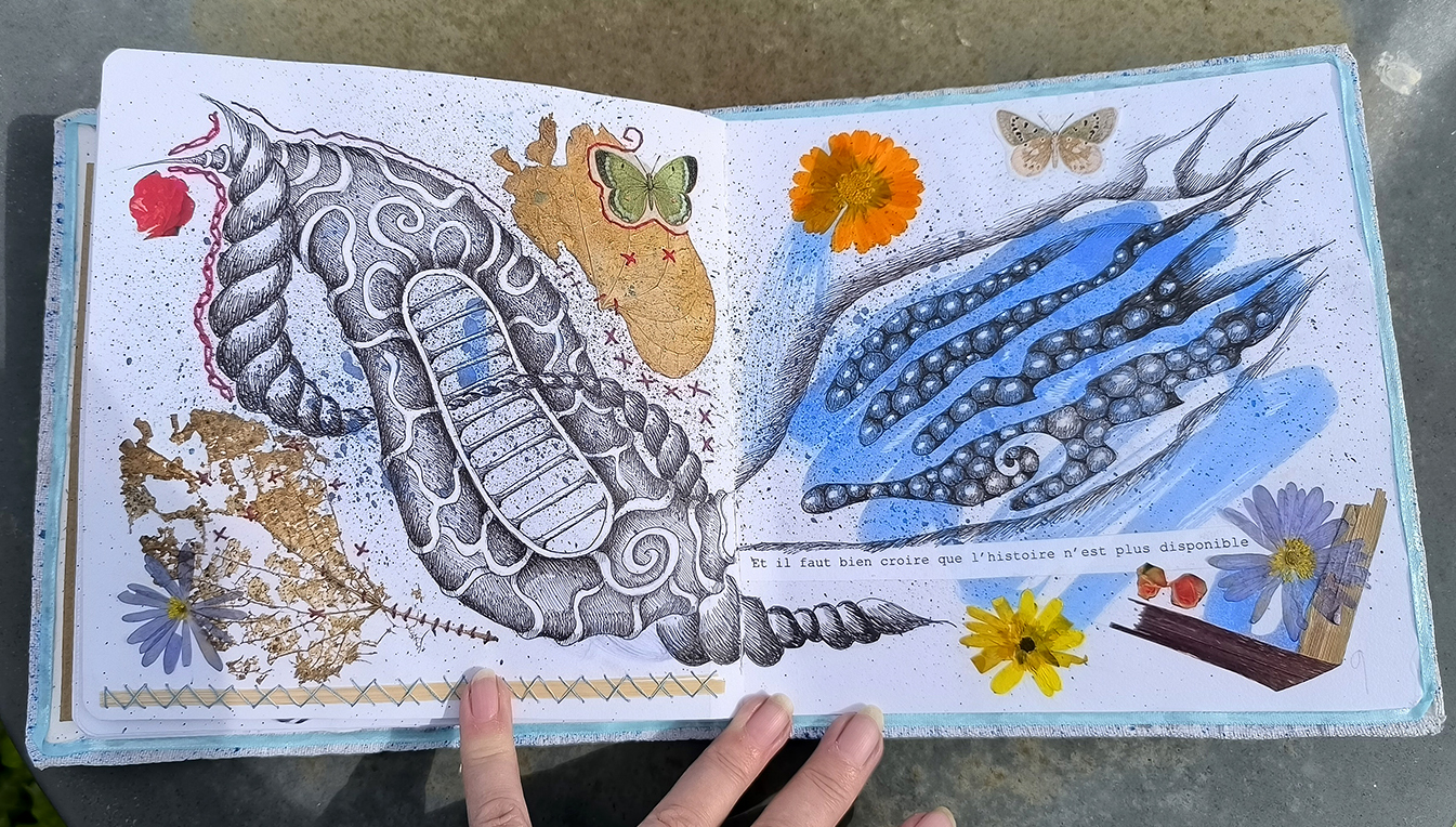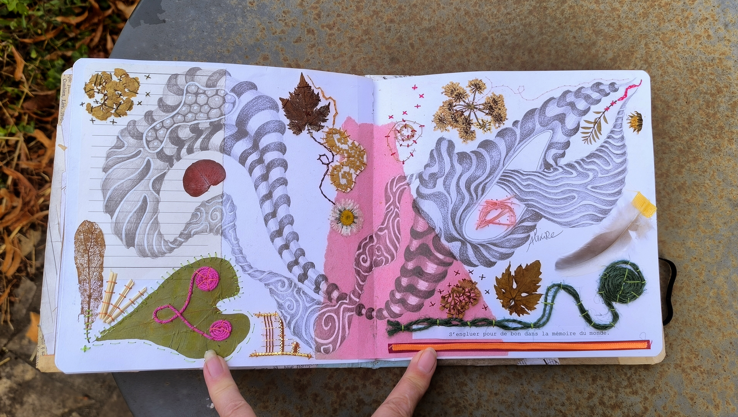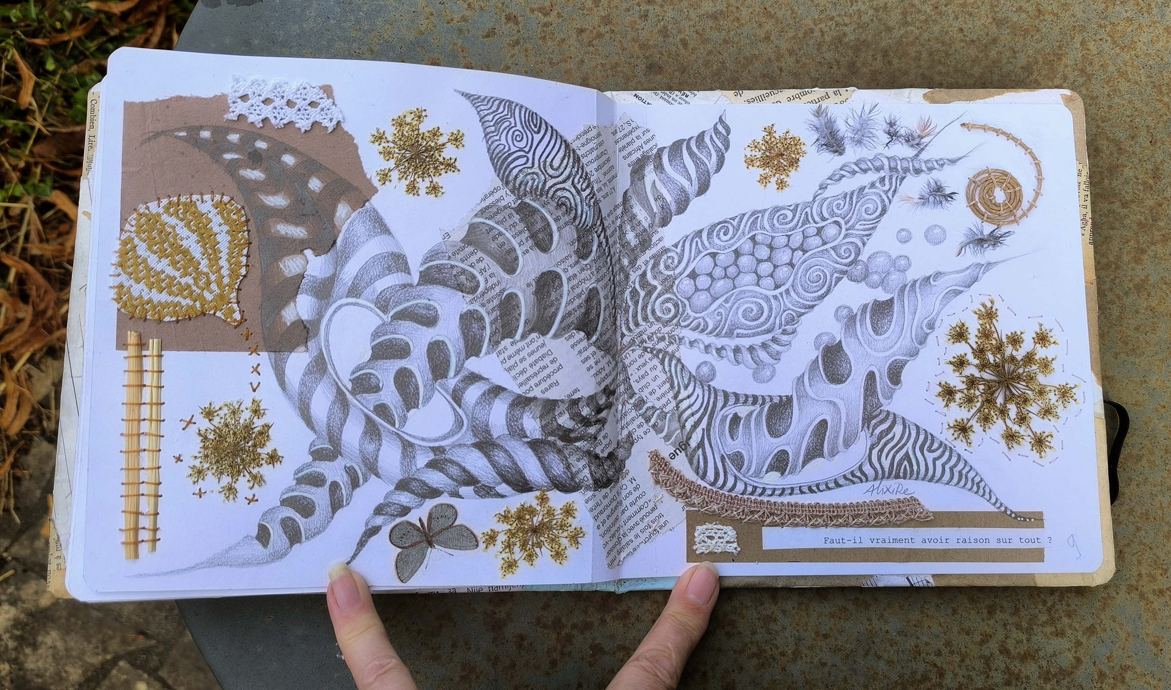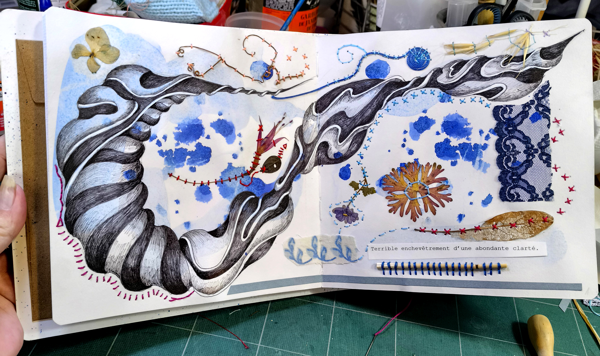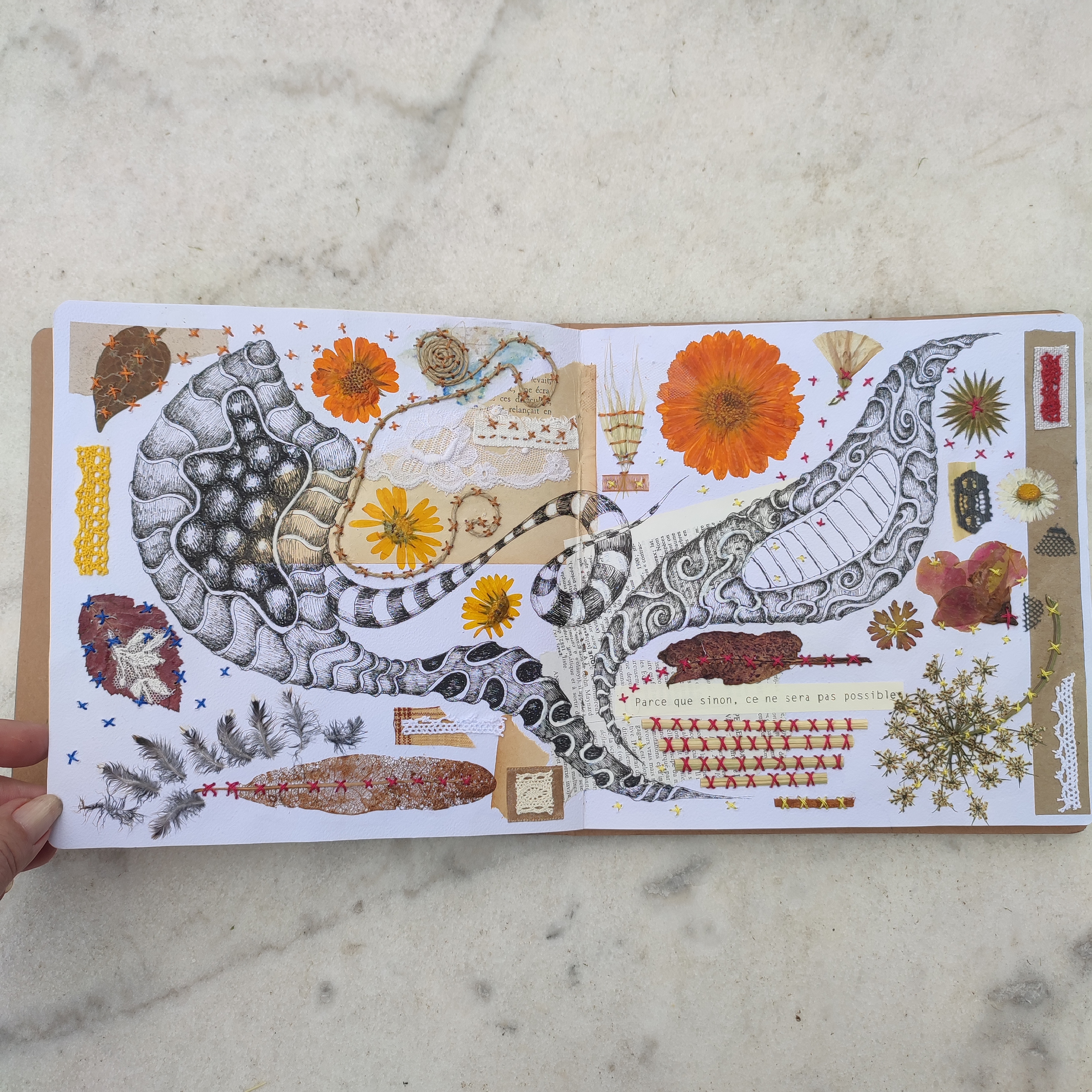 Je transforme un simple carnet trouvé dans le commerce (j’adore les carnets) en une œuvre unique, où chaque page devient un monde à part.