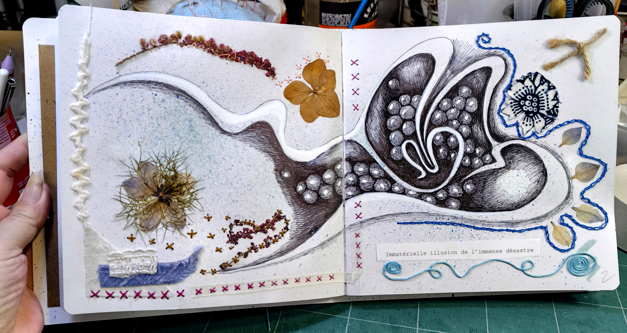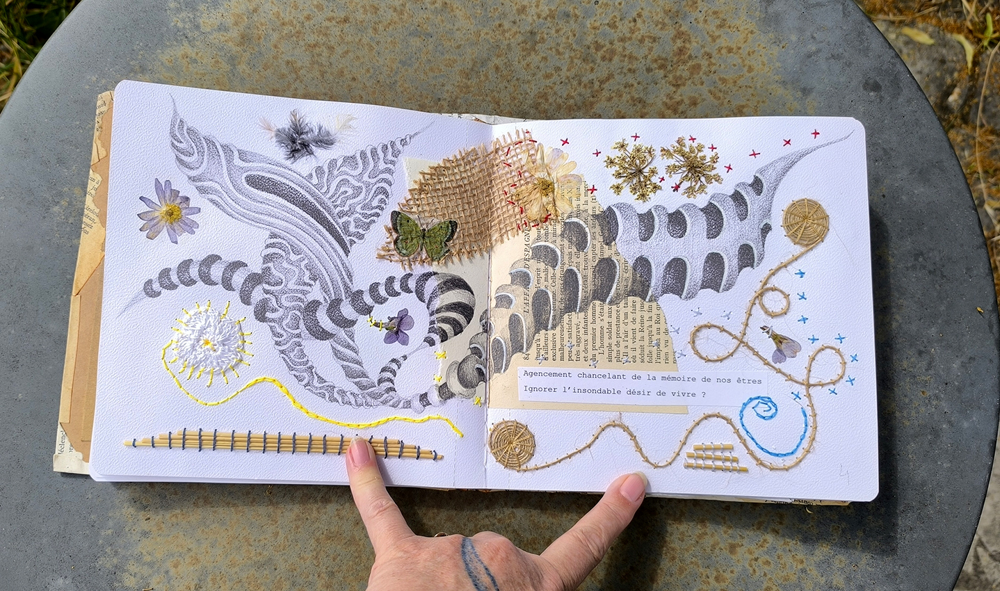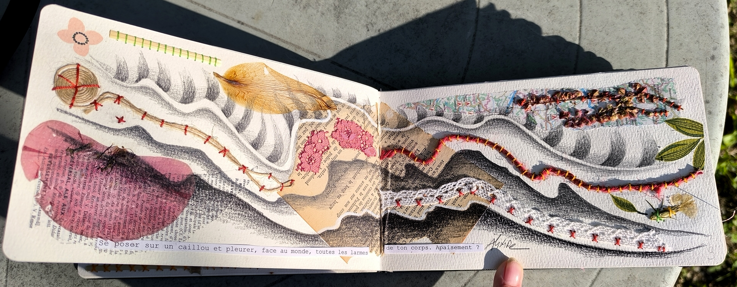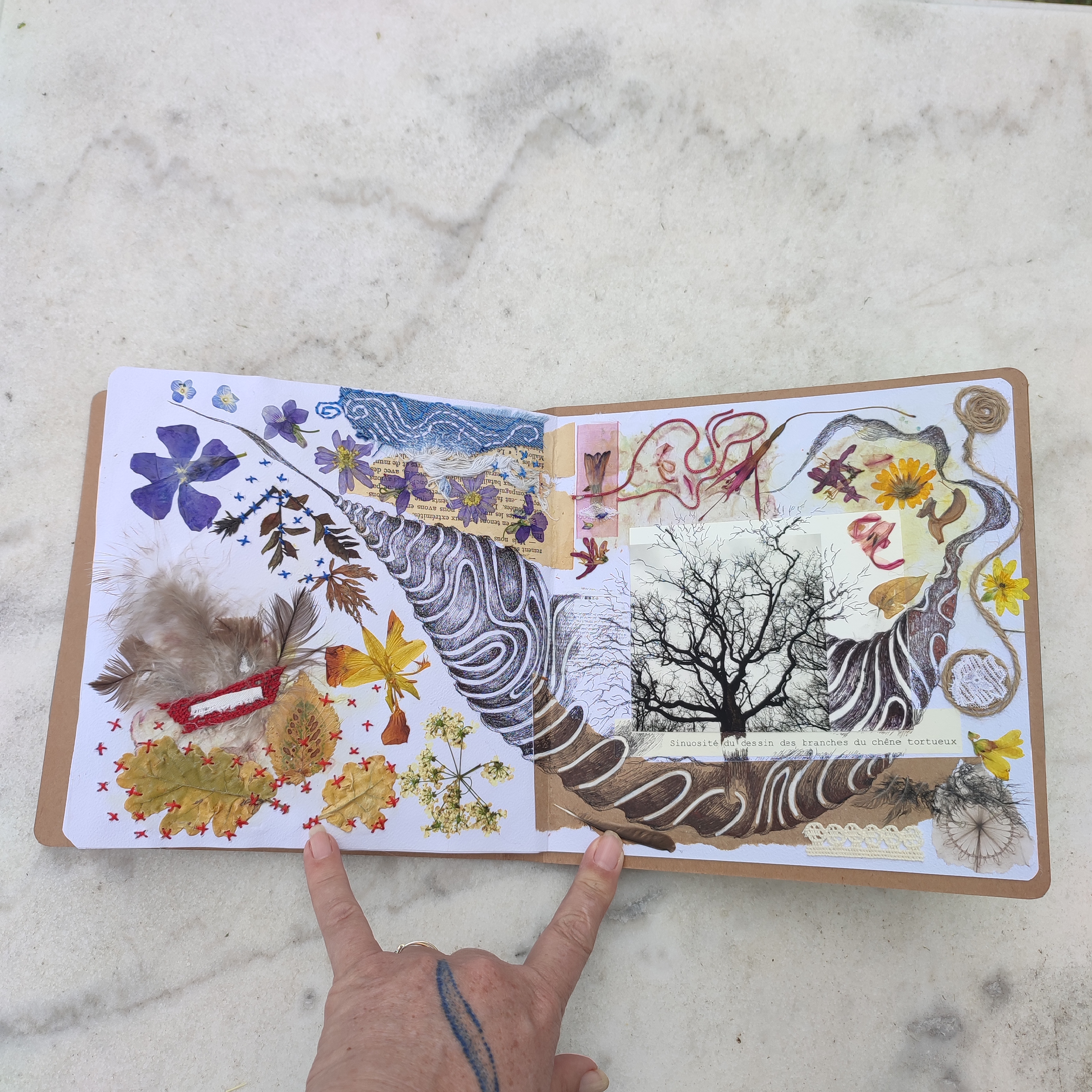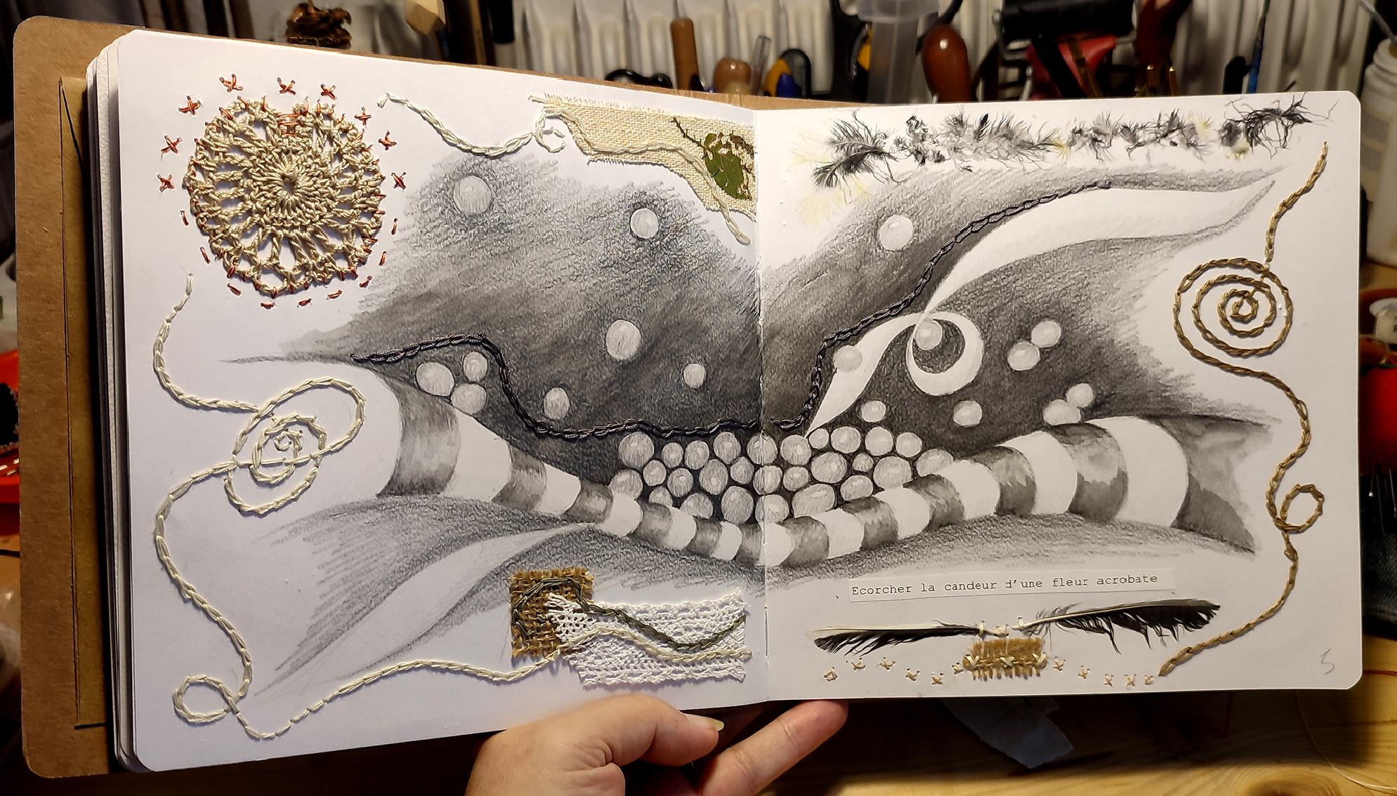 Je transforme un simple carnet trouvé dans le commerce (j’adore les carnets) en une œuvre unique, où chaque page devient un monde à part.