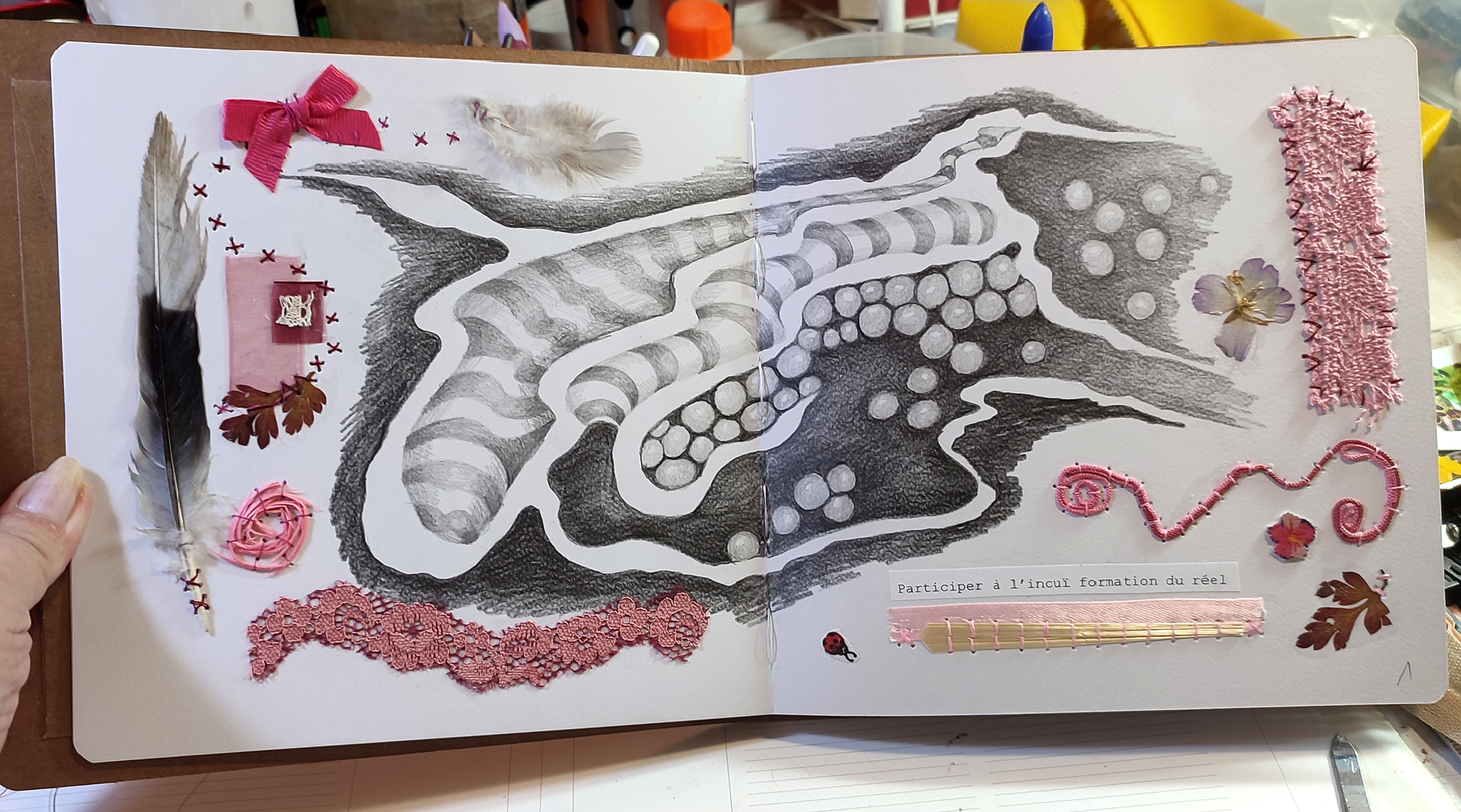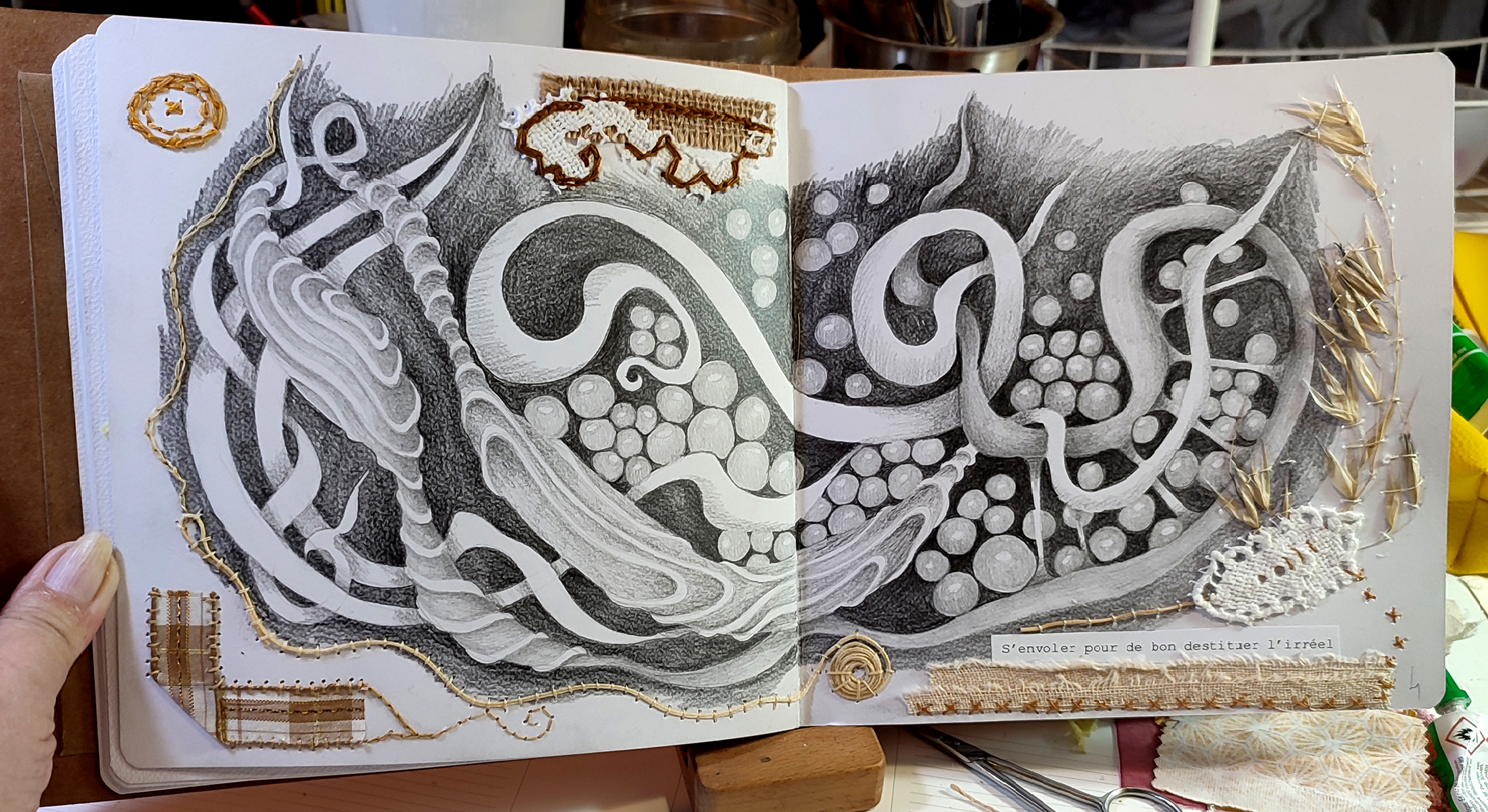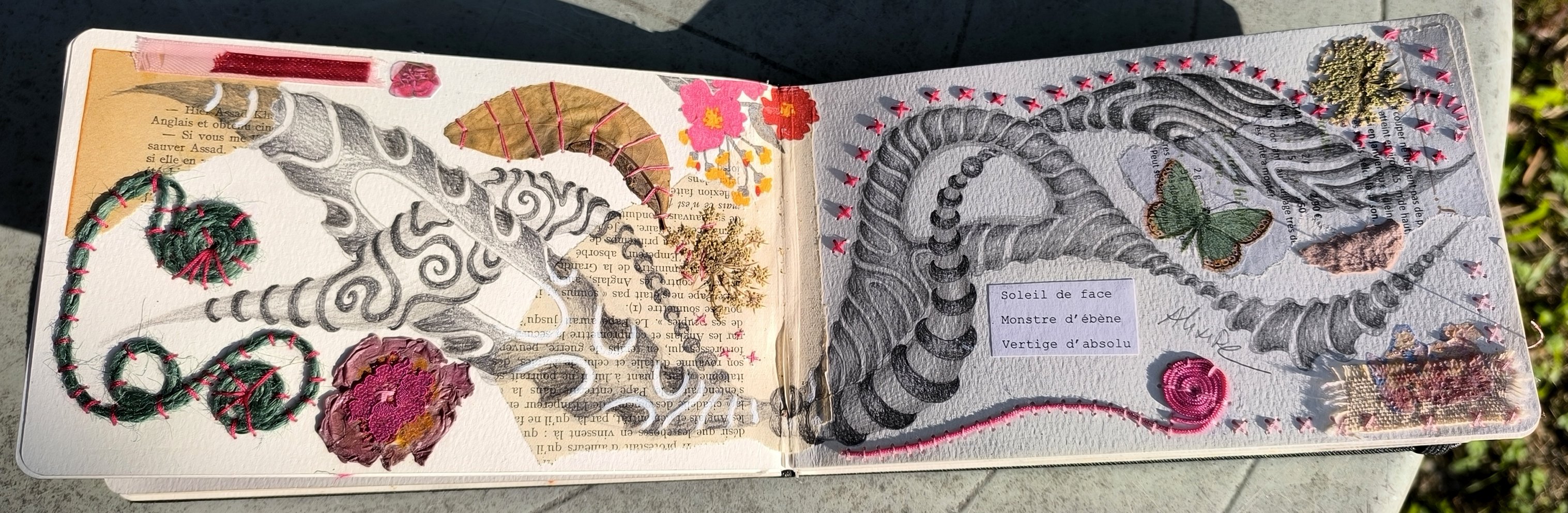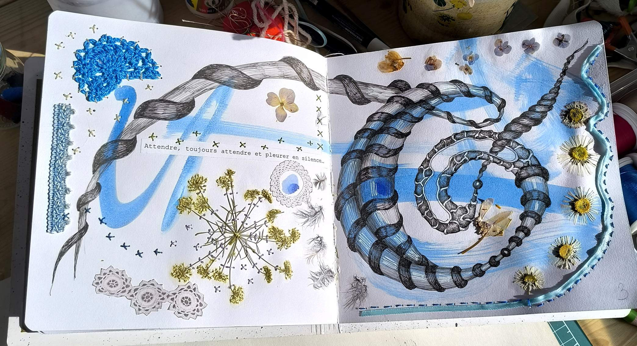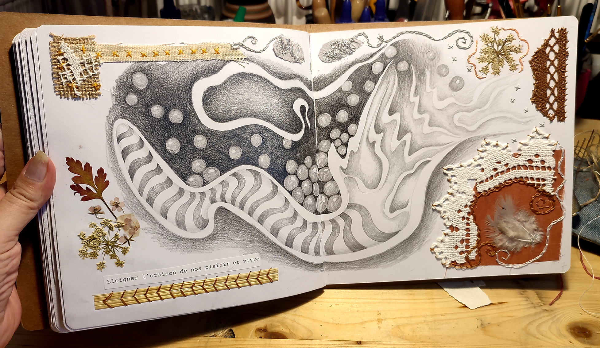 Je transforme un simple carnet trouvé dans le commerce (j’adore les carnets) en une œuvre unique, où chaque page devient un monde à part.