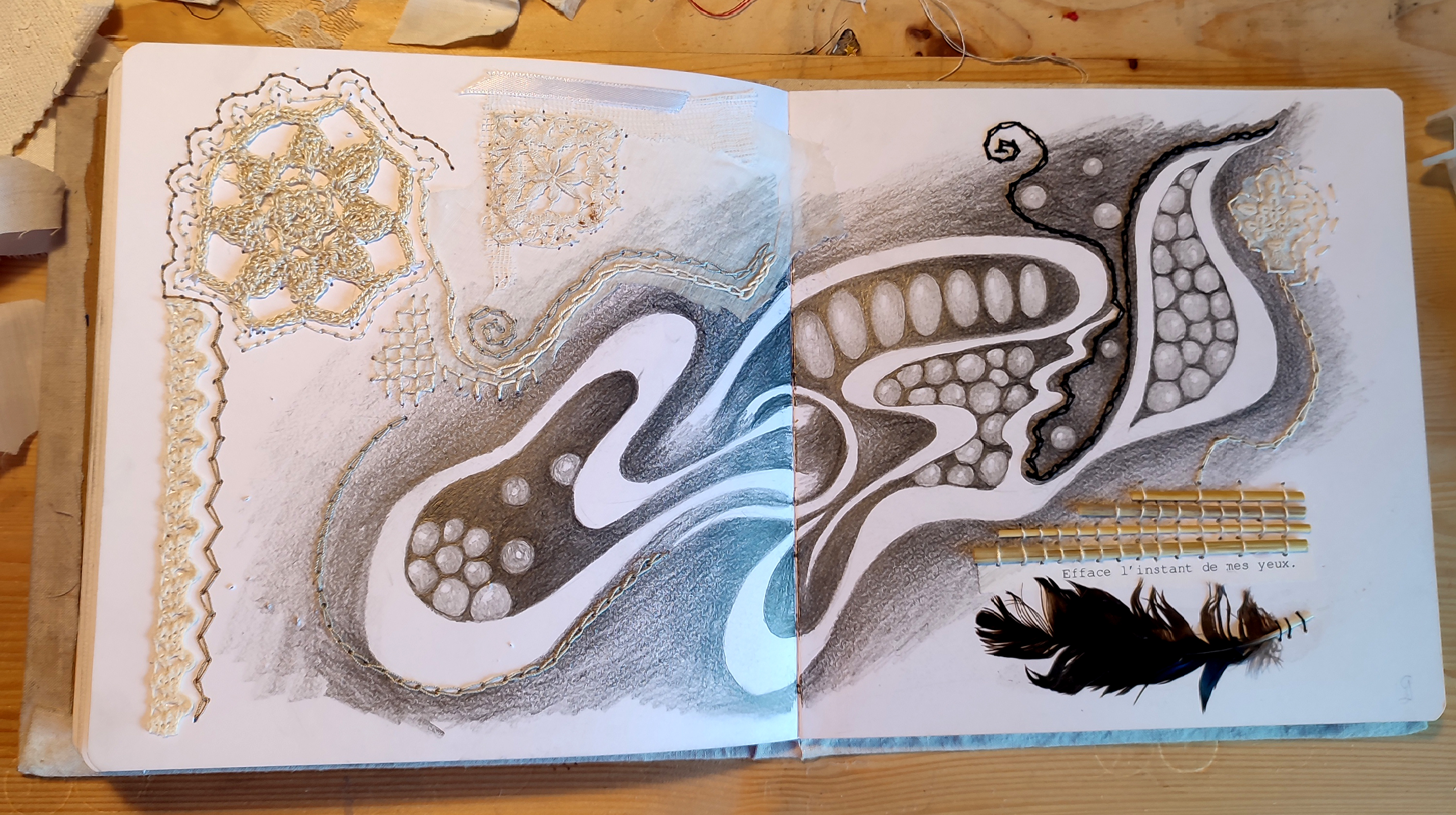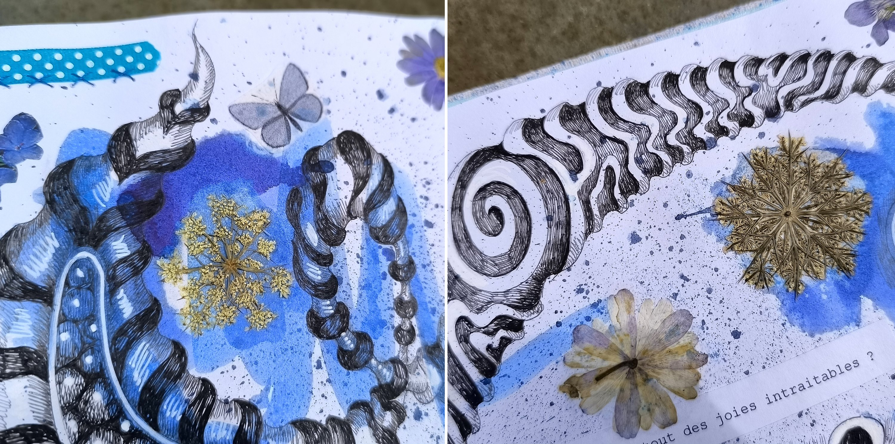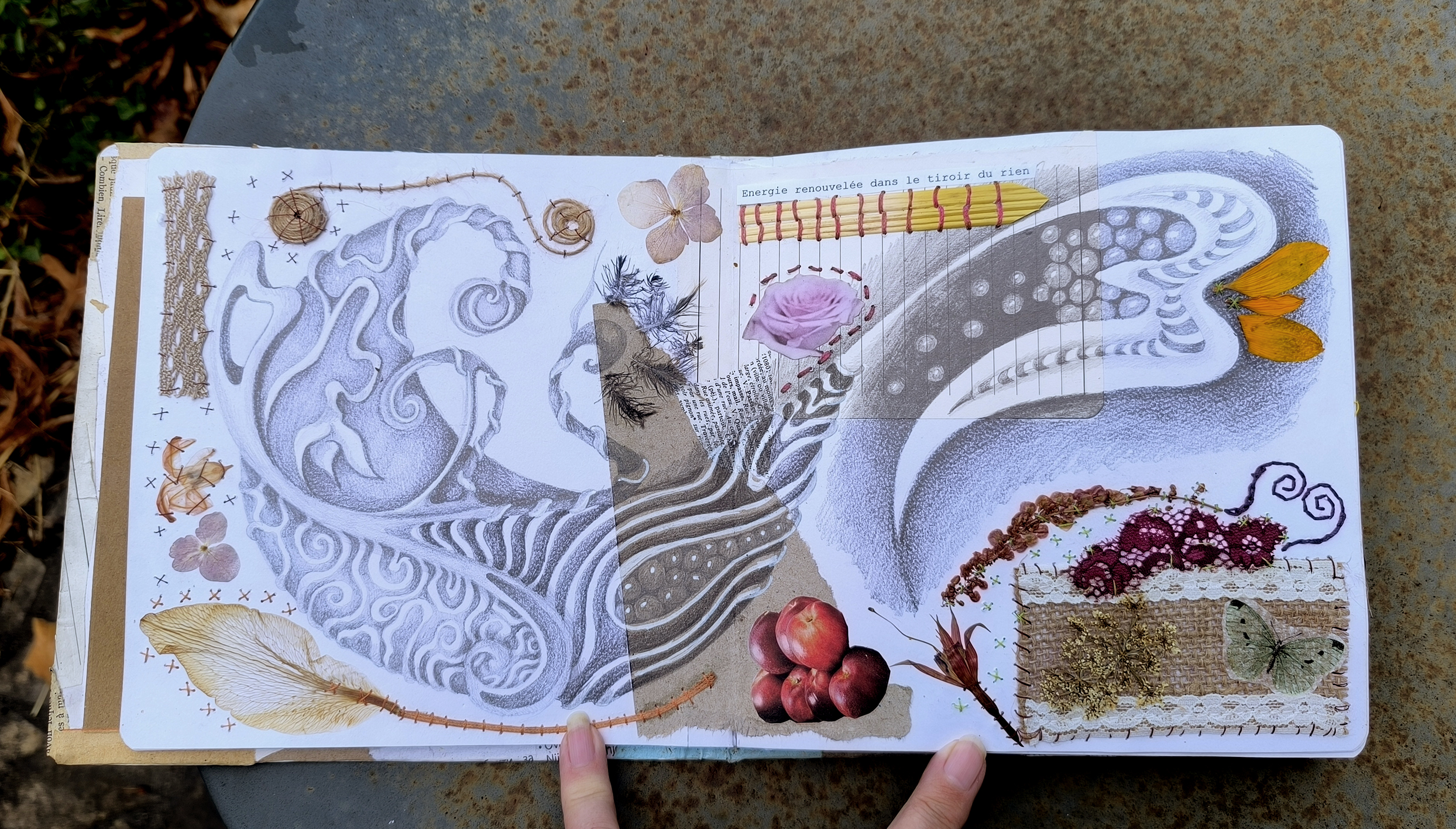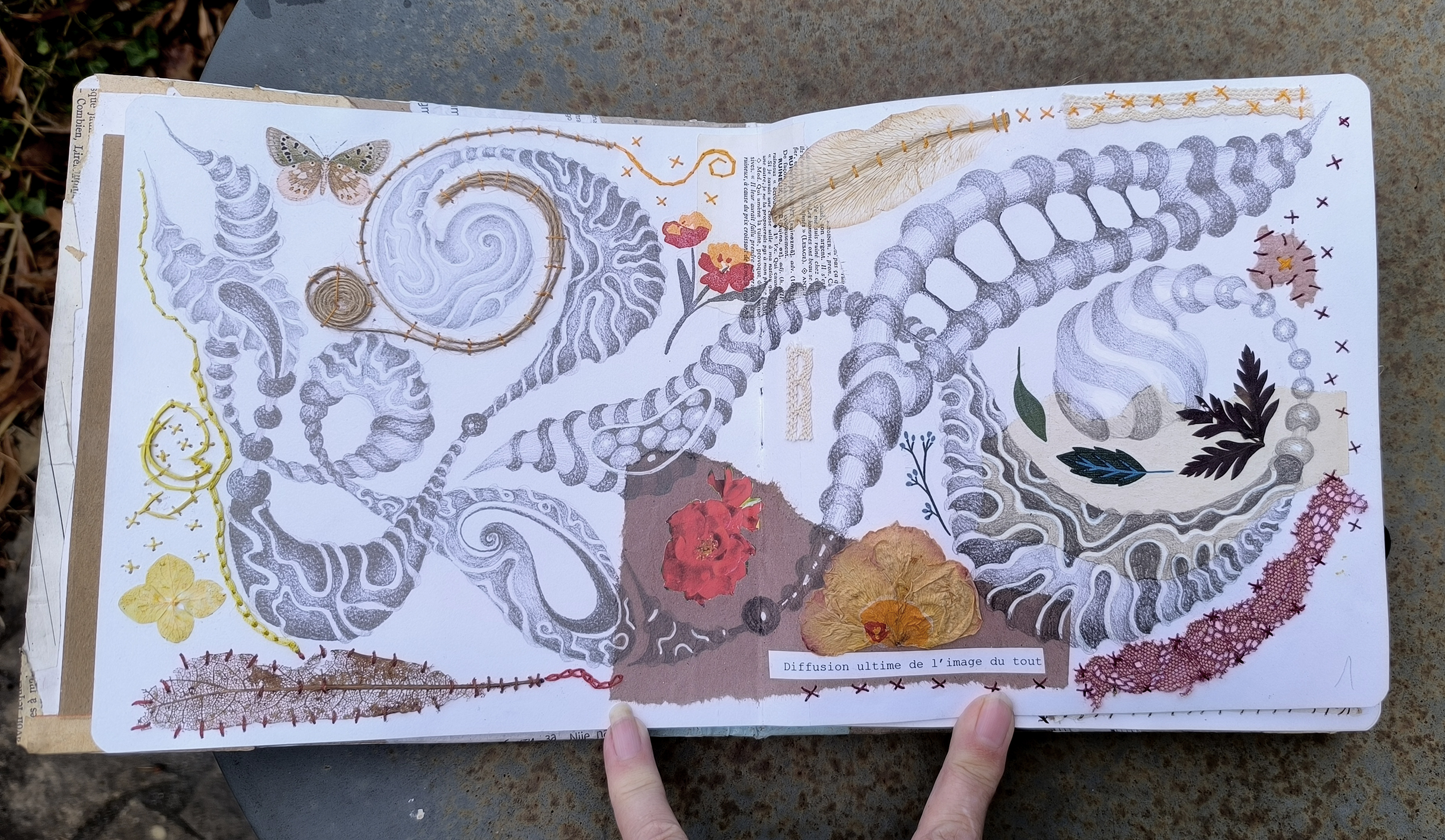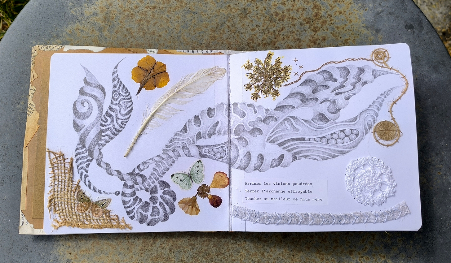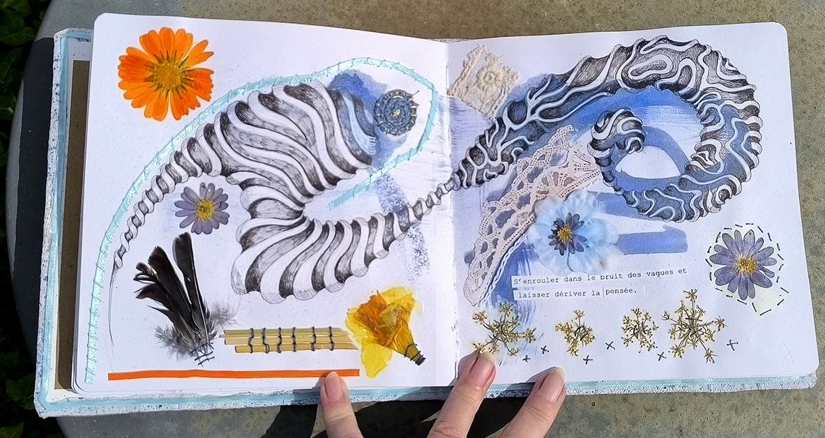 Je transforme un simple carnet trouvé dans le commerce (j’adore les carnets) en une œuvre unique, où chaque page devient un monde à part.