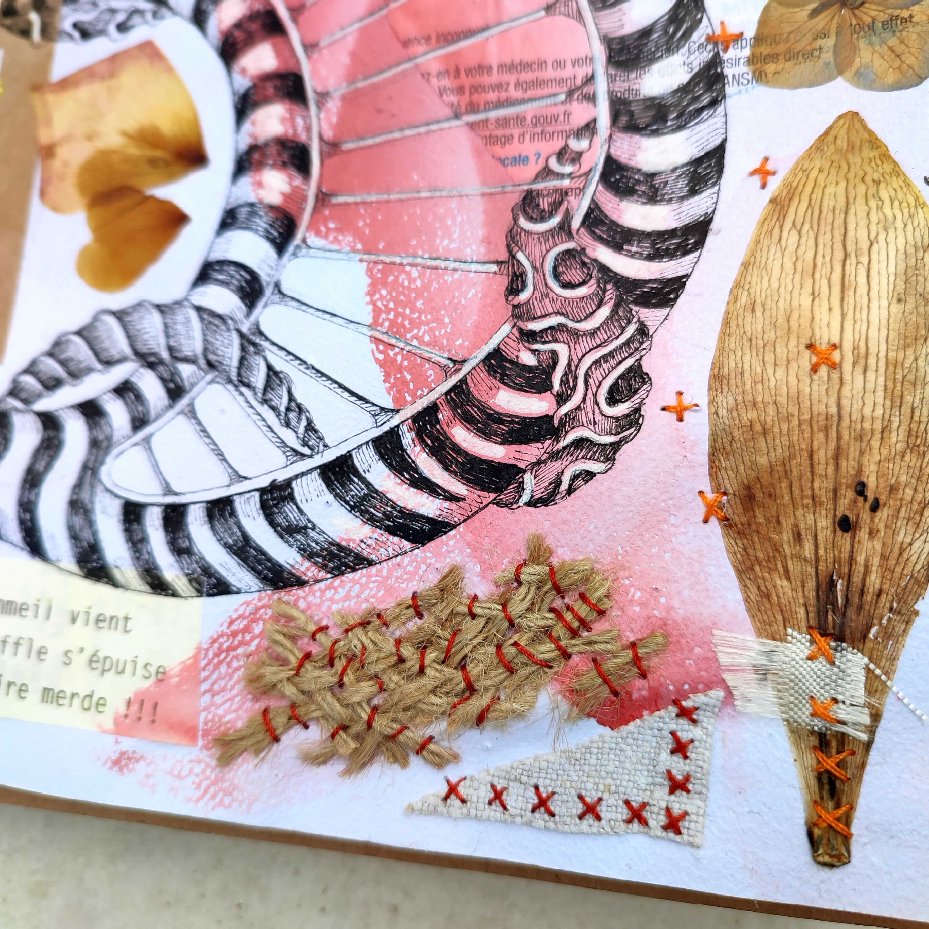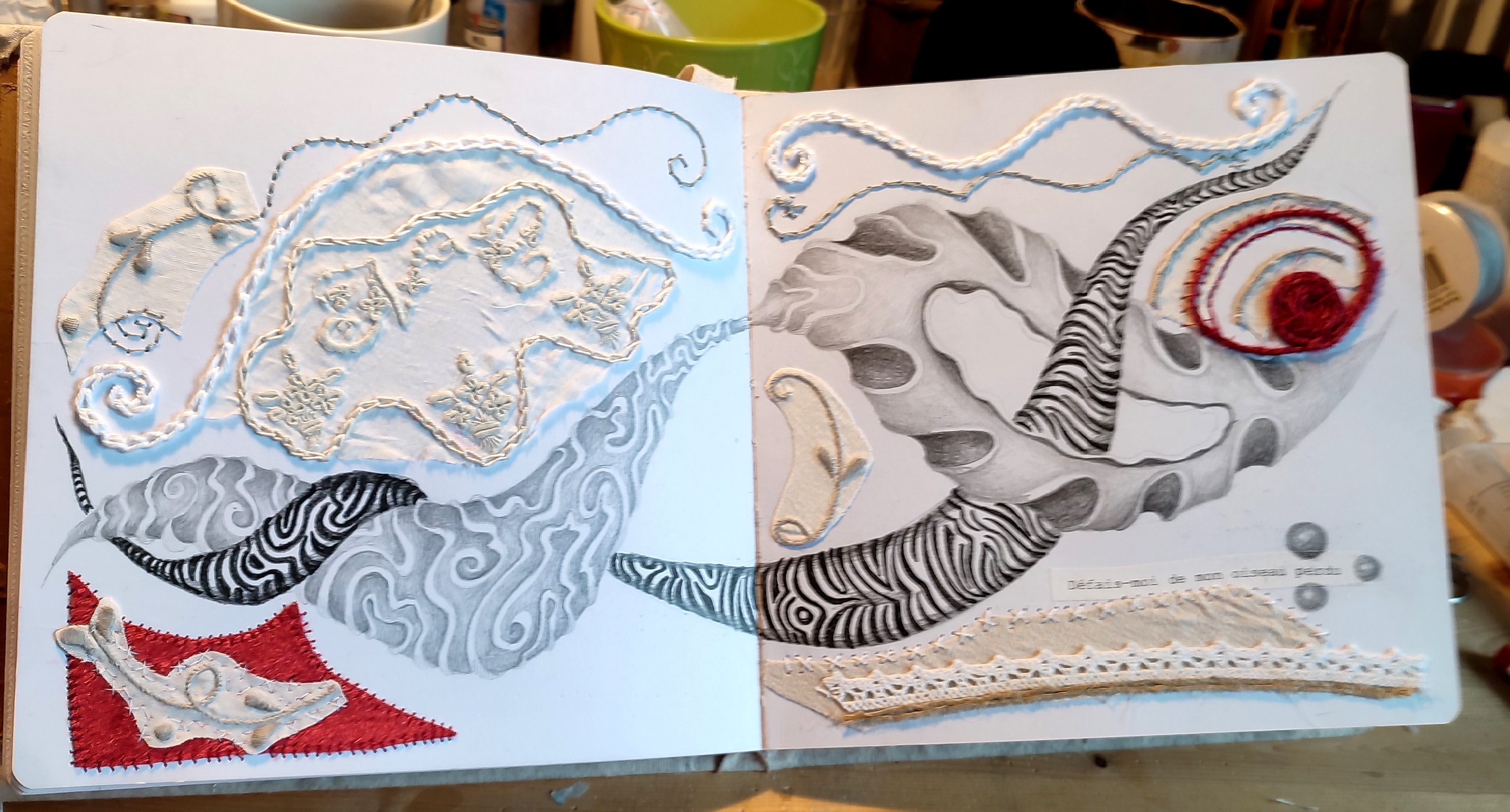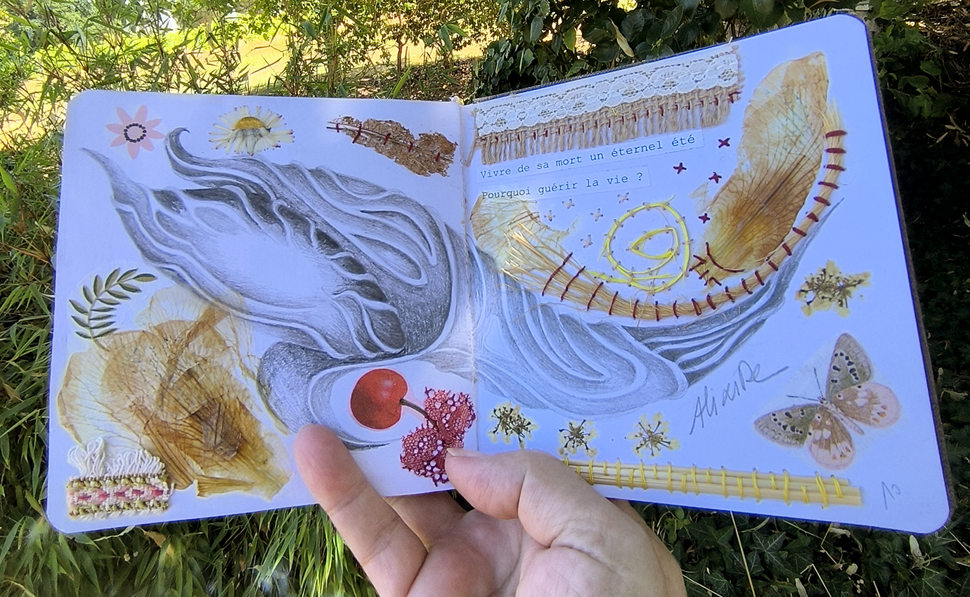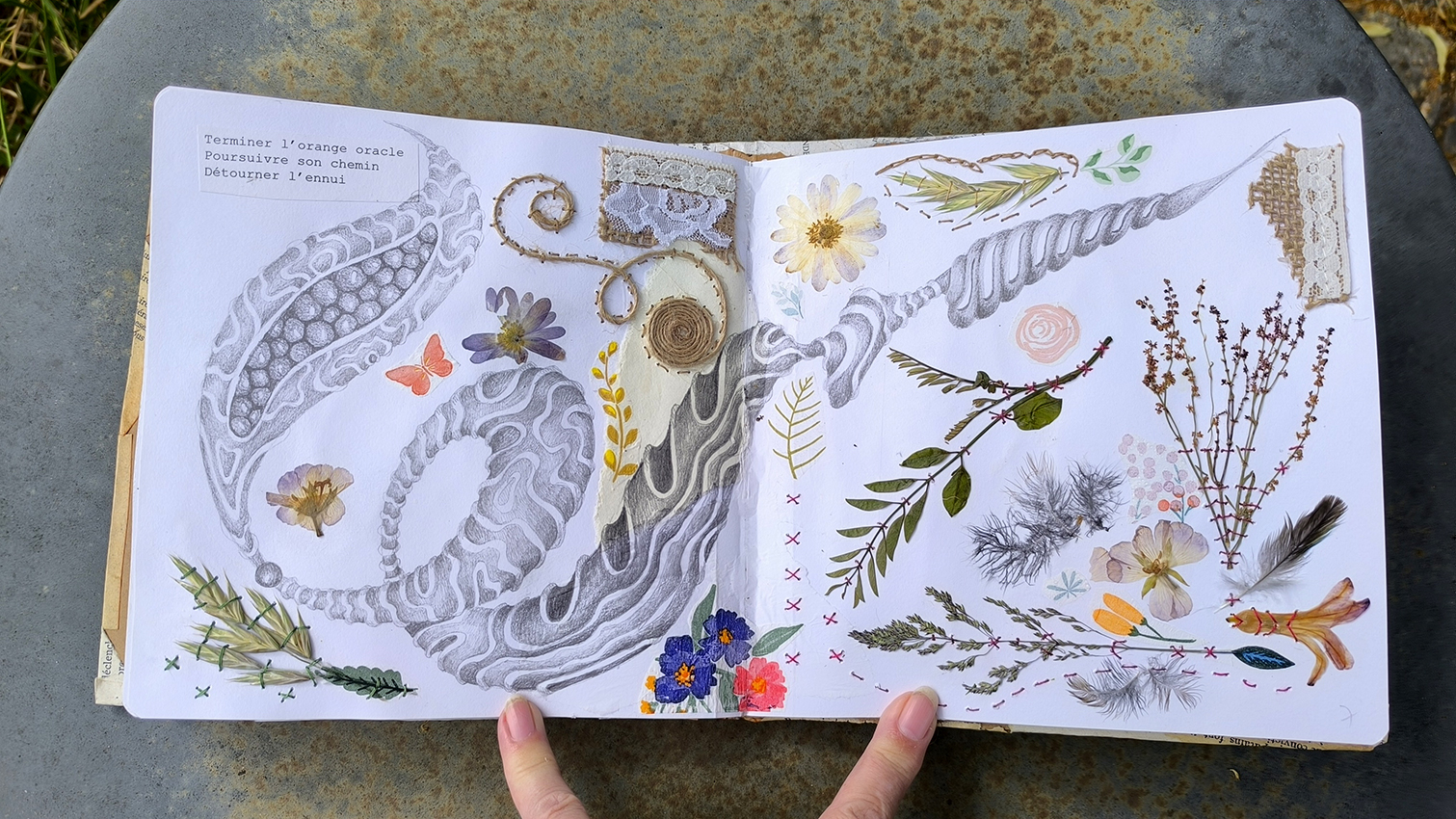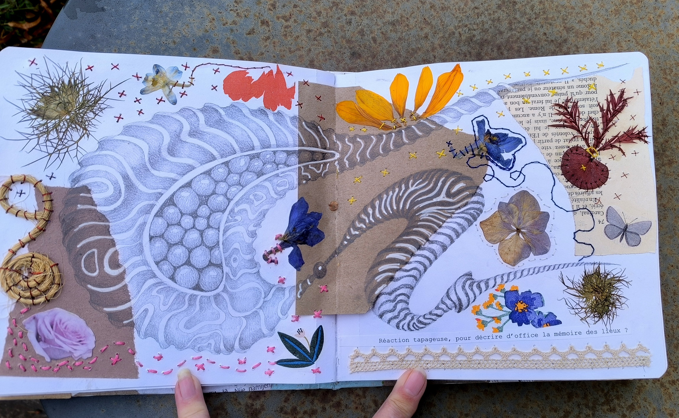 Je transforme un simple carnet trouvé dans le commerce (j’adore les carnets) en une œuvre unique, où chaque page devient un monde à part.