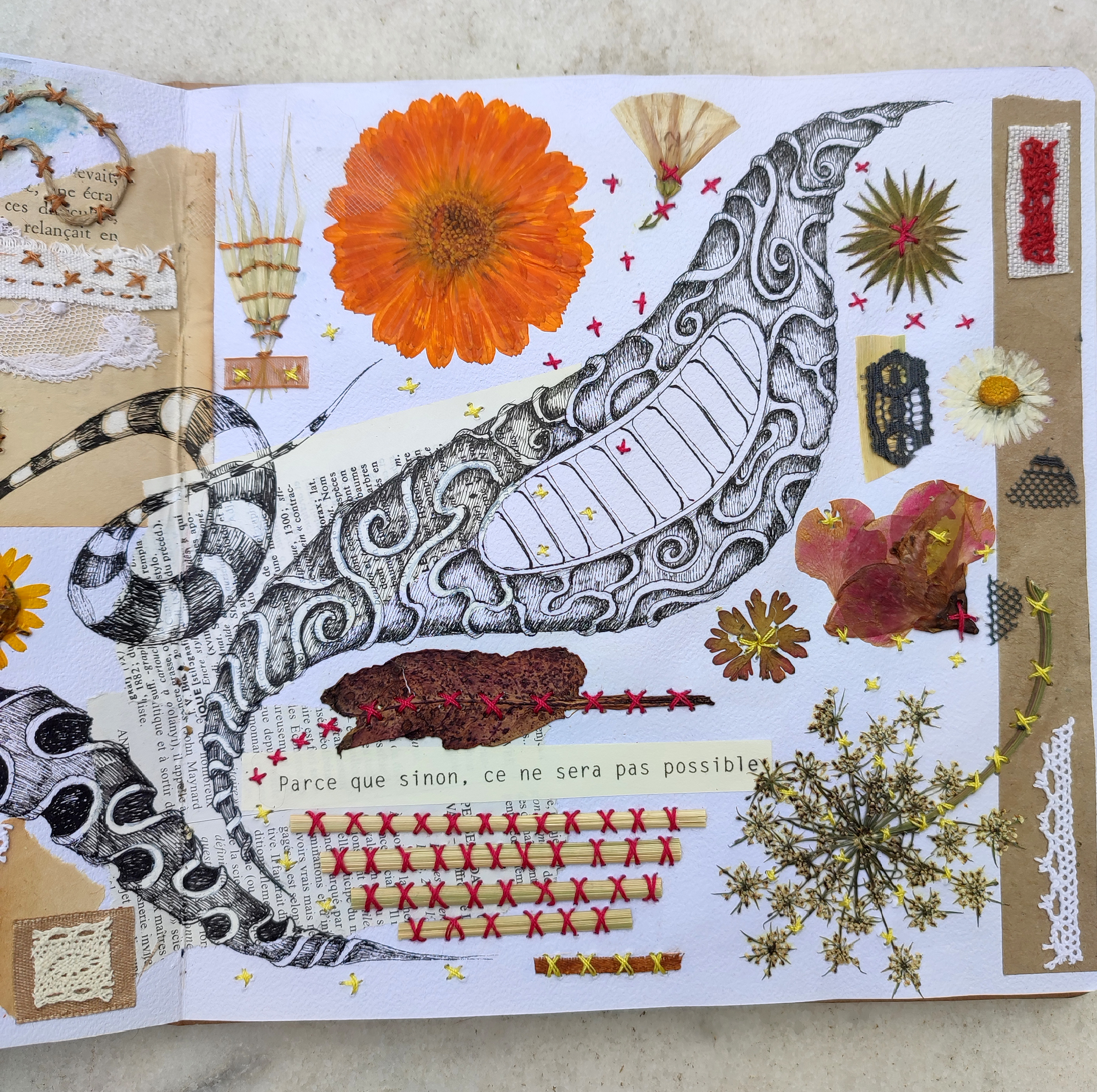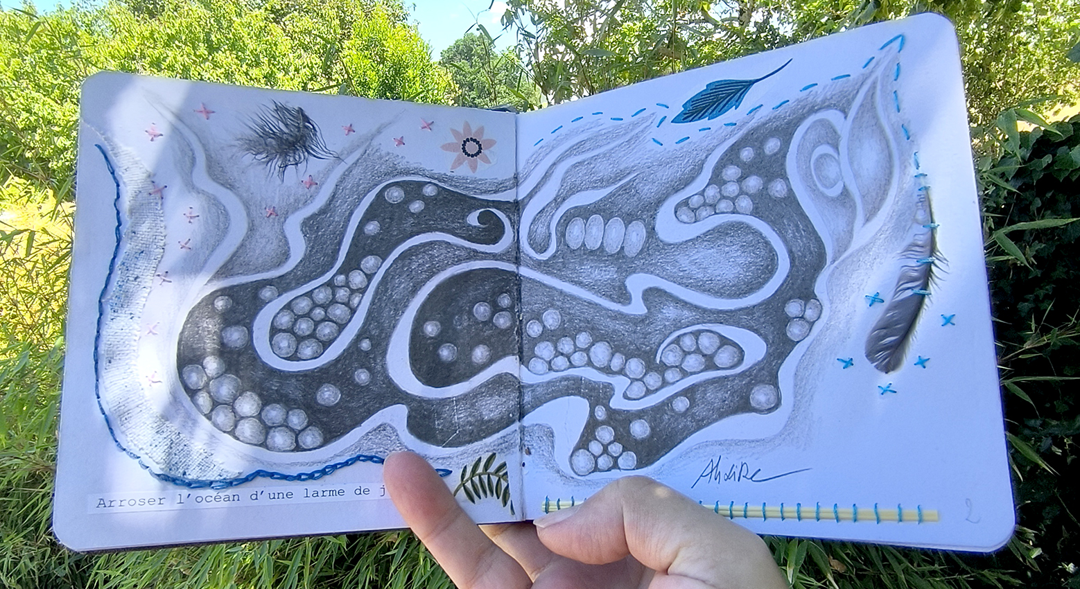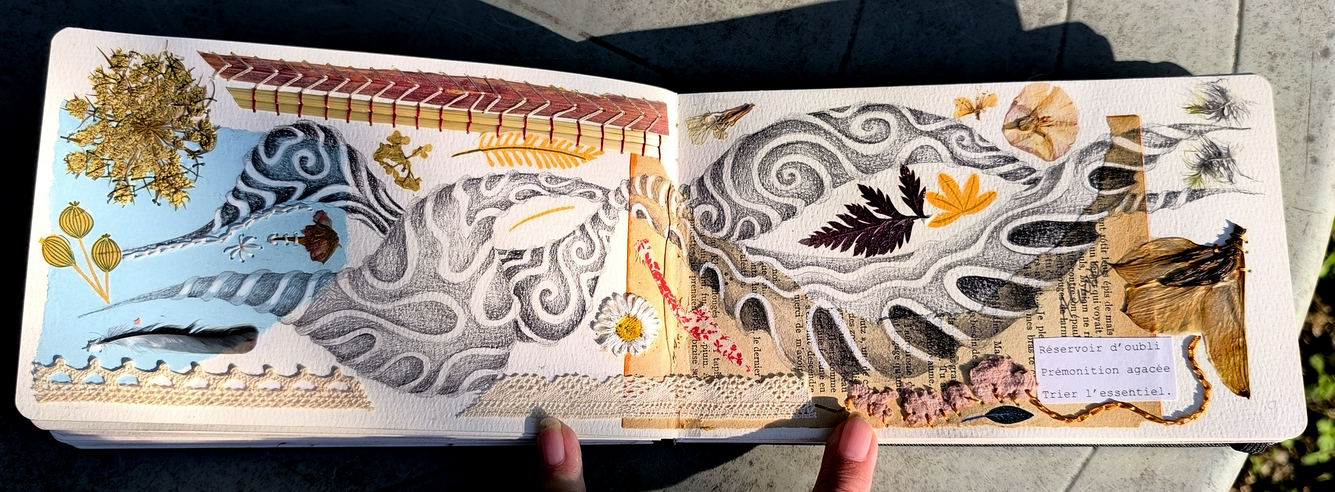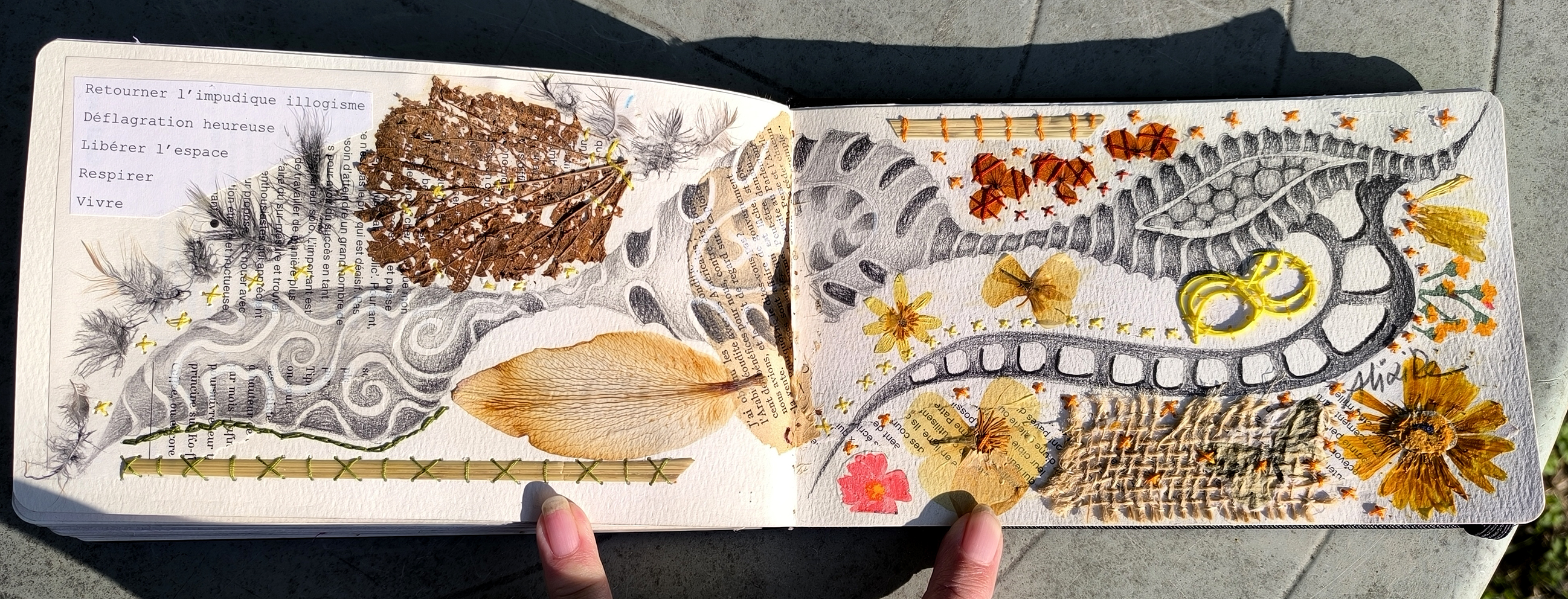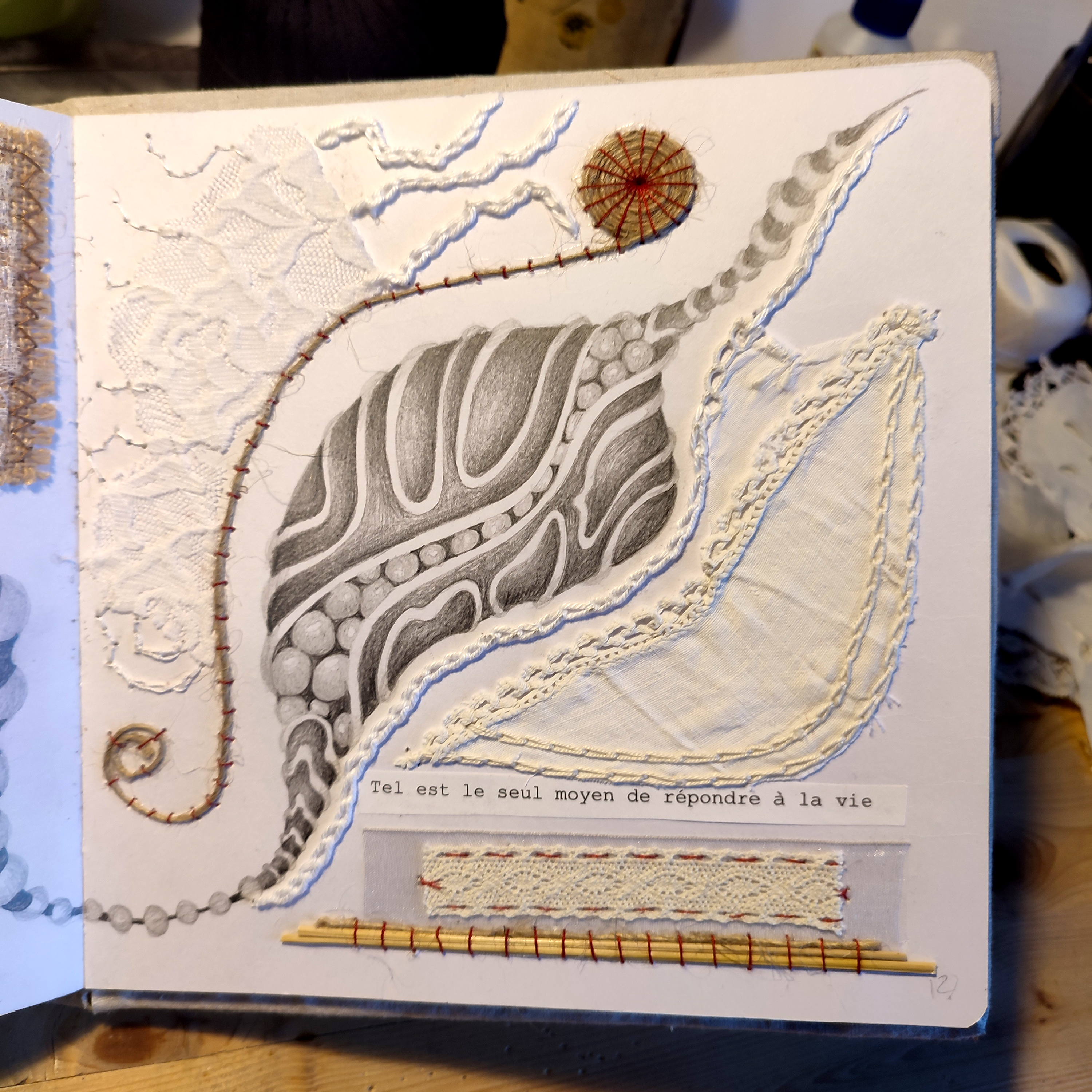 Je transforme un simple carnet trouvé dans le commerce (j’adore les carnets) en une œuvre unique, où chaque page devient un monde à part.