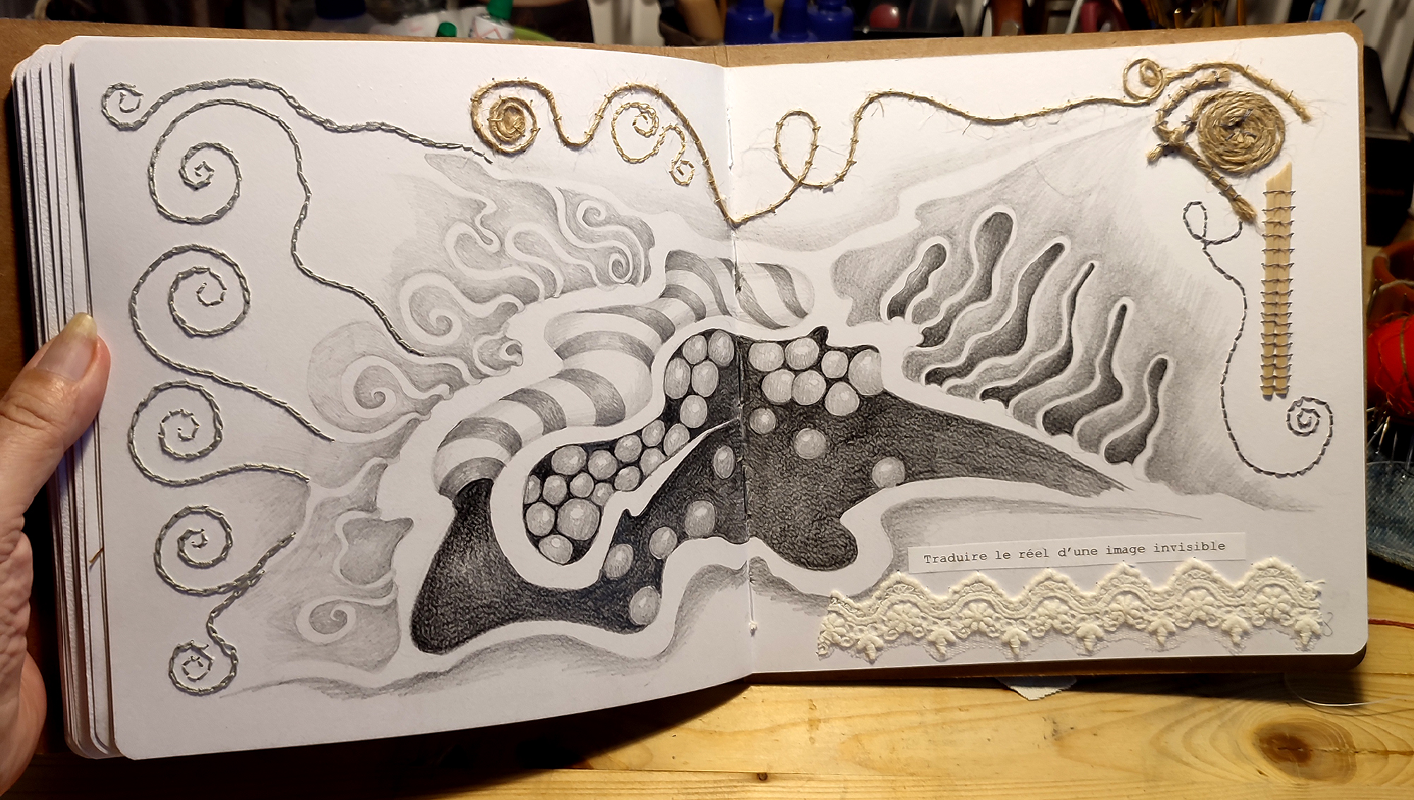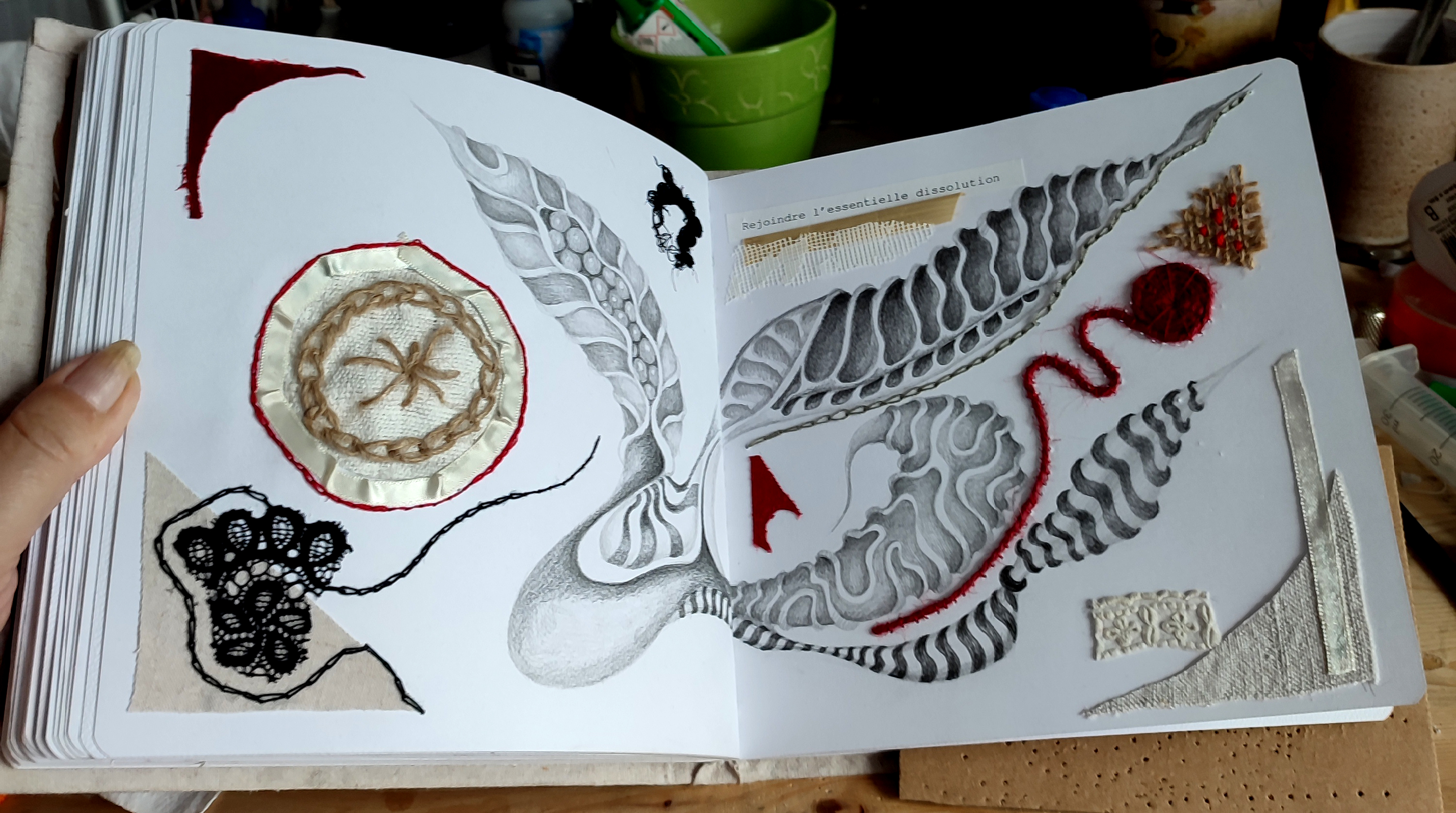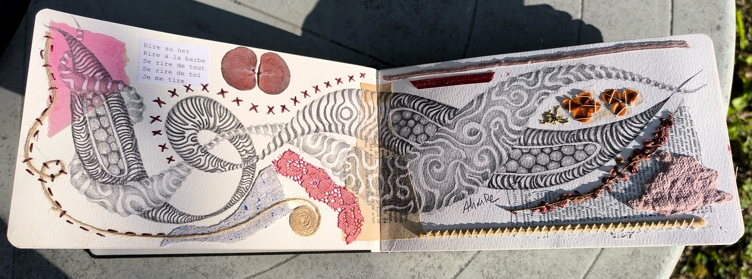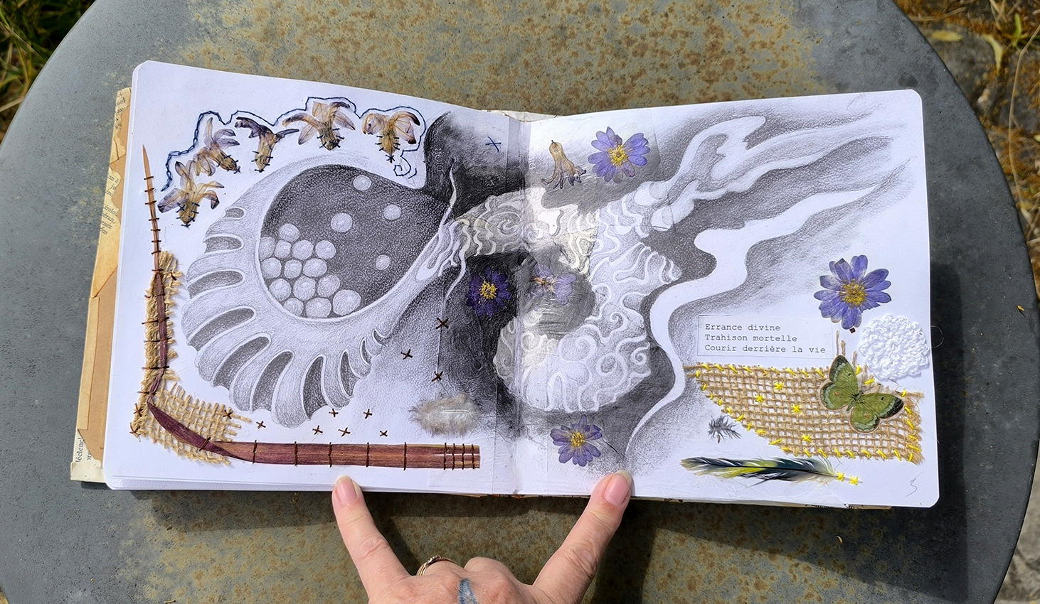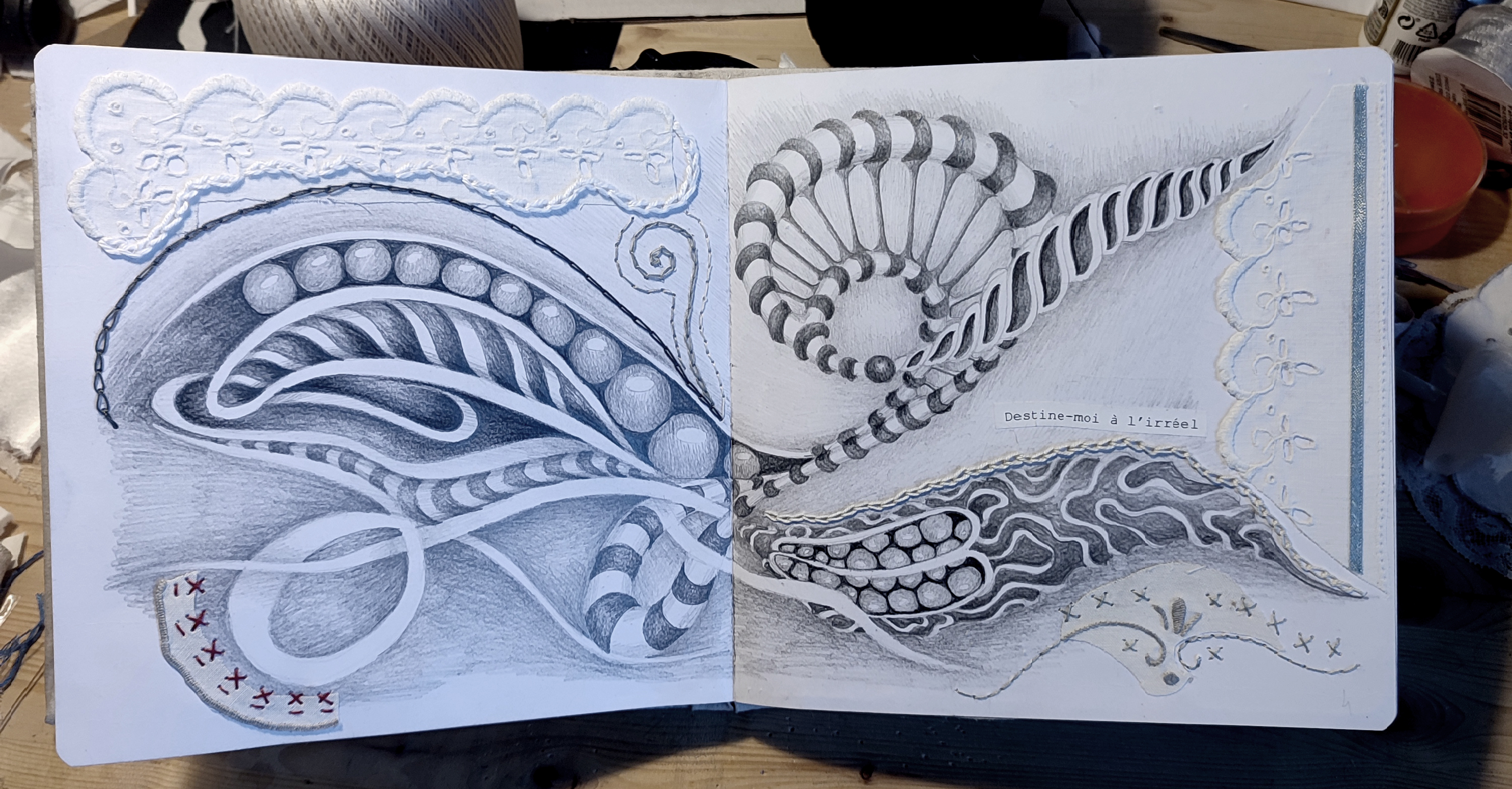 Je transforme un simple carnet trouvé dans le commerce (j’adore les carnets) en une œuvre unique, où chaque page devient un monde à part.