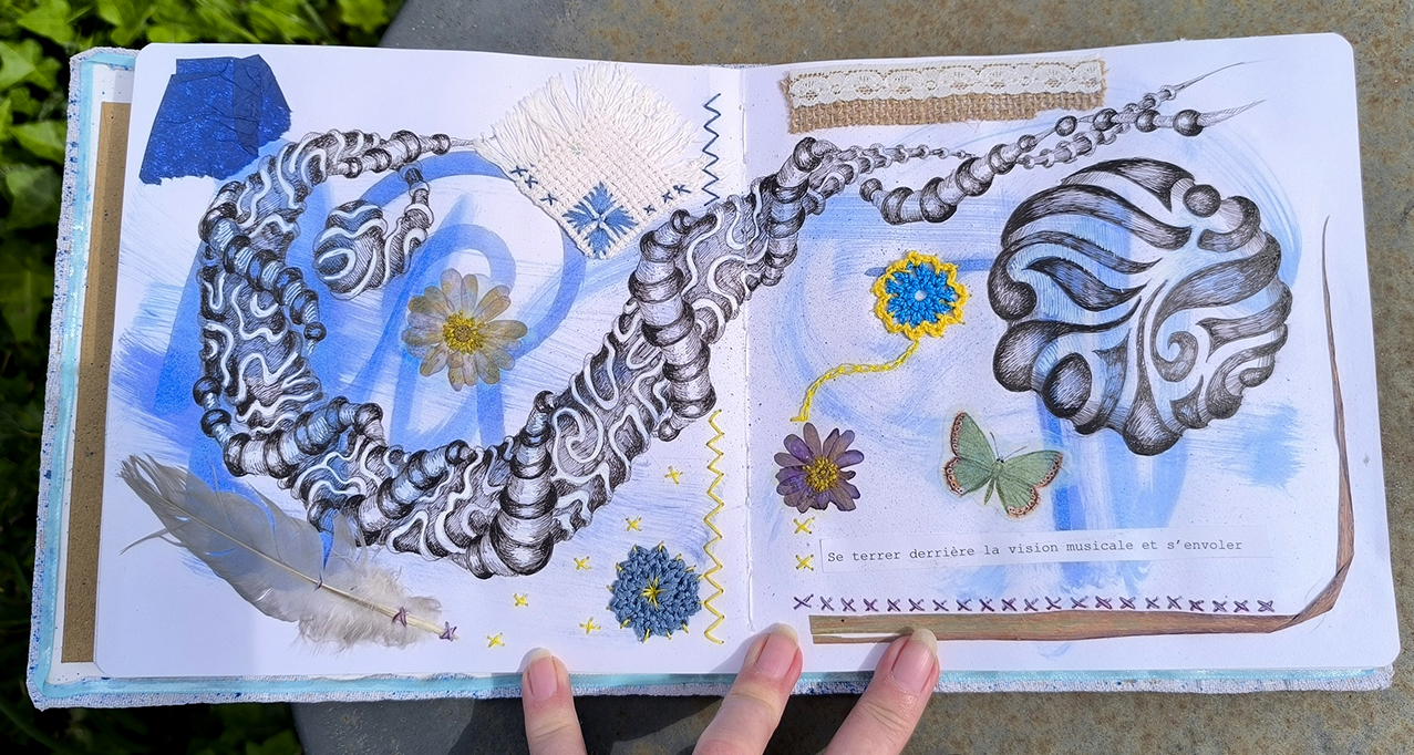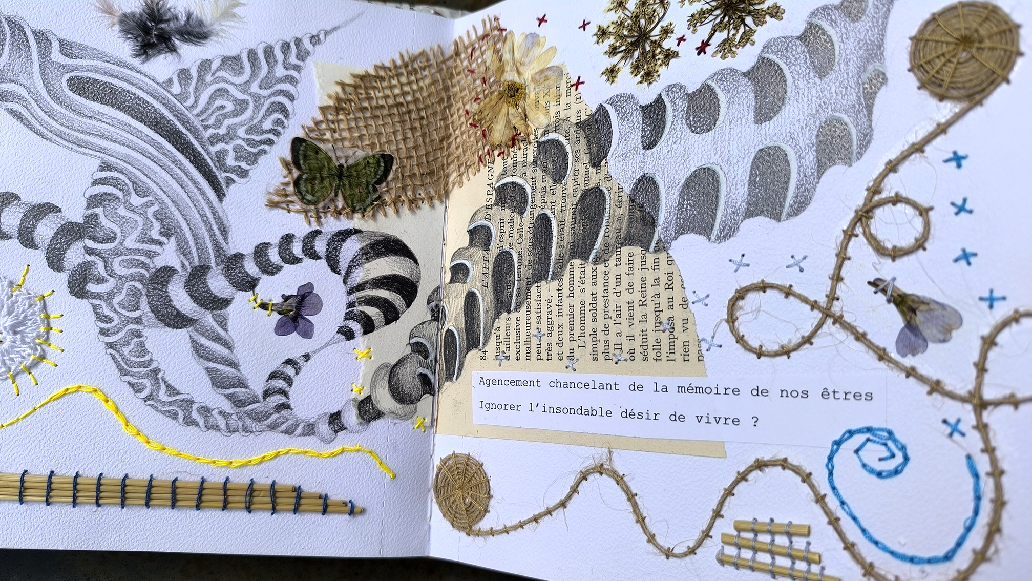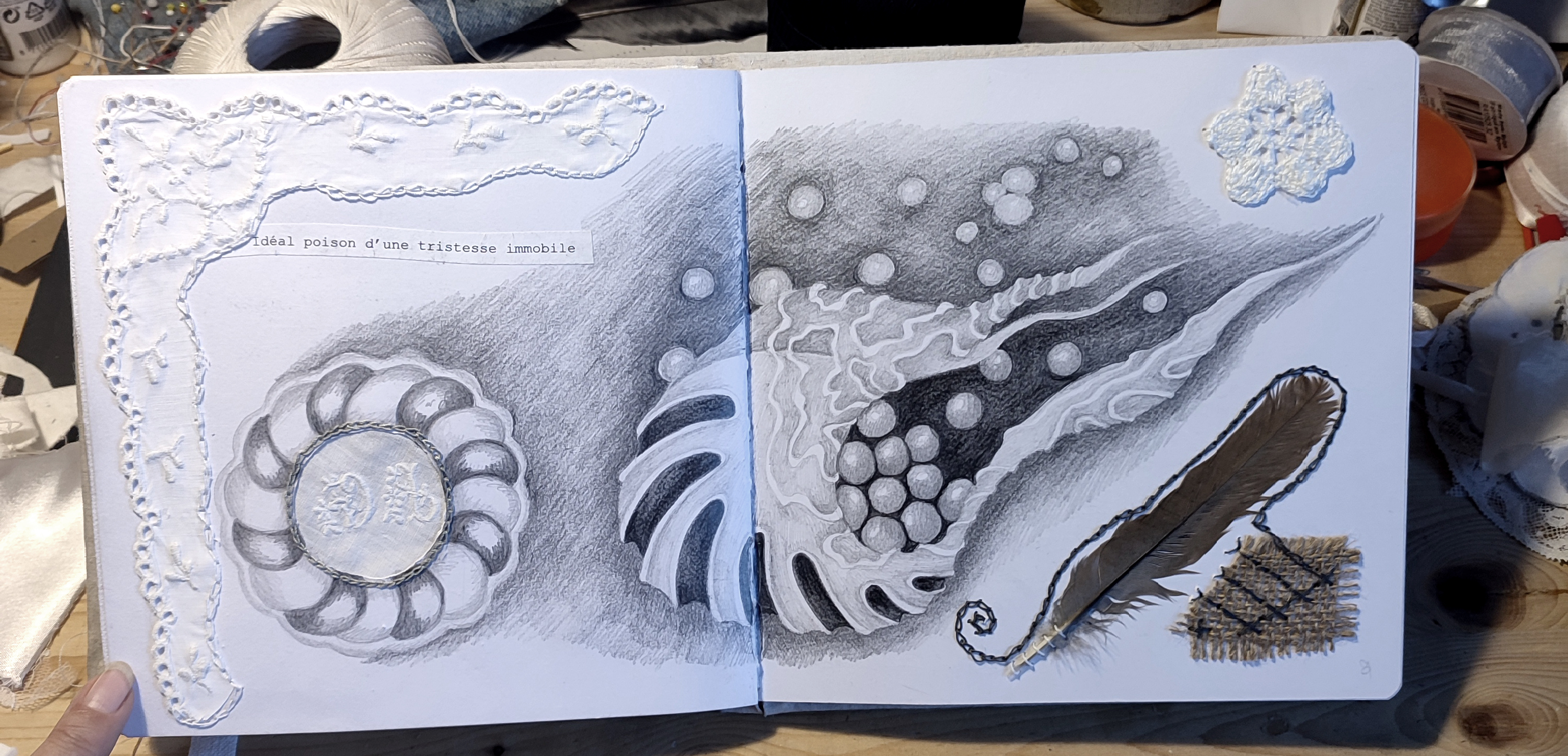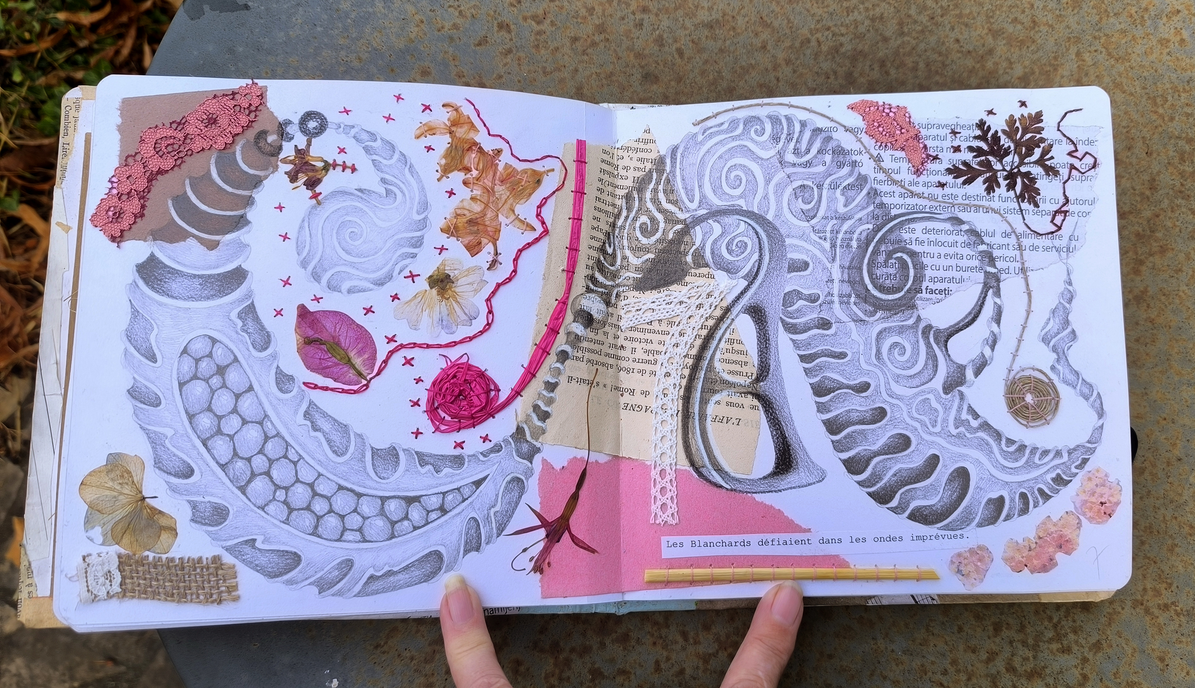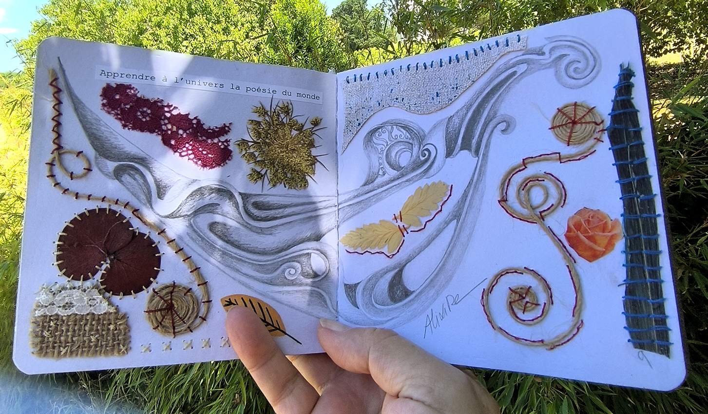 Je transforme un simple carnet trouvé dans le commerce (j’adore les carnets) en une œuvre unique, où chaque page devient un monde à part.