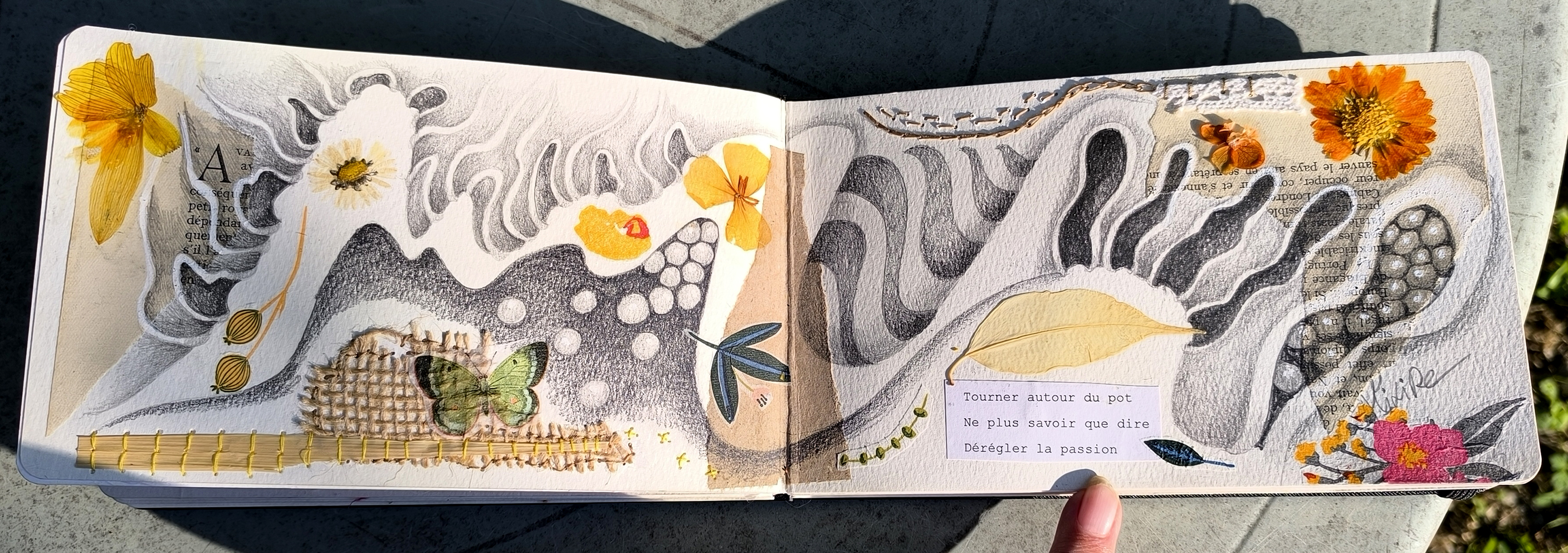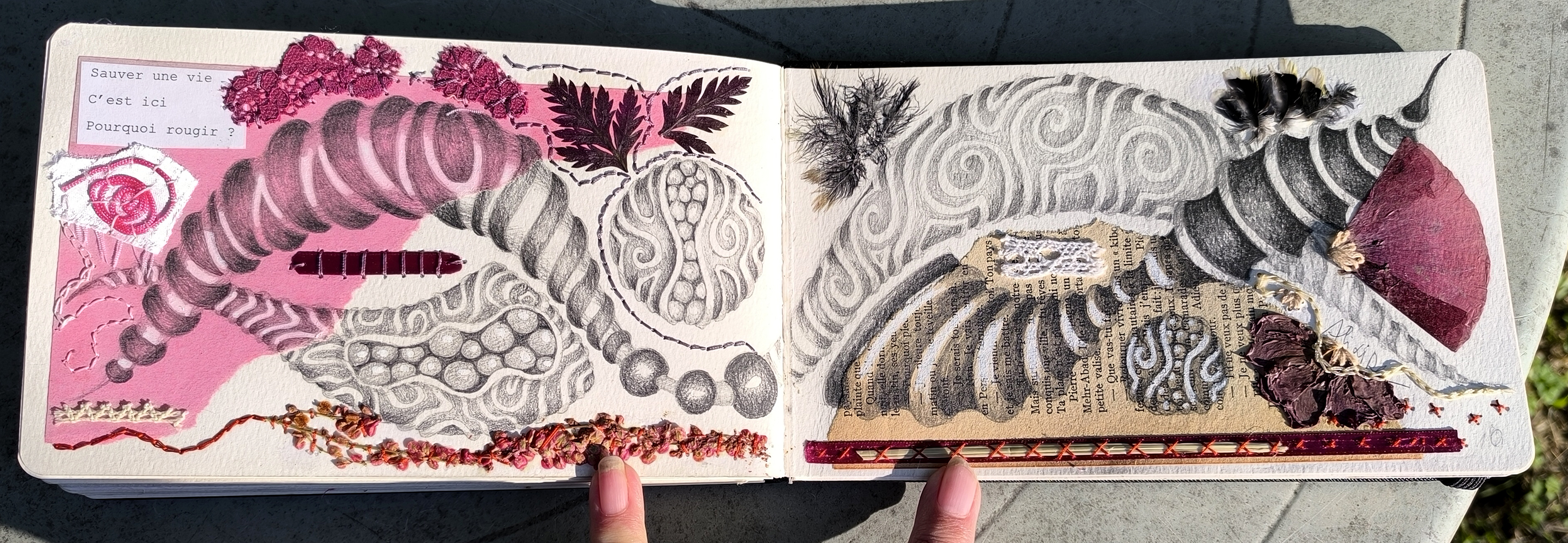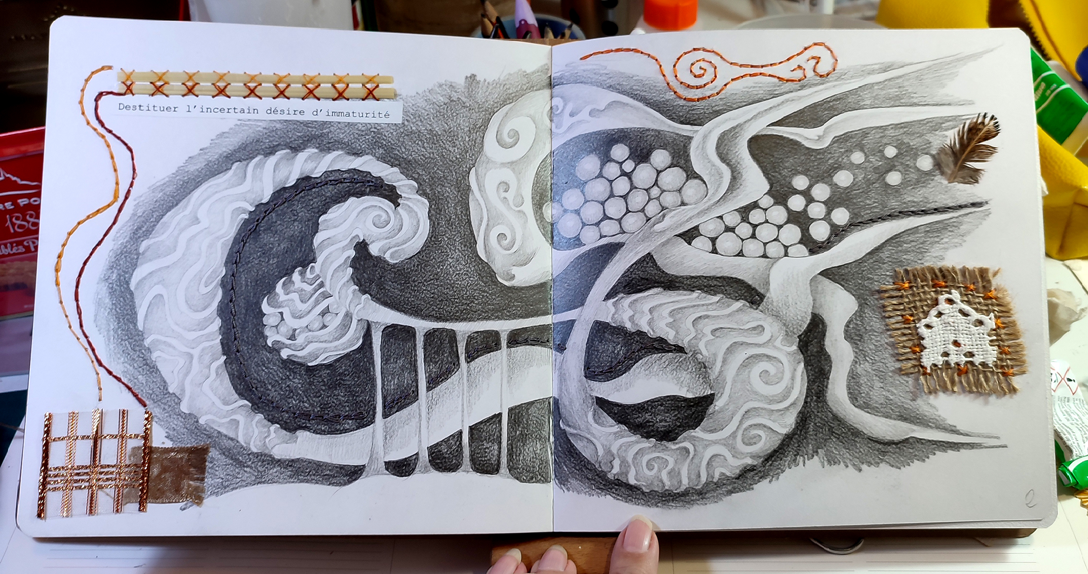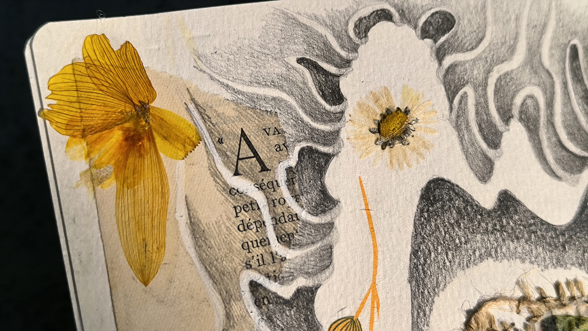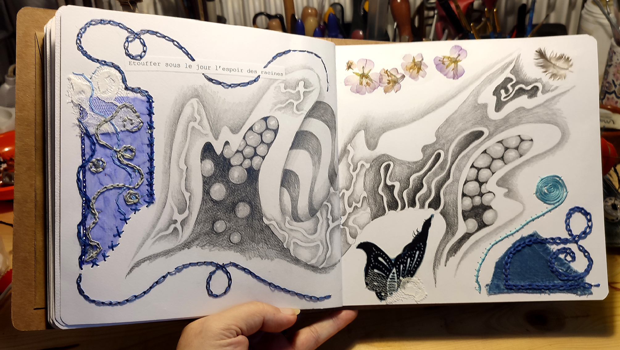 Je transforme un simple carnet trouvé dans le commerce (j’adore les carnets) en une œuvre unique, où chaque page devient un monde à part.