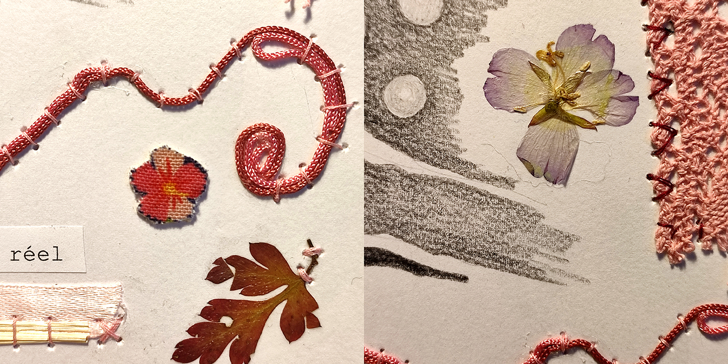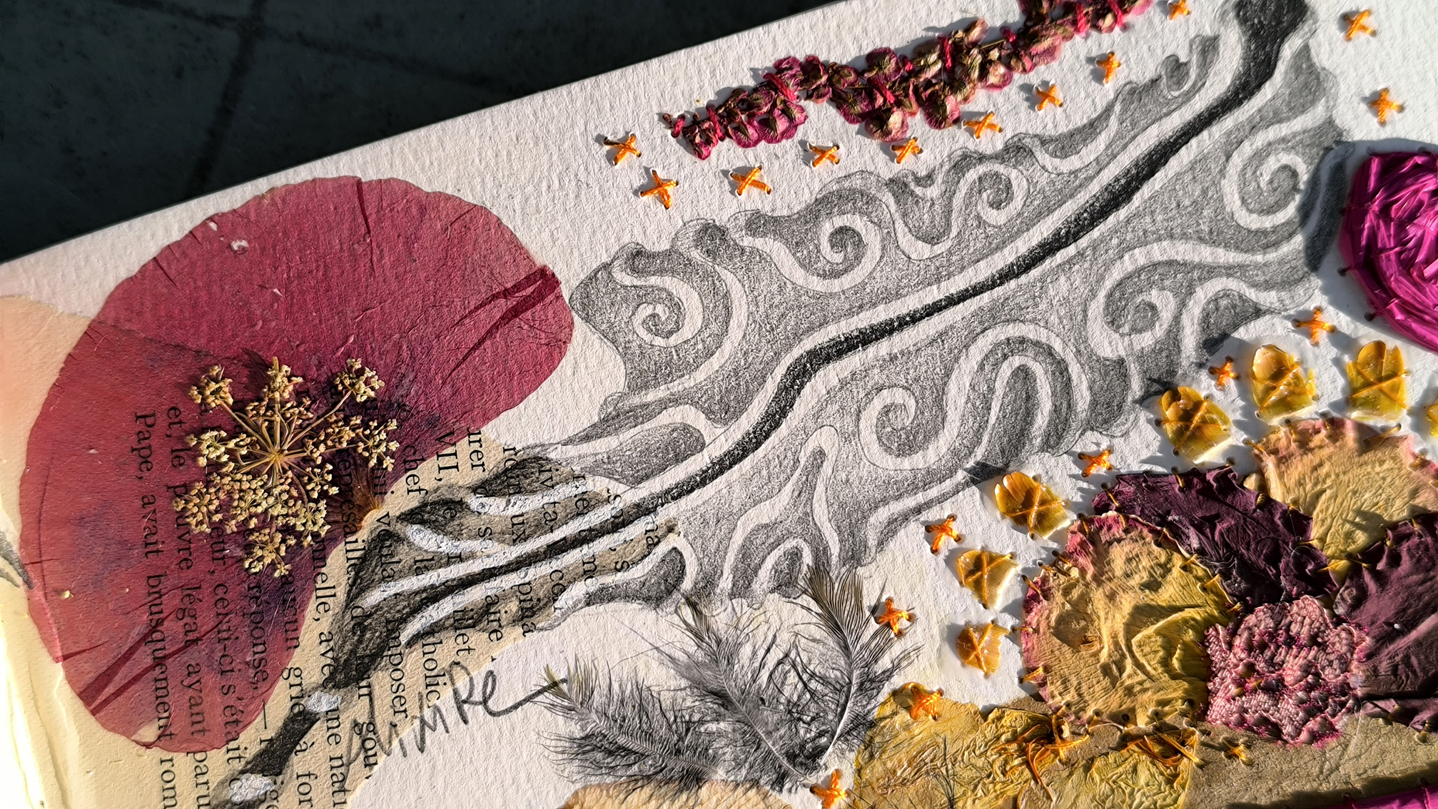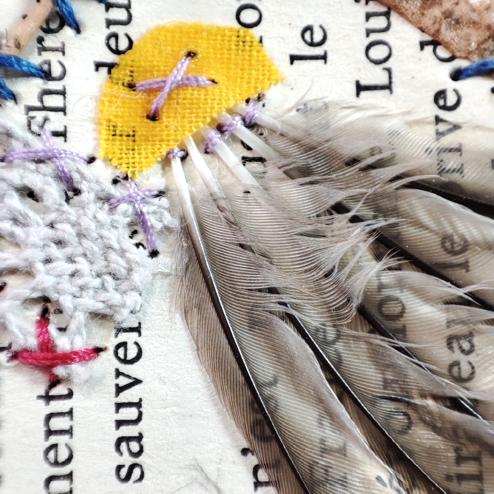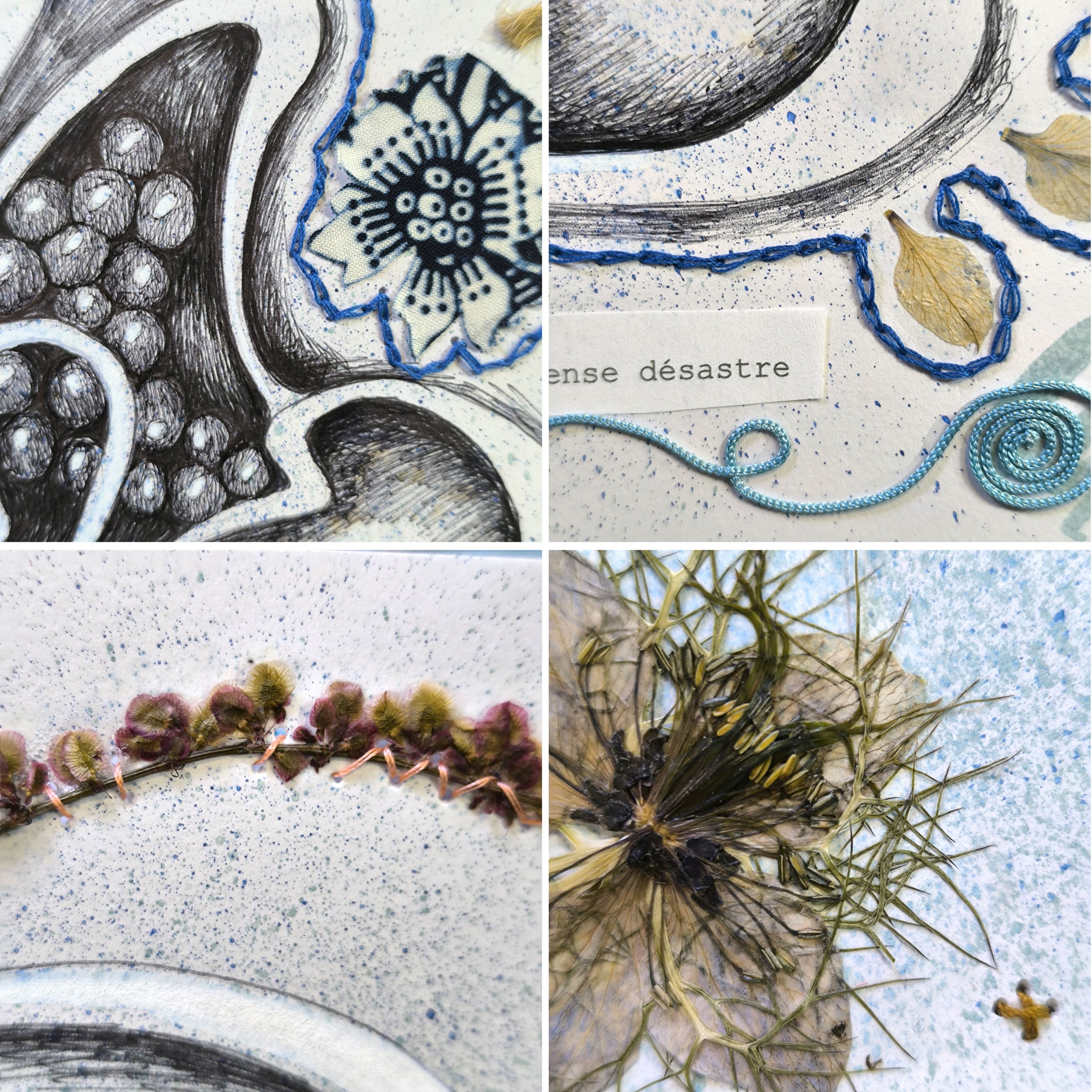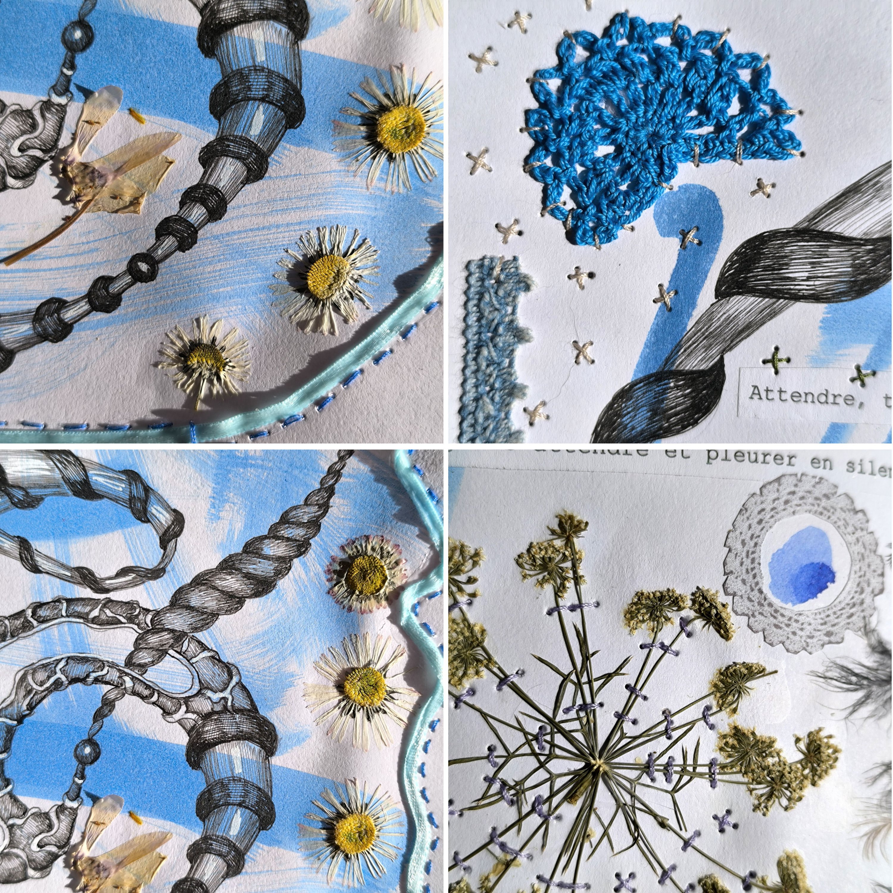 Je colle ensuite mille merveilles infimes, glanées ou conservées, naturelles ou fabriquées : fleurs, feuilles, plumes, vrilles de vigne, graminées, fougères, ficelles, dentelles, rubans, tissus… Chaque élément se mêle aux autres pour créer un univers foisonnant et fragile.