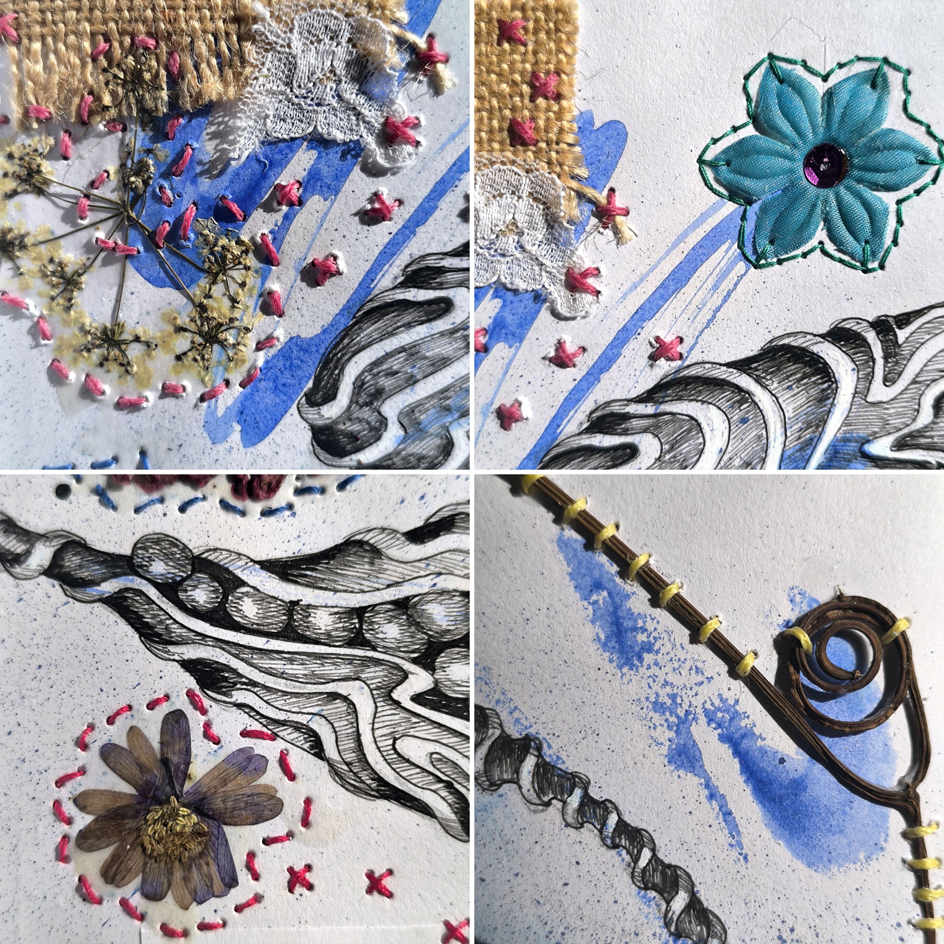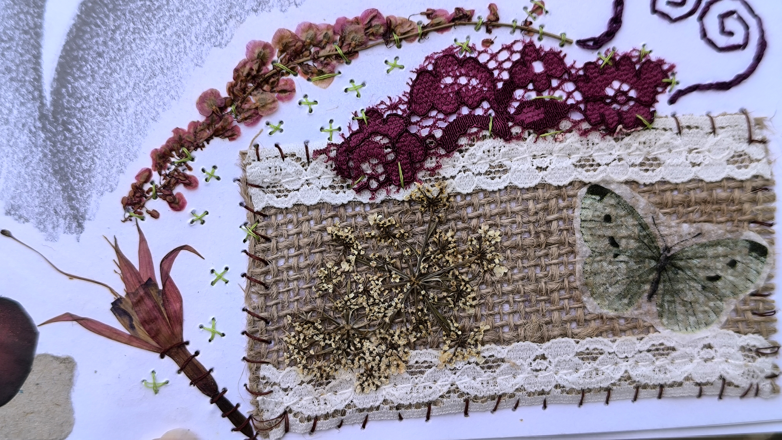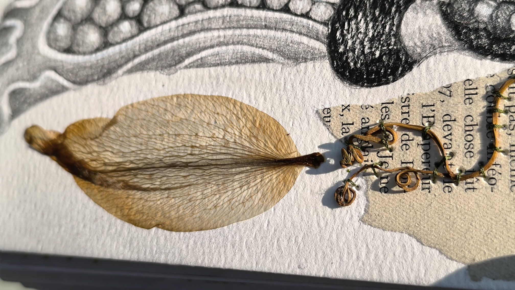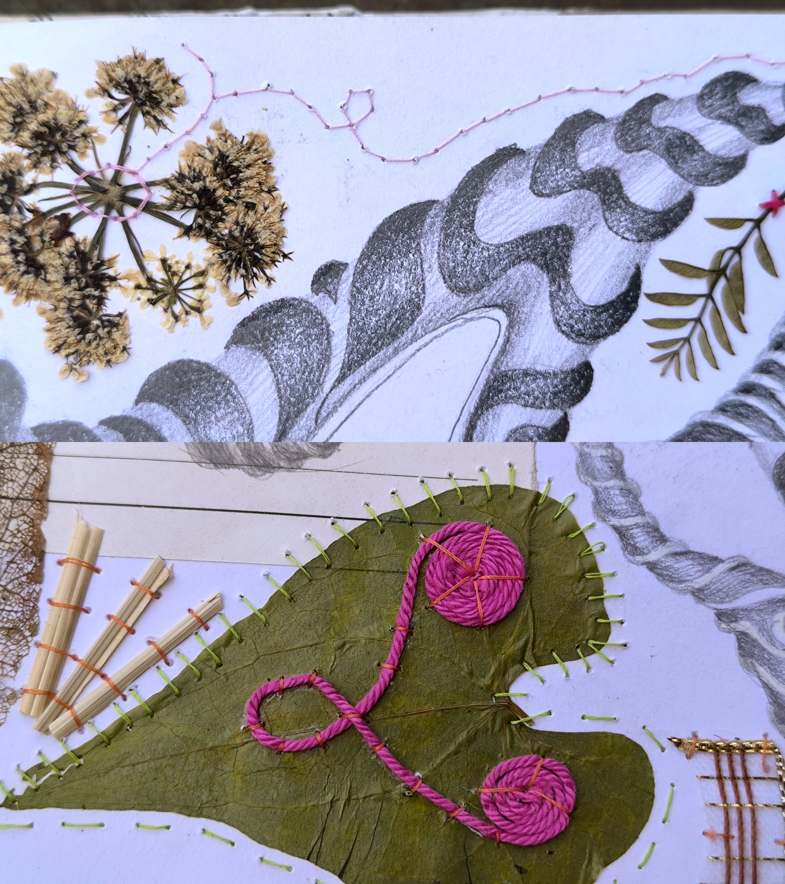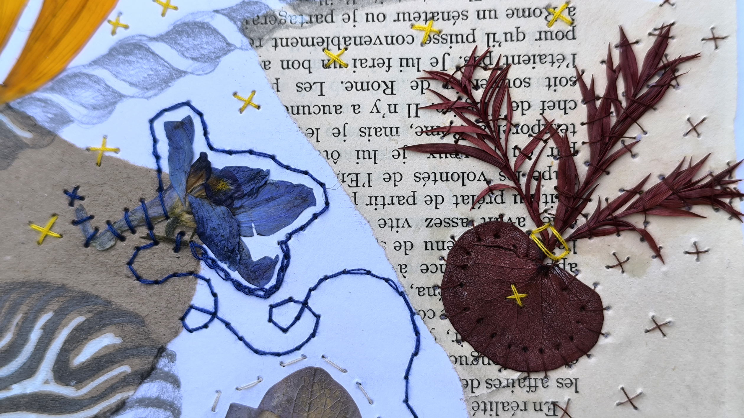 Je colle ensuite mille merveilles infimes, glanées ou conservées, naturelles ou fabriquées : fleurs, feuilles, plumes, vrilles de vigne, graminées, fougères, ficelles, dentelles, rubans, tissus… Chaque élément se mêle aux autres pour créer un univers foisonnant et fragile.