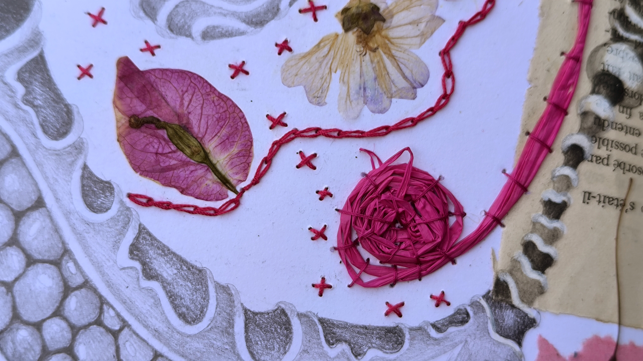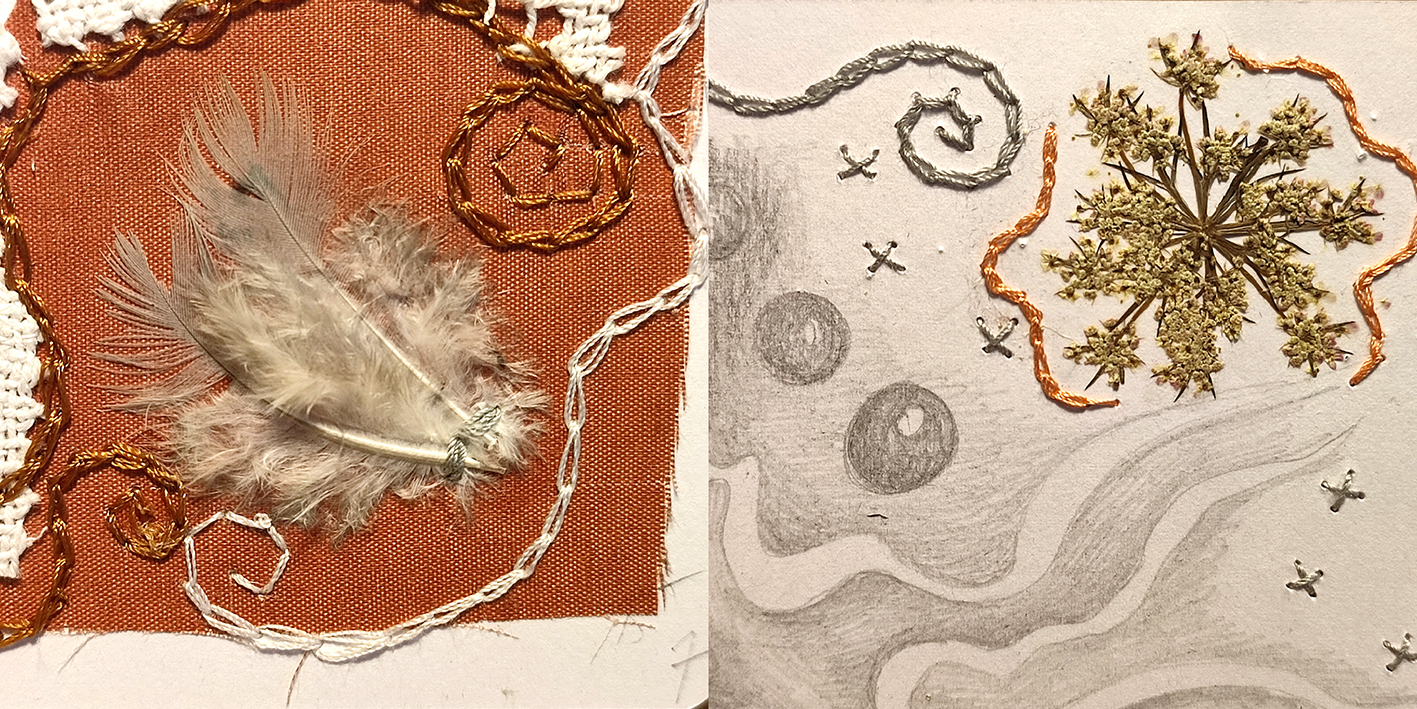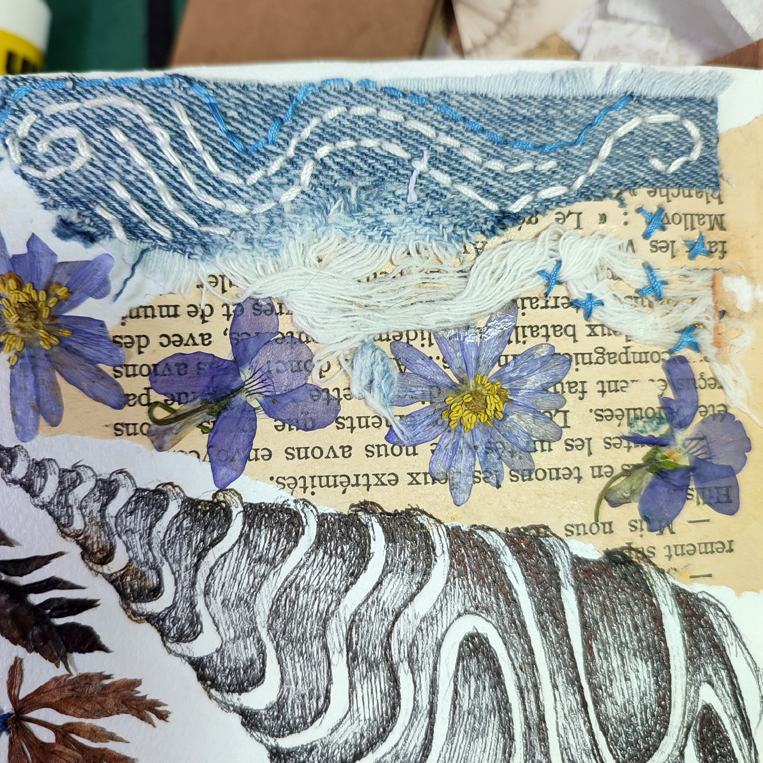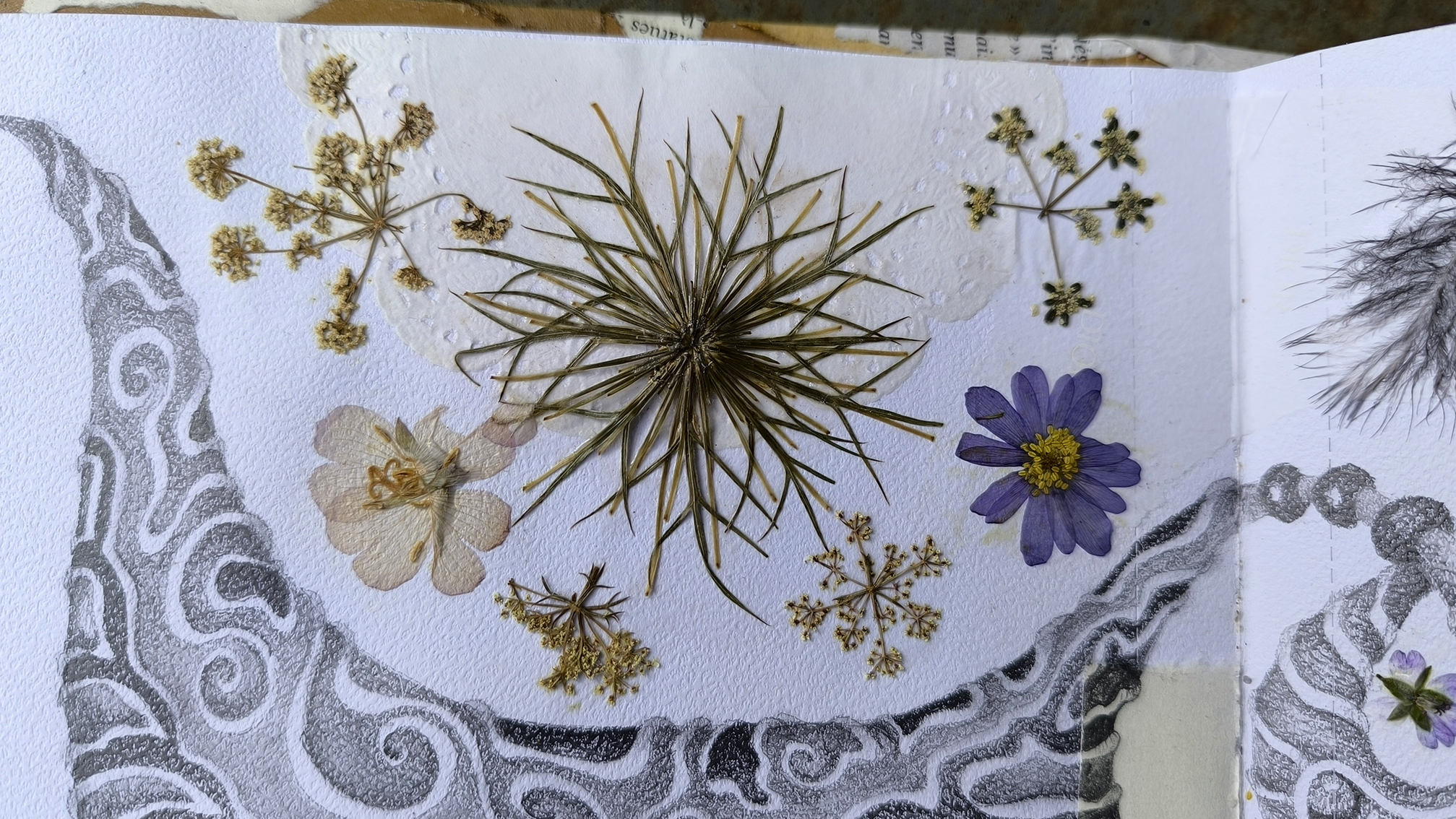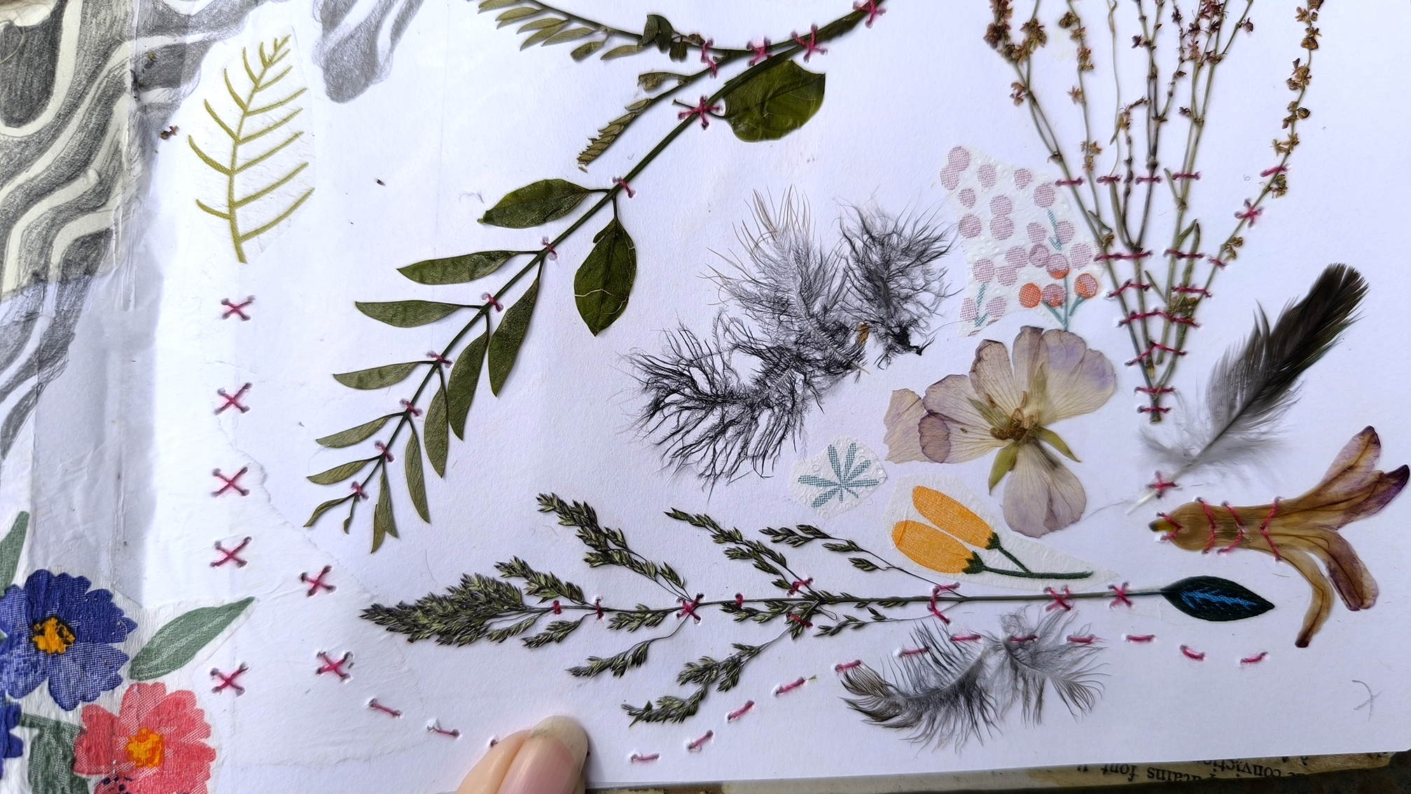 Je colle ensuite mille merveilles infimes, glanées ou conservées, naturelles ou fabriquées : fleurs, feuilles, plumes, vrilles de vigne, graminées, fougères, ficelles, dentelles, rubans, tissus… Chaque élément se mêle aux autres pour créer un univers foisonnant et fragile.