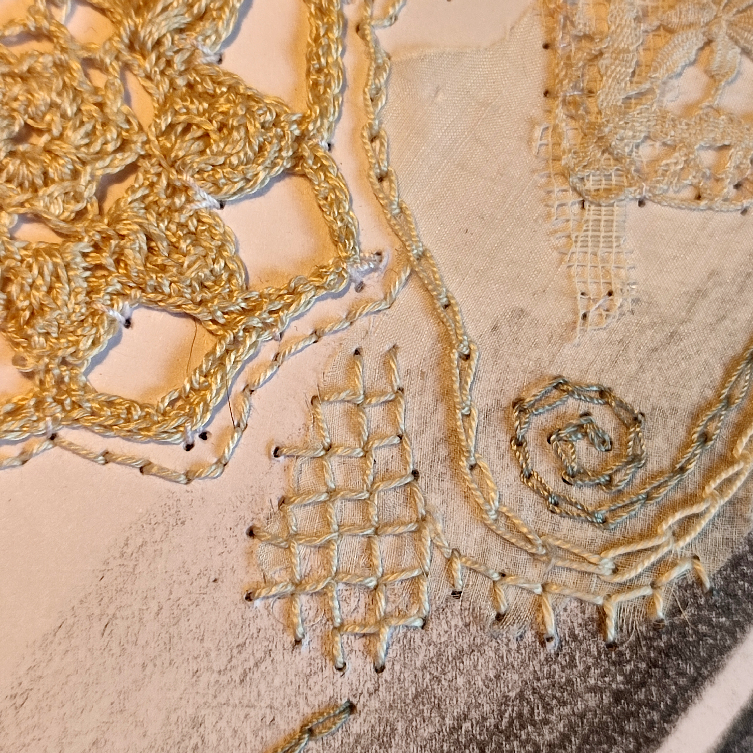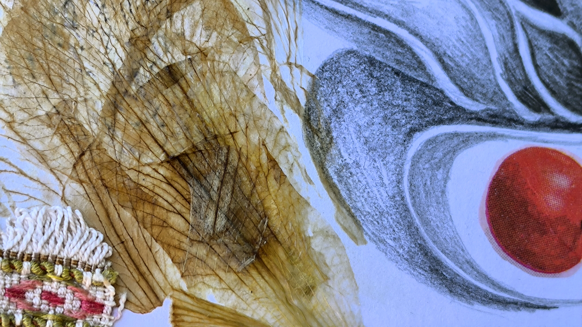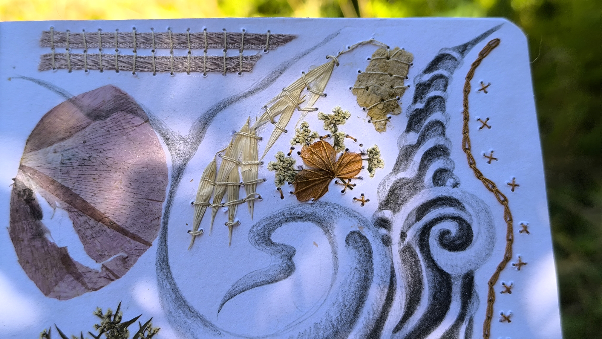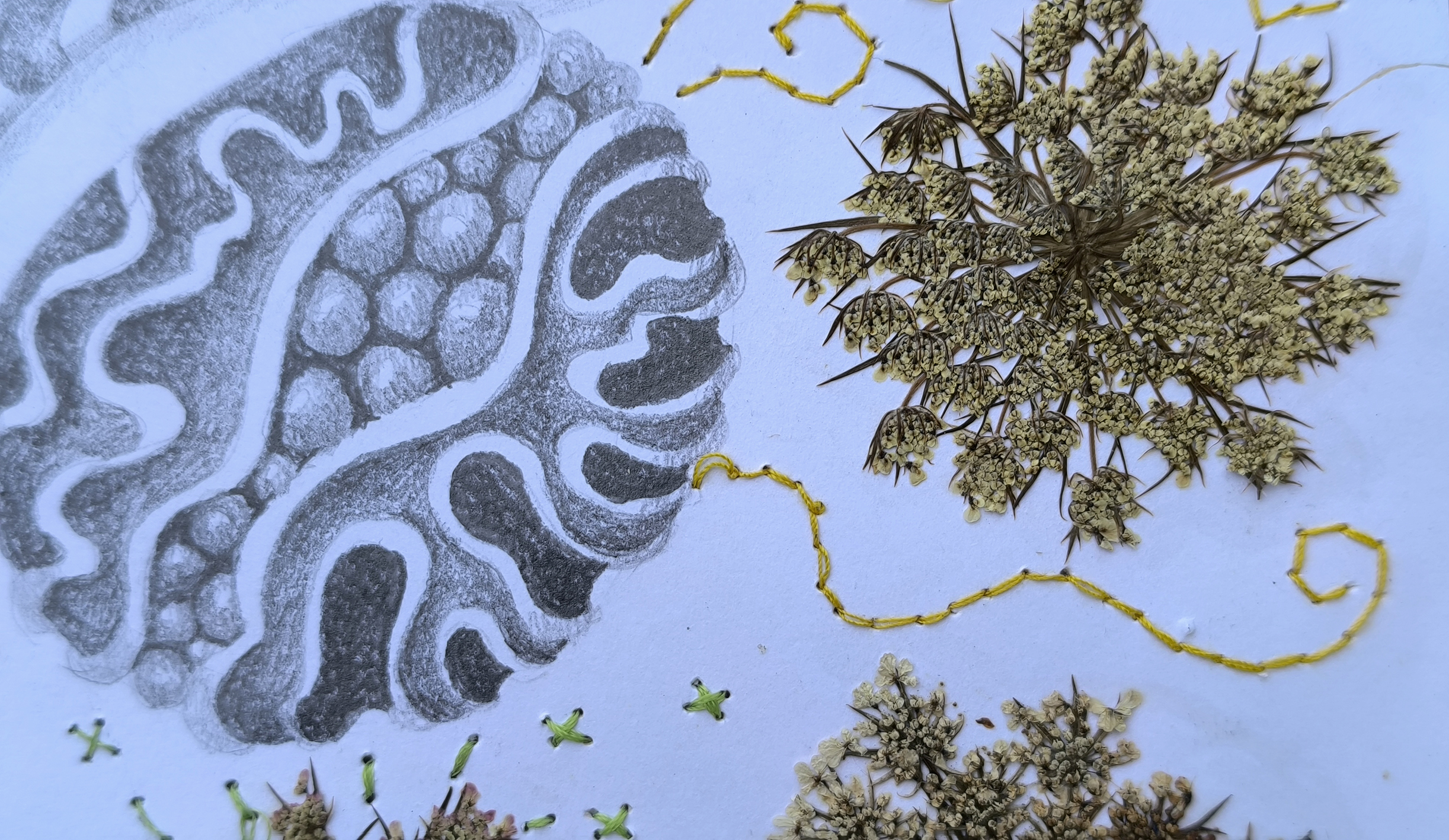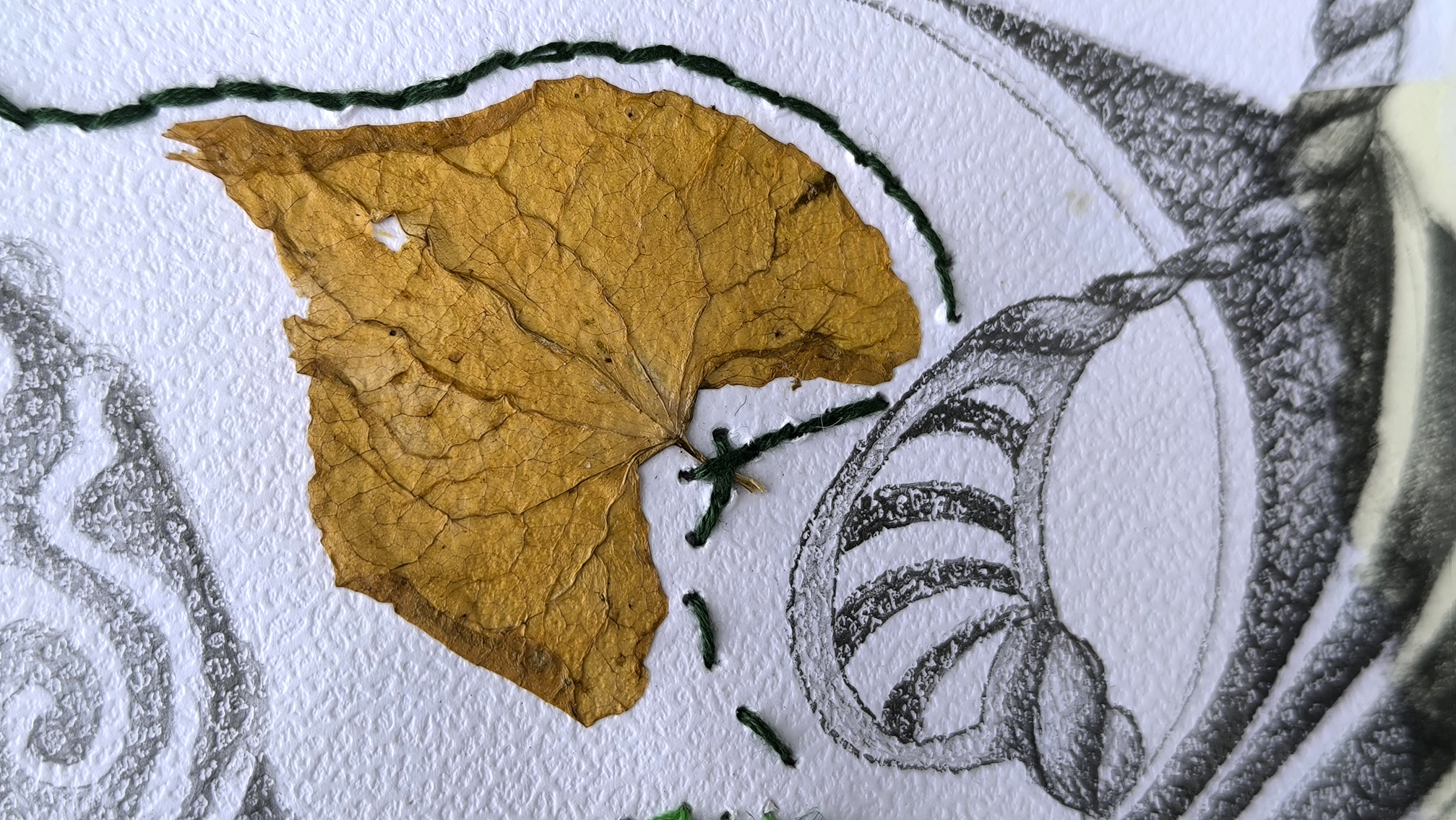 Je colle ensuite mille merveilles infimes, glanées ou conservées, naturelles ou fabriquées : fleurs, feuilles, plumes, vrilles de vigne, graminées, fougères, ficelles, dentelles, rubans, tissus… Chaque élément se mêle aux autres pour créer un univers foisonnant et fragile.