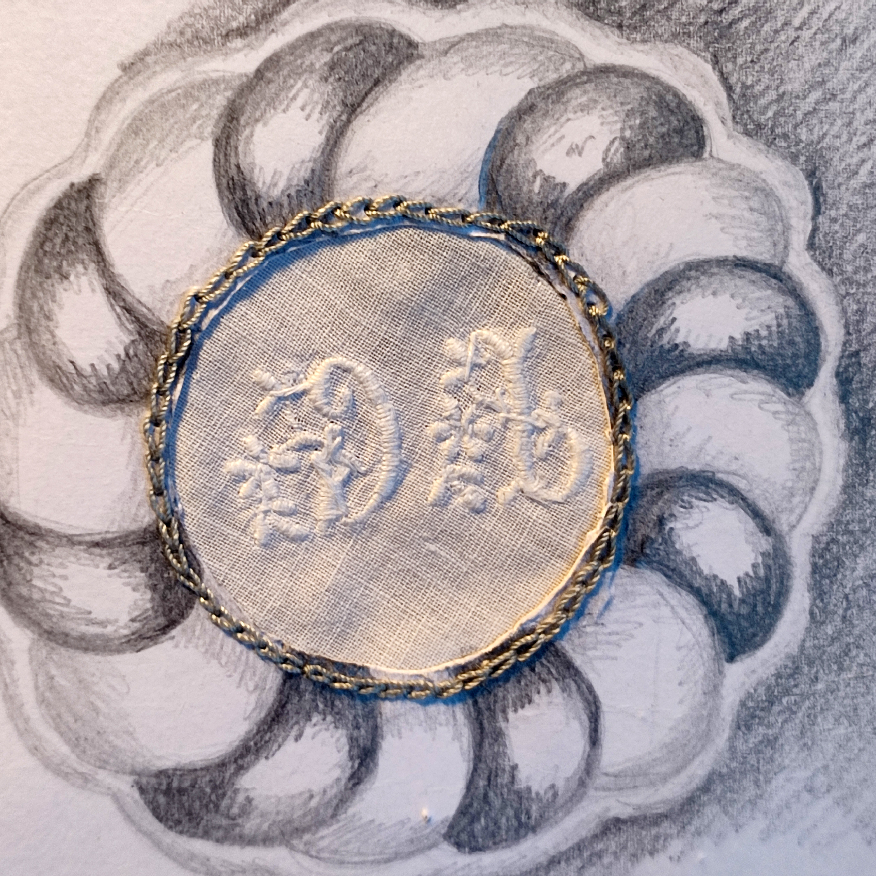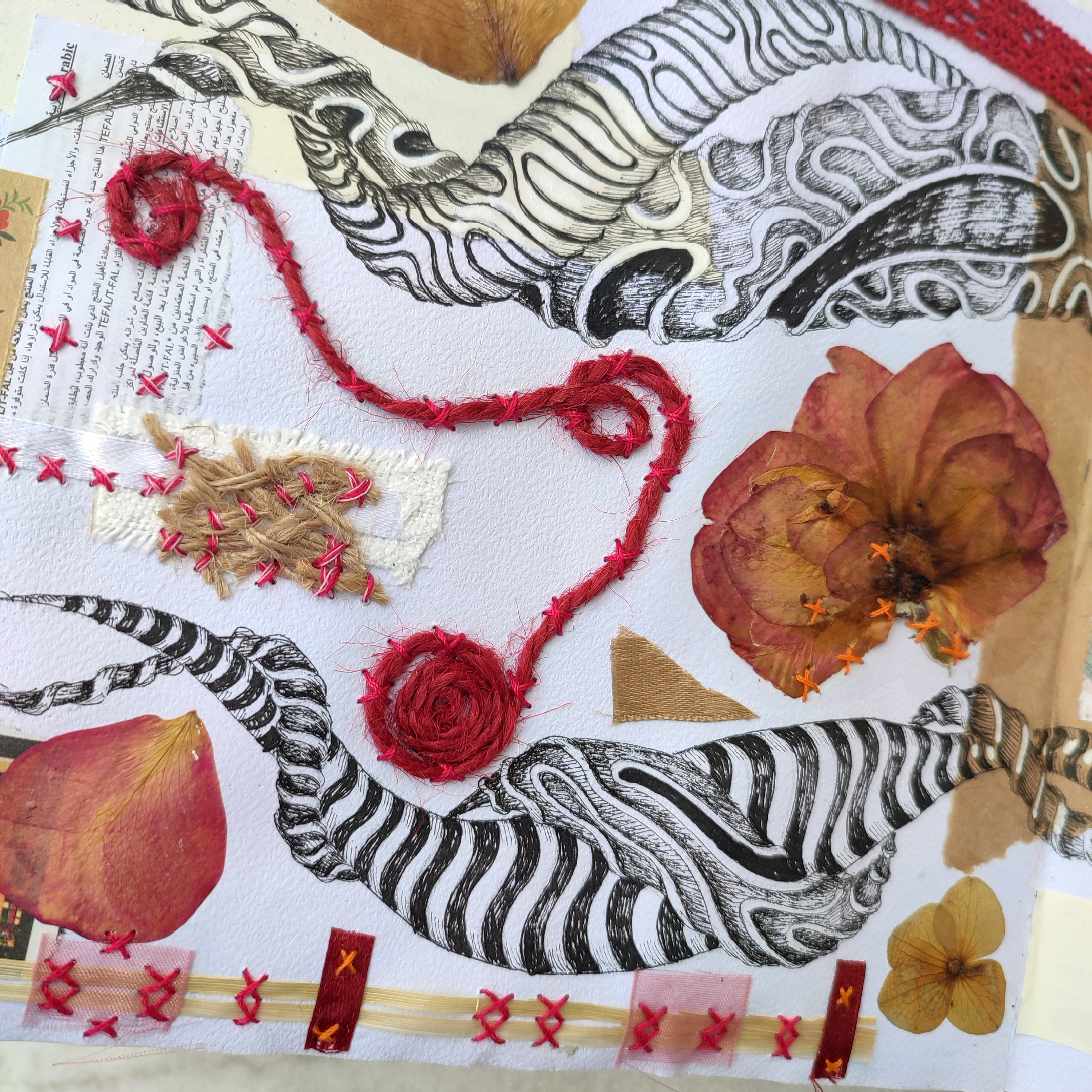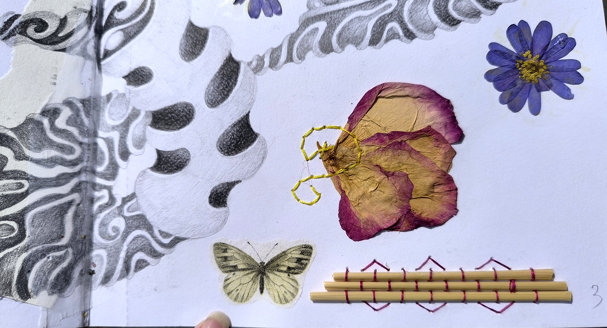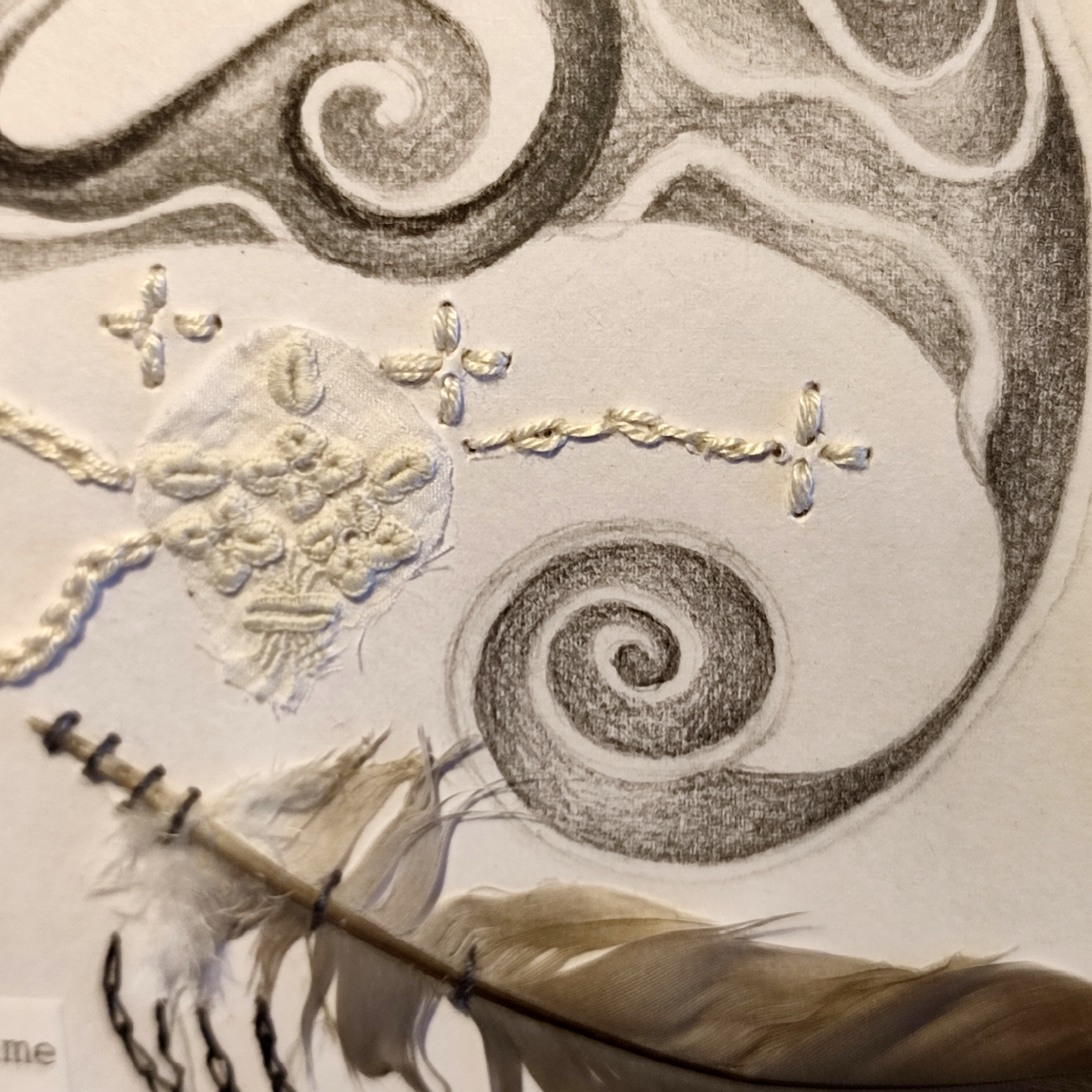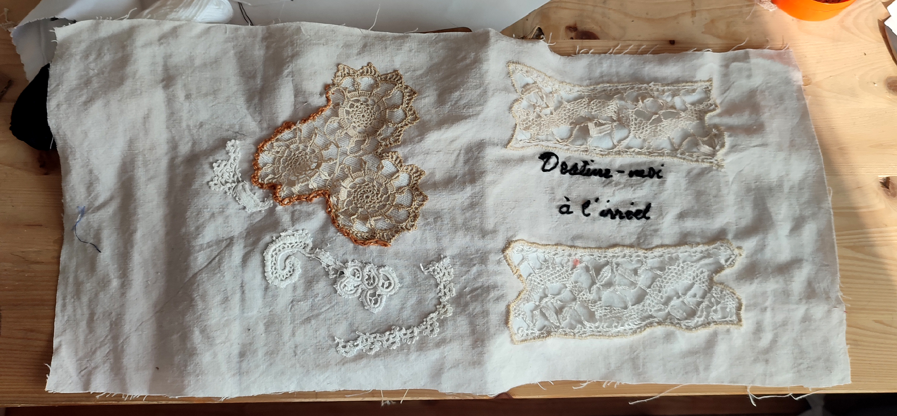 Je colle ensuite mille merveilles infimes, glanées ou conservées, naturelles ou fabriquées : fleurs, feuilles, plumes, vrilles de vigne, graminées, fougères, ficelles, dentelles, rubans, tissus… Chaque élément se mêle aux autres pour créer un univers foisonnant et fragile.
