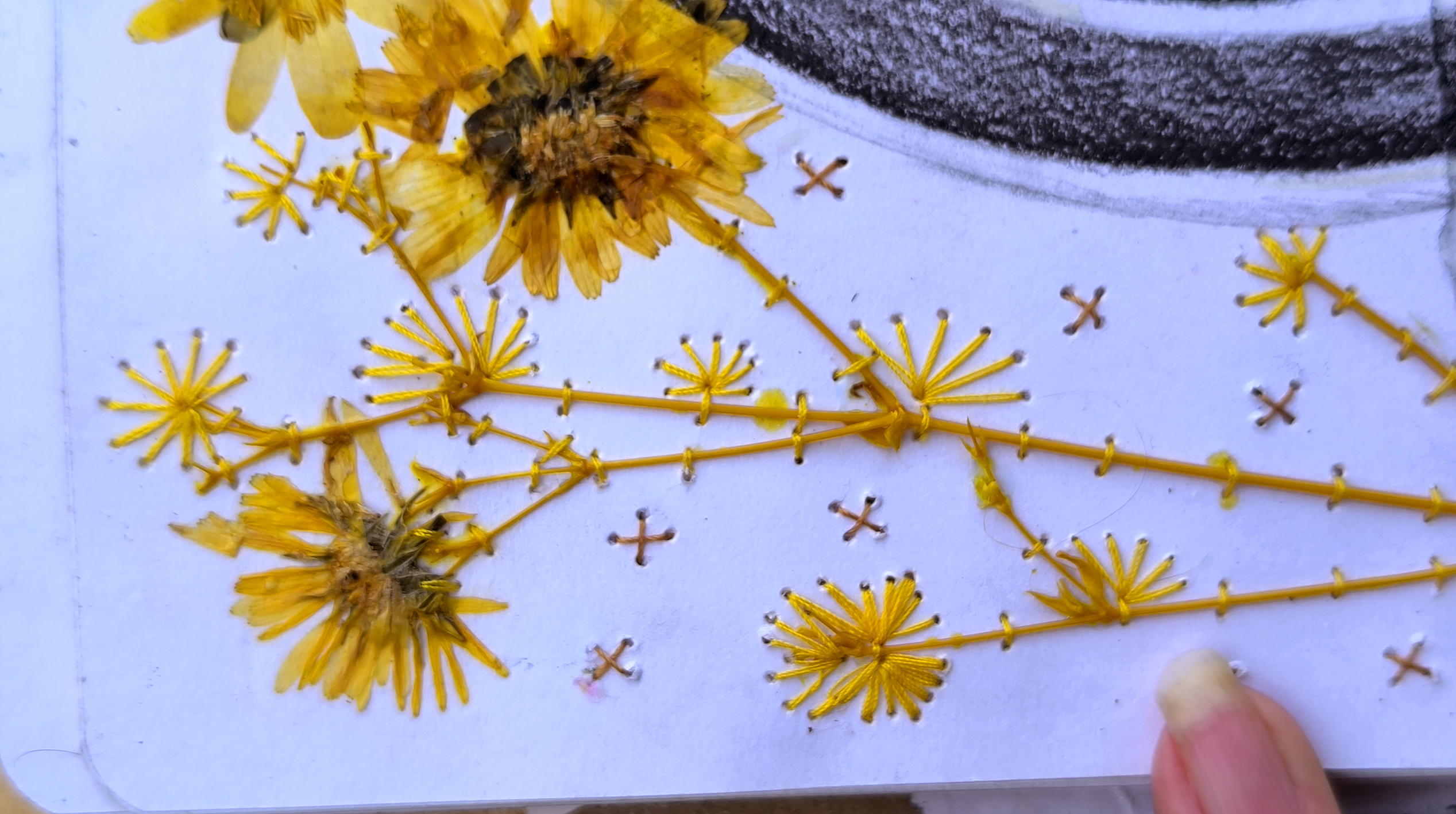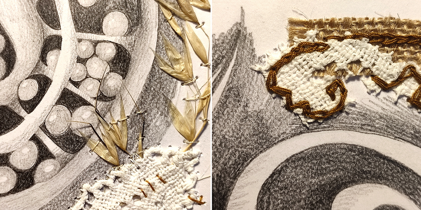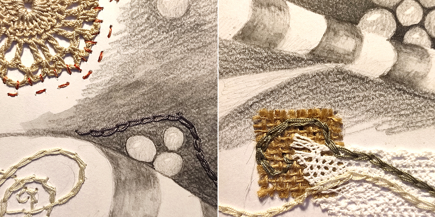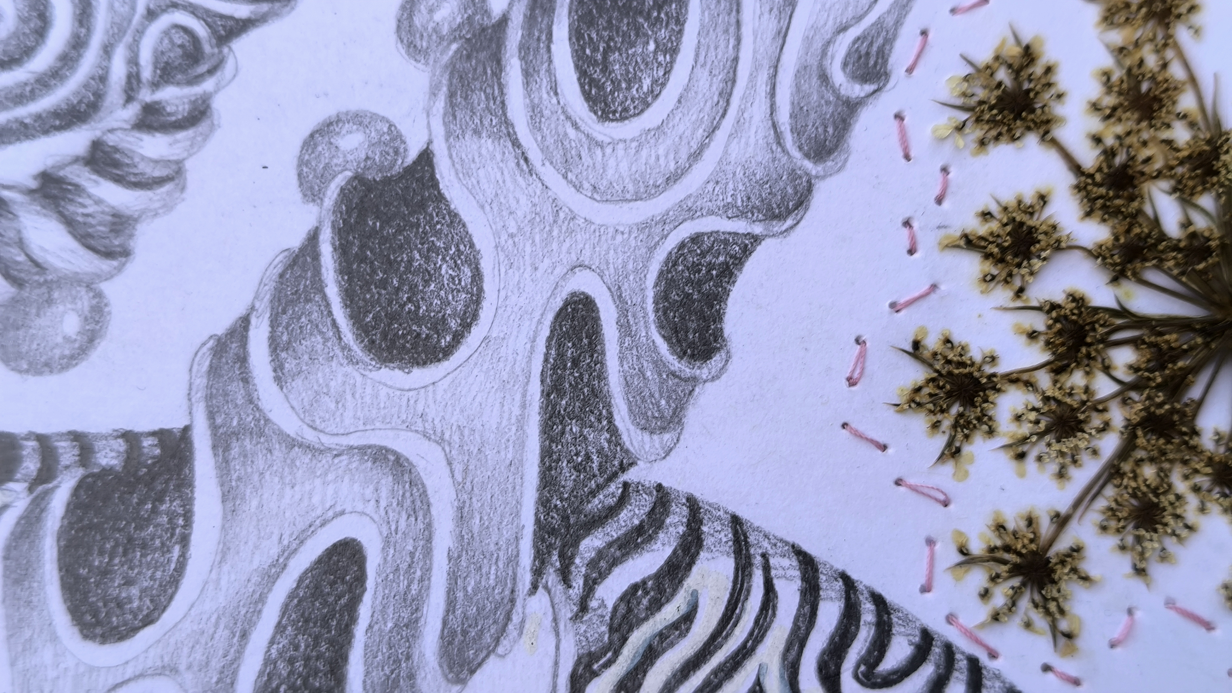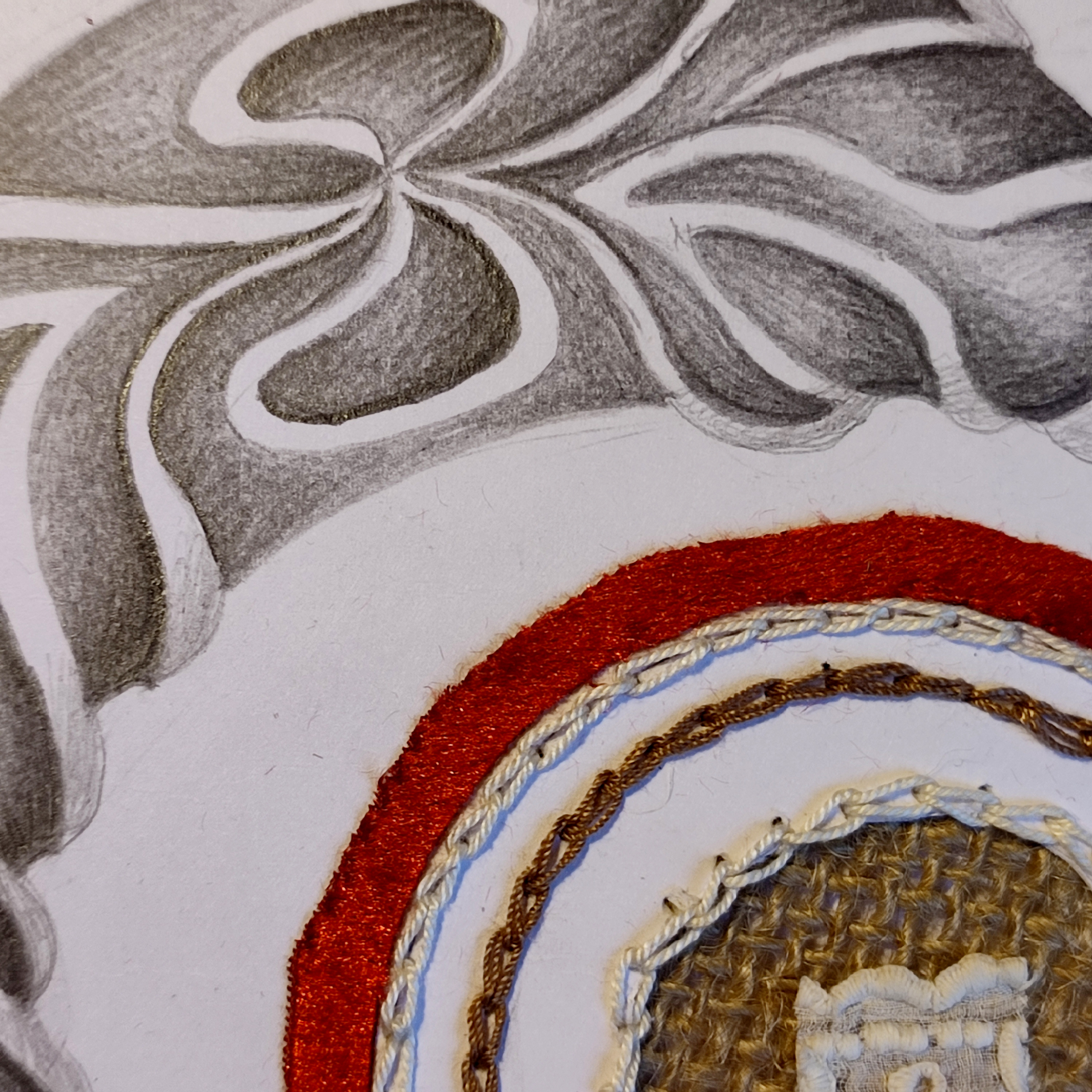 Je colle ensuite mille merveilles infimes, glanées ou conservées, naturelles ou fabriquées : fleurs, feuilles, plumes, vrilles de vigne, graminées, fougères, ficelles, dentelles, rubans, tissus… Chaque élément se mêle aux autres pour créer un univers foisonnant et fragile.