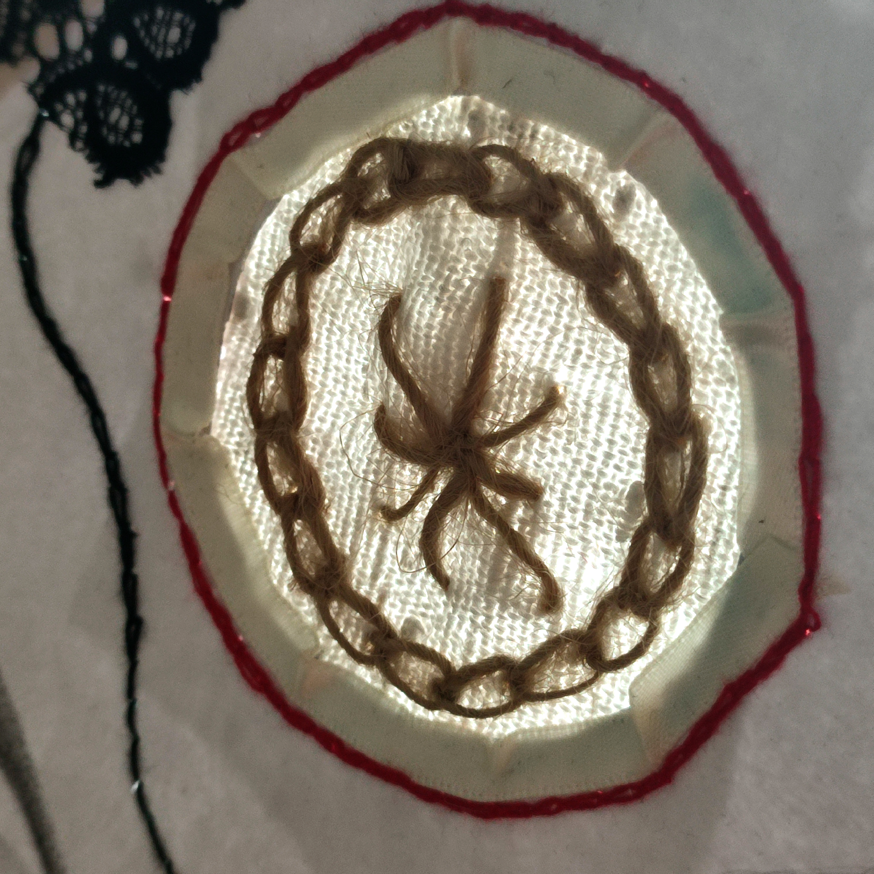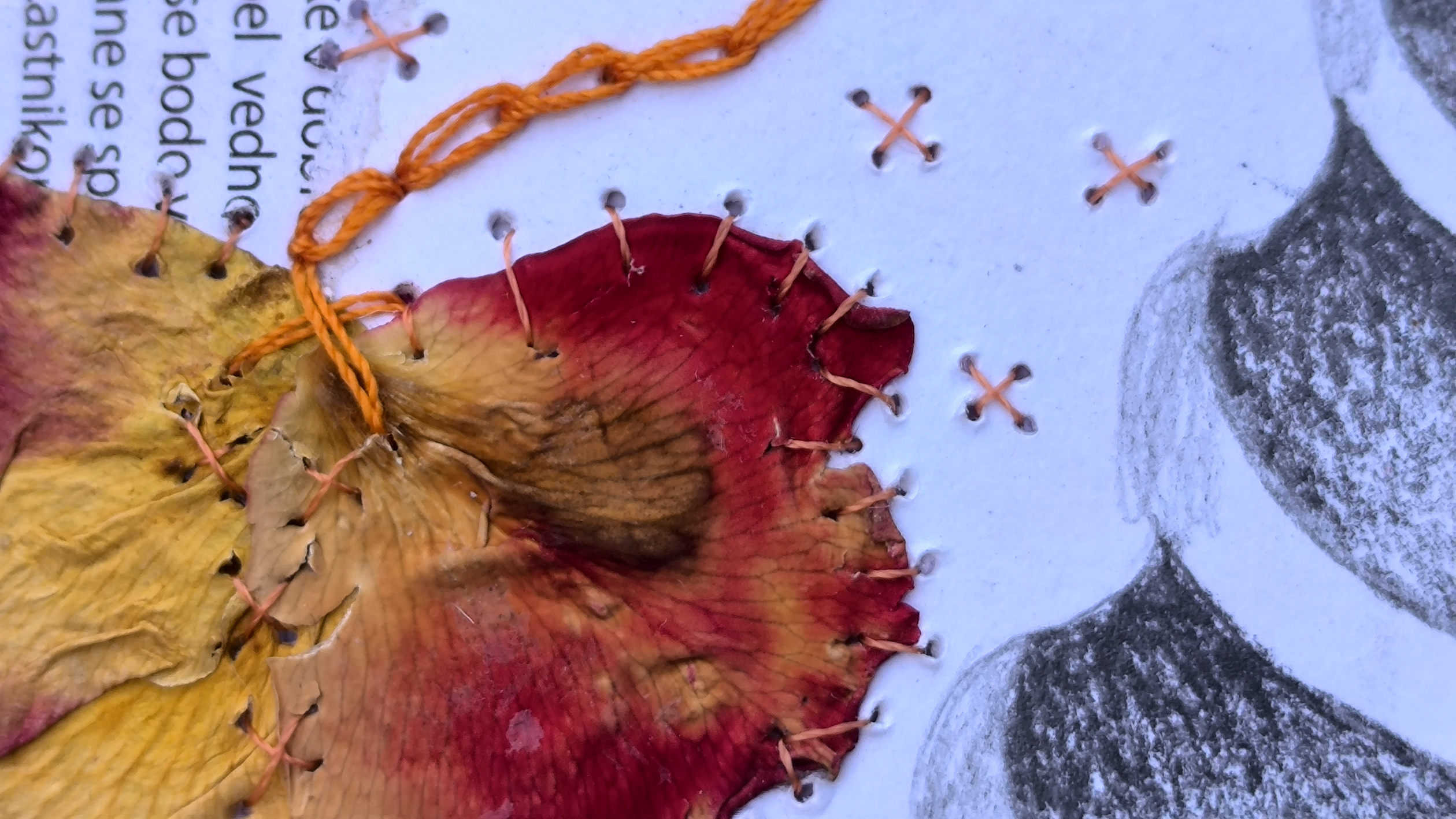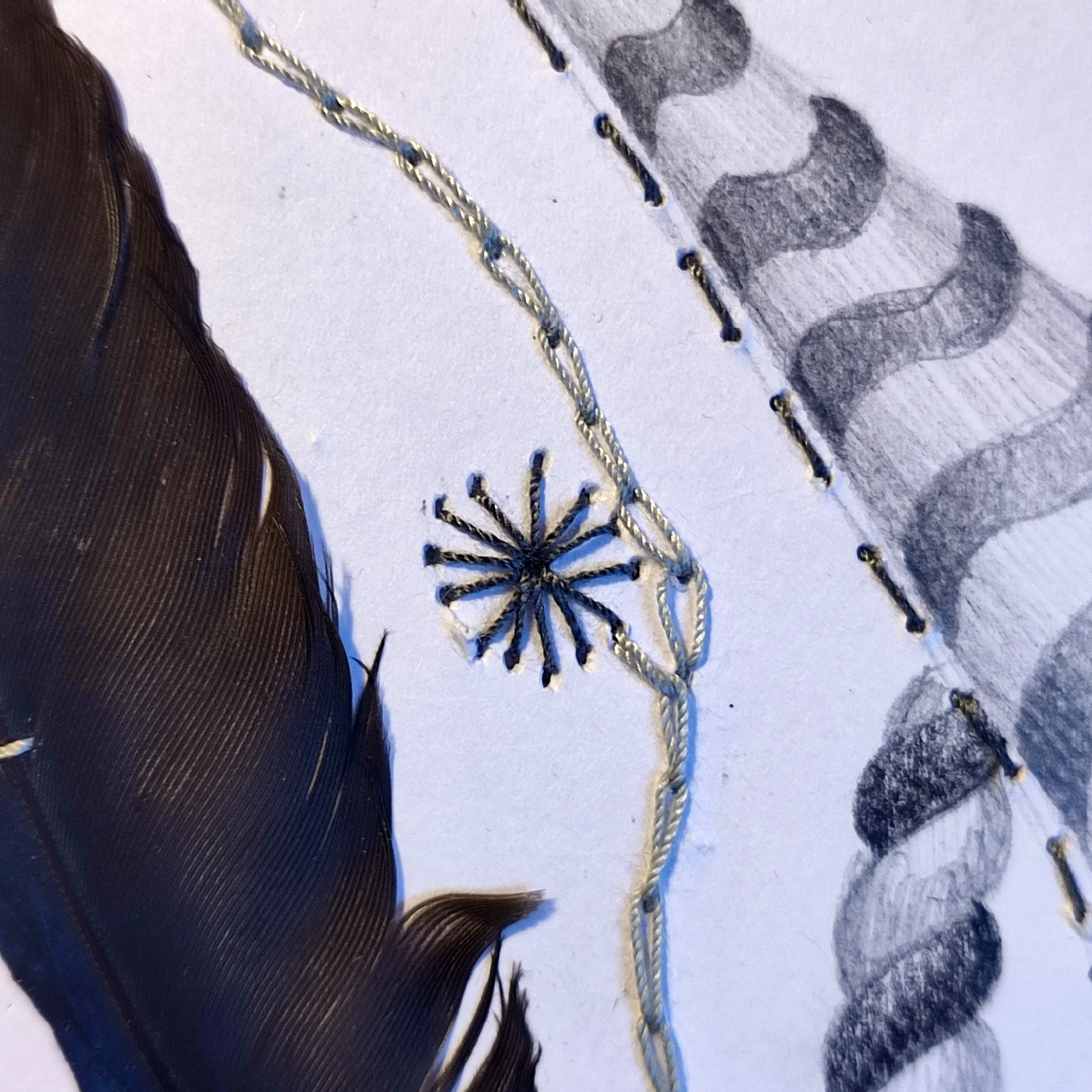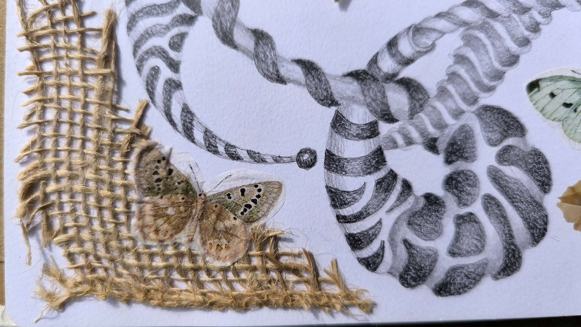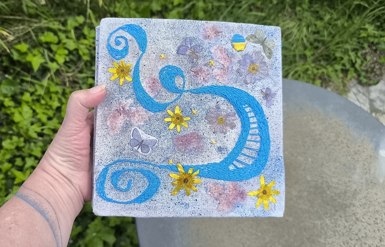 Je colle ensuite mille merveilles infimes, glanées ou conservées, naturelles ou fabriquées : fleurs, feuilles, plumes, vrilles de vigne, graminées, fougères, ficelles, dentelles, rubans, tissus… Chaque élément se mêle aux autres pour créer un univers foisonnant et fragile.