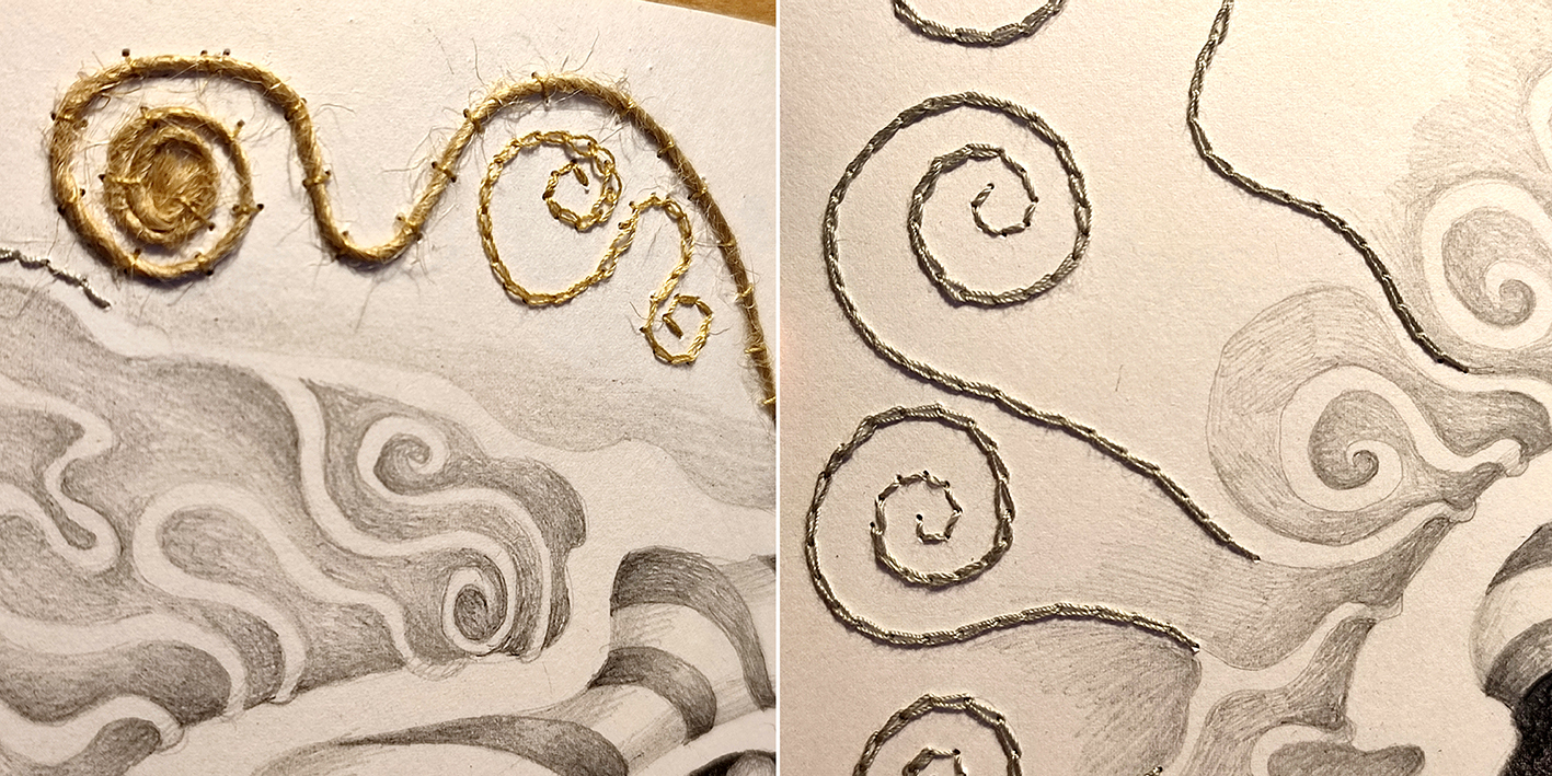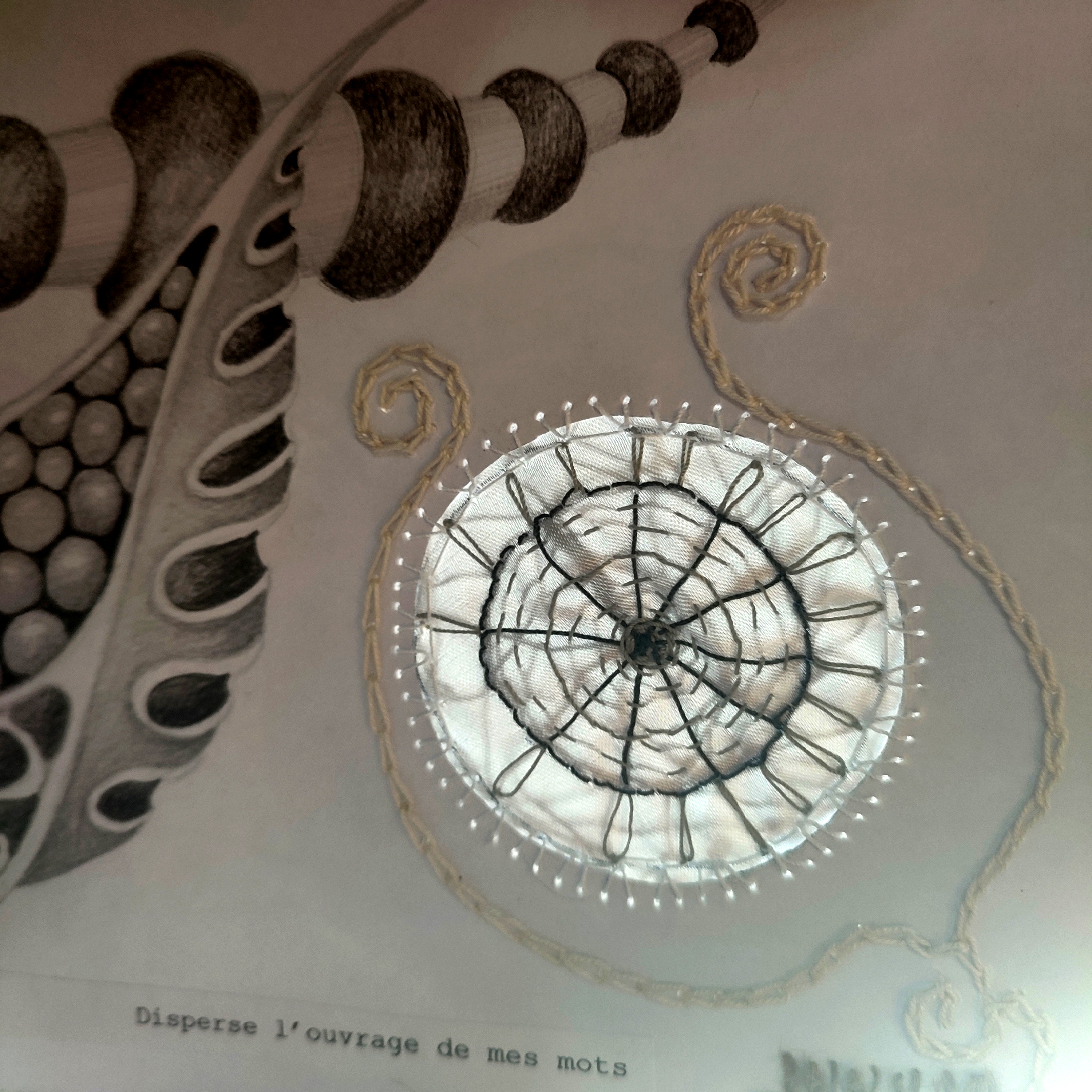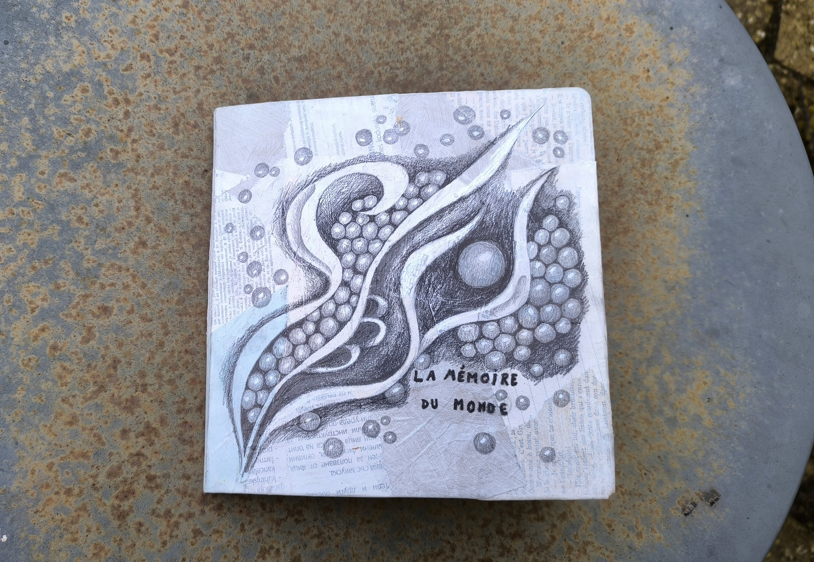 Je travaille le fond, écris le haïku, puis dessine mes formes abstraites, comme des fragments d’une réalité parallèle.
