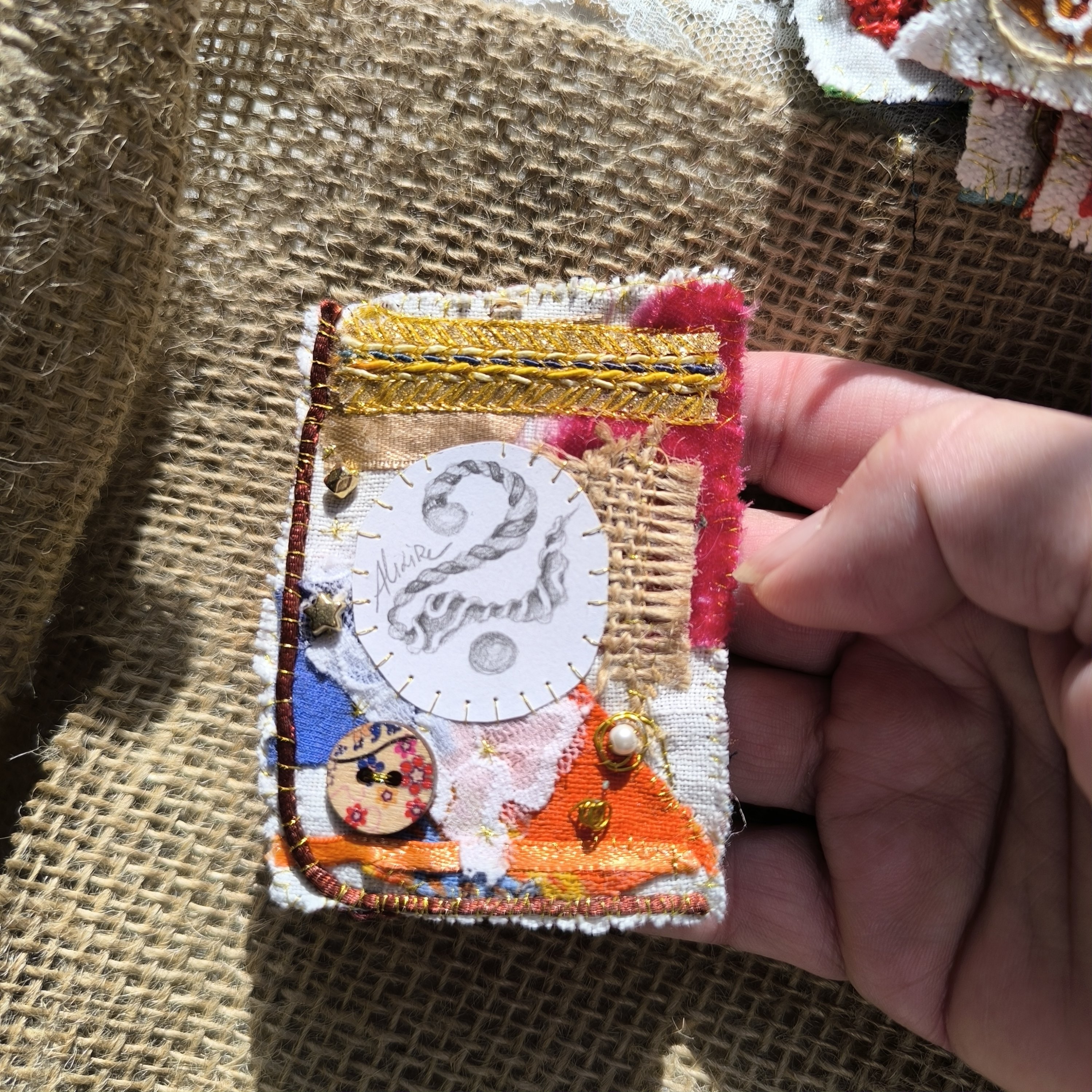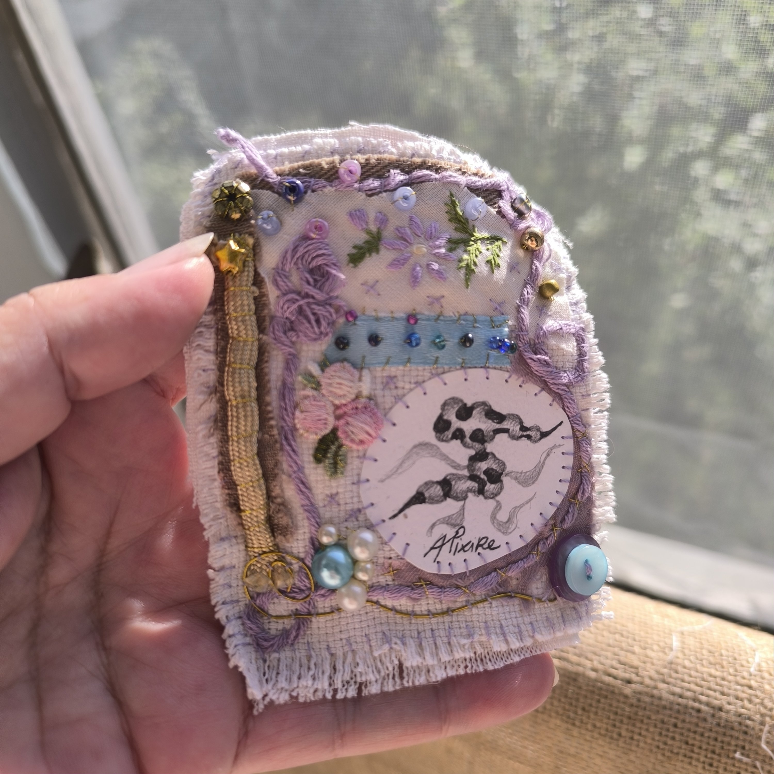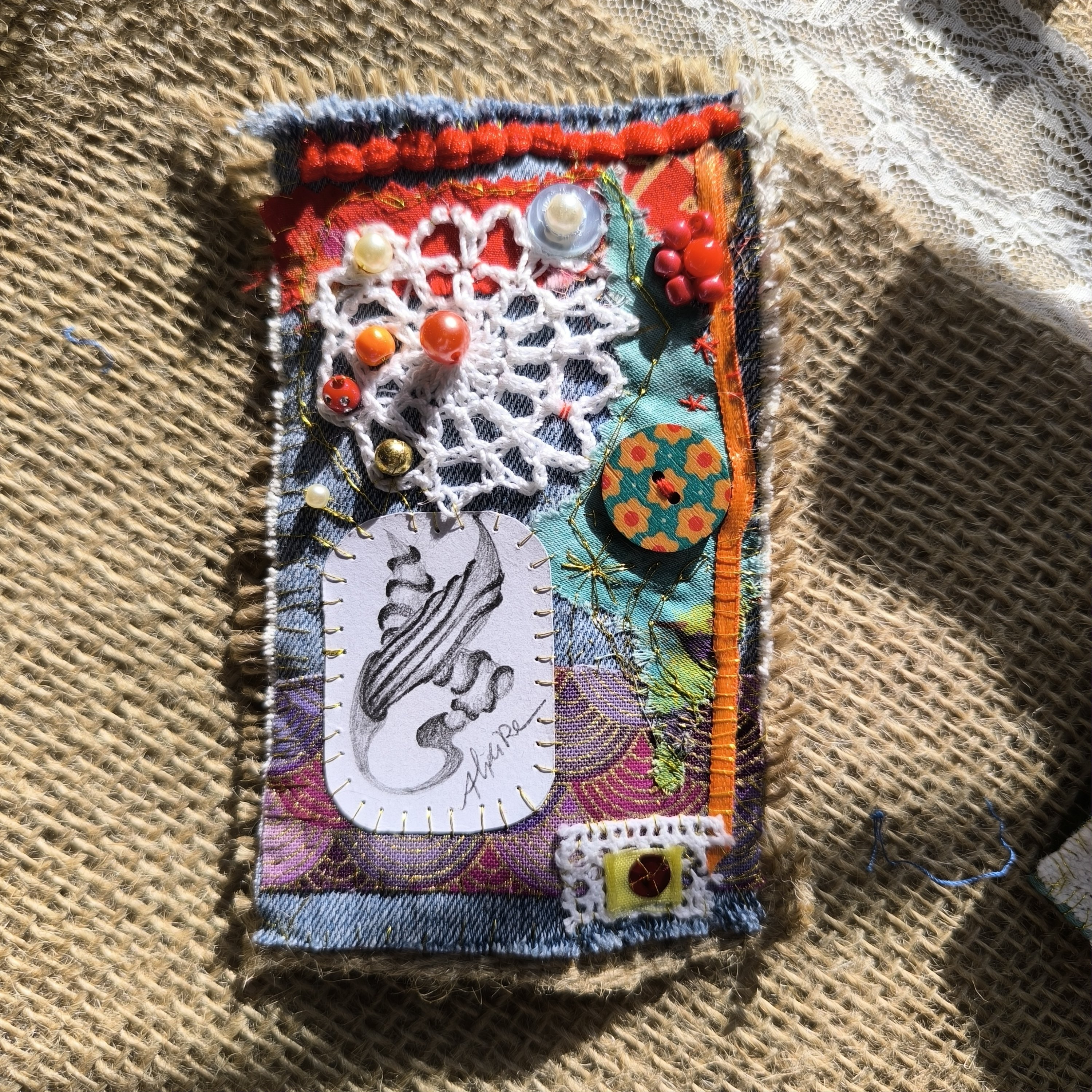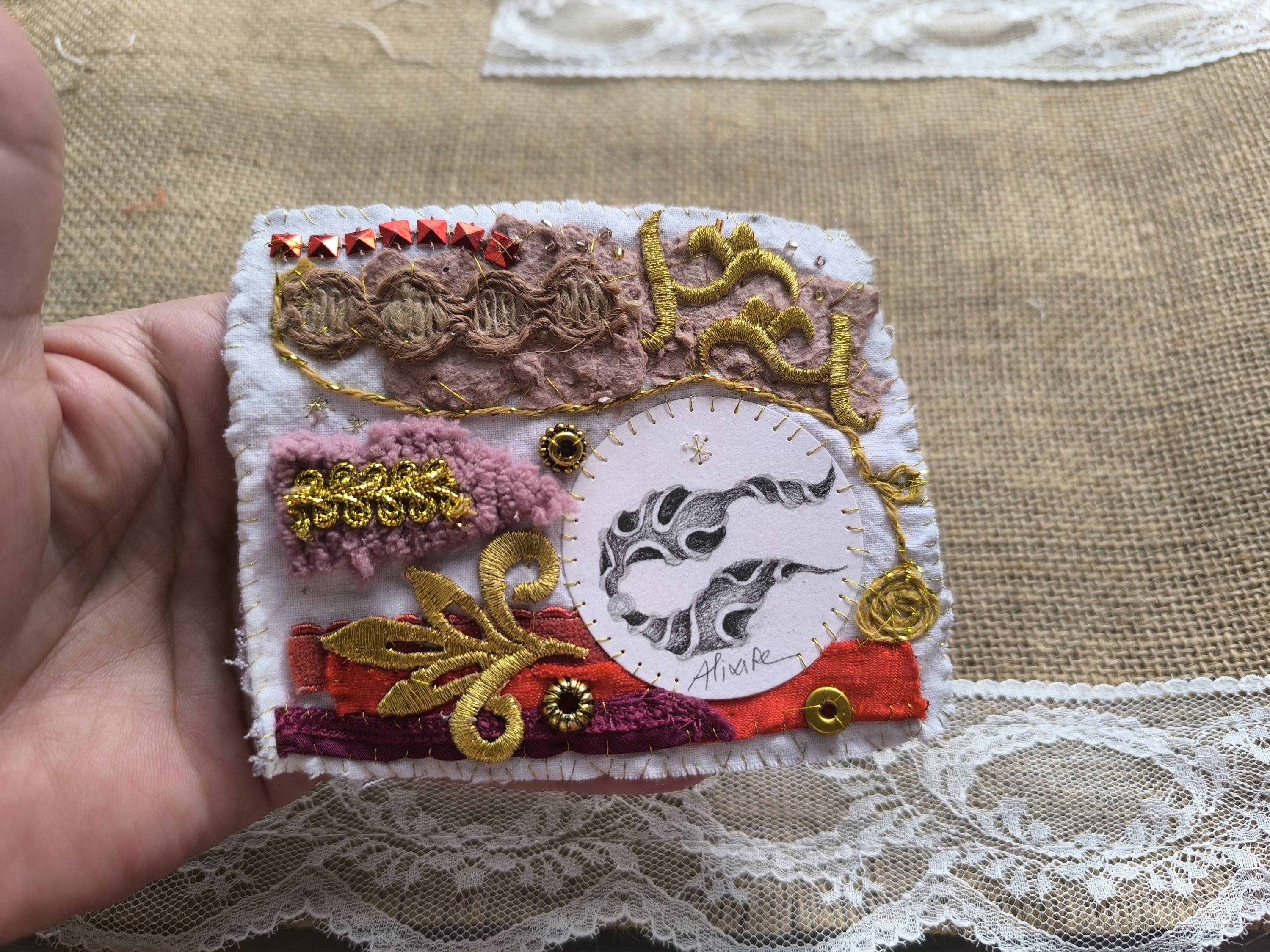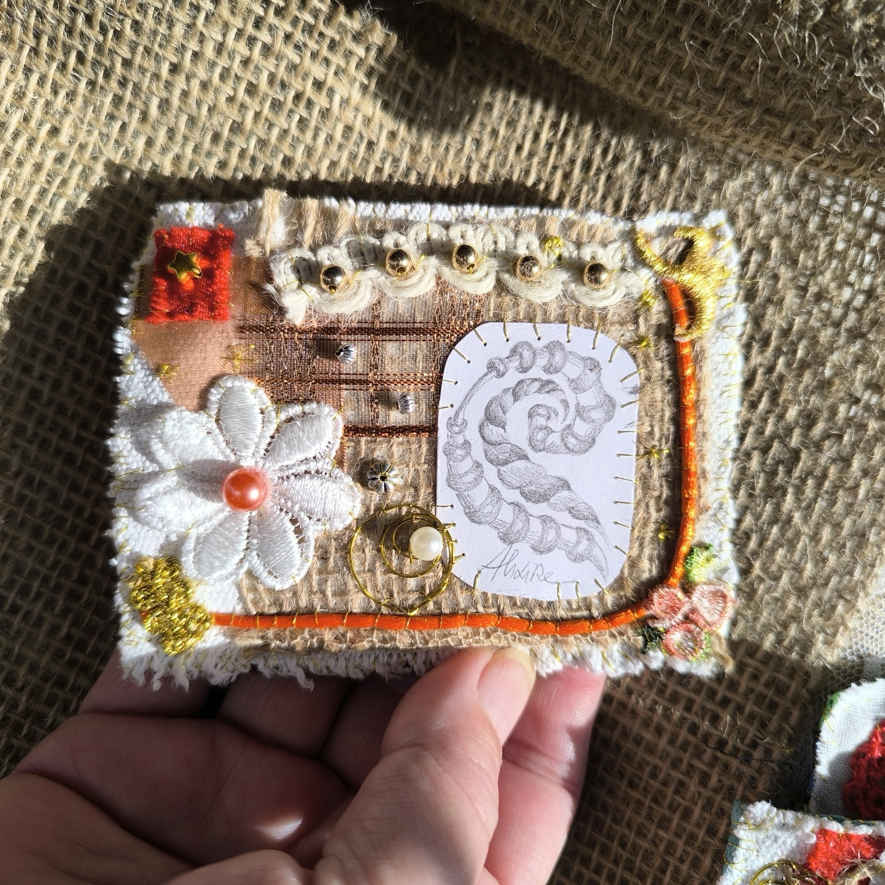 Comme une envie de travailler la miniature, le petit, le délicat. Créer de petites pièces aussi, accessibles aux petites bourses. Chaque pièce commence par un tout petit dessin, une volute miniature. Puis vient le temps de créer, d’imaginer une composition de tissus aux couleurs et matières variées, enrichie de rubans, perles, fils bourdons et boutons. J’y ajoute des pièces de crochet, des dentelles, des ficelles, et mille petites choses glanées dans mes tiroirs. Le tout, cousu d’un joli fil doré, ou pas.