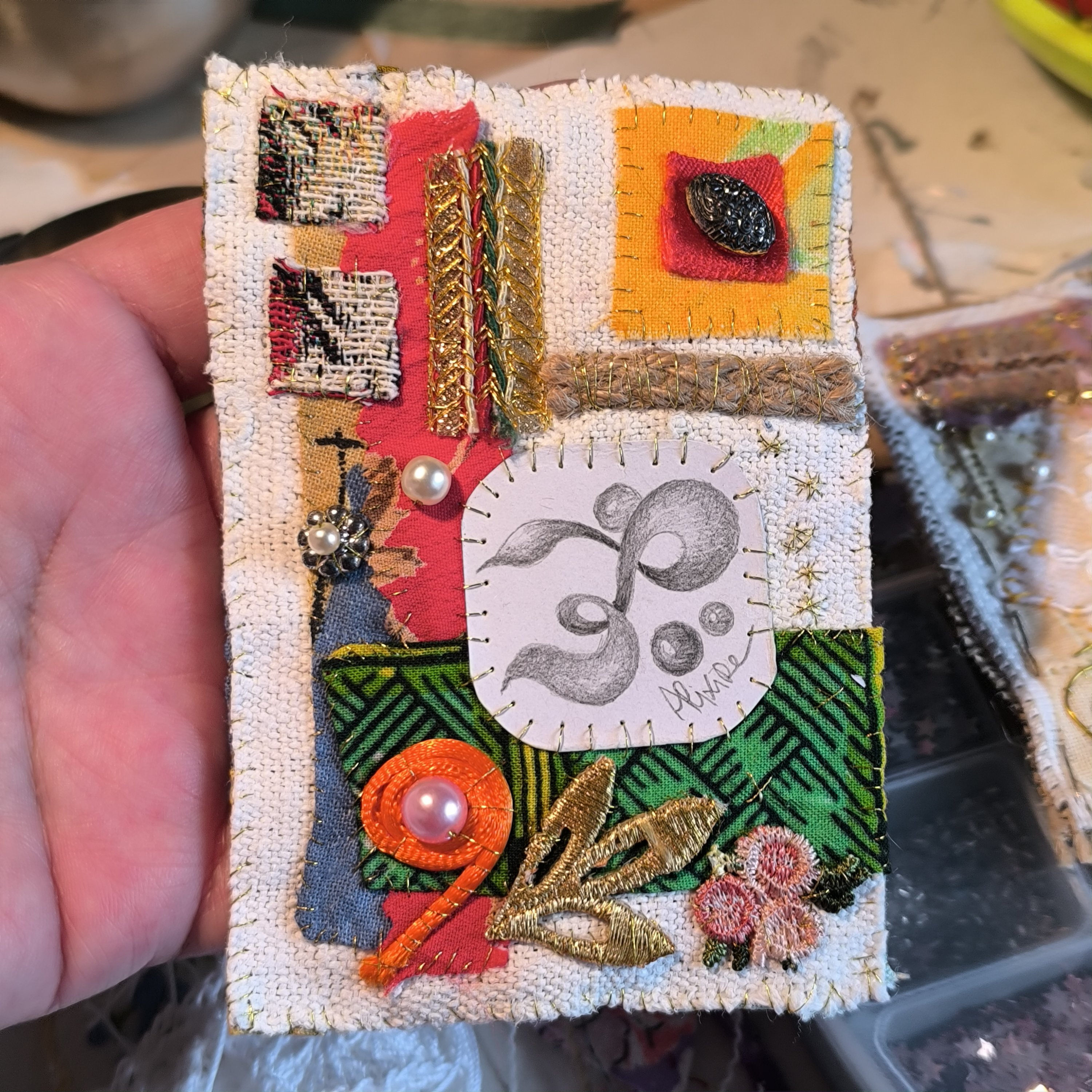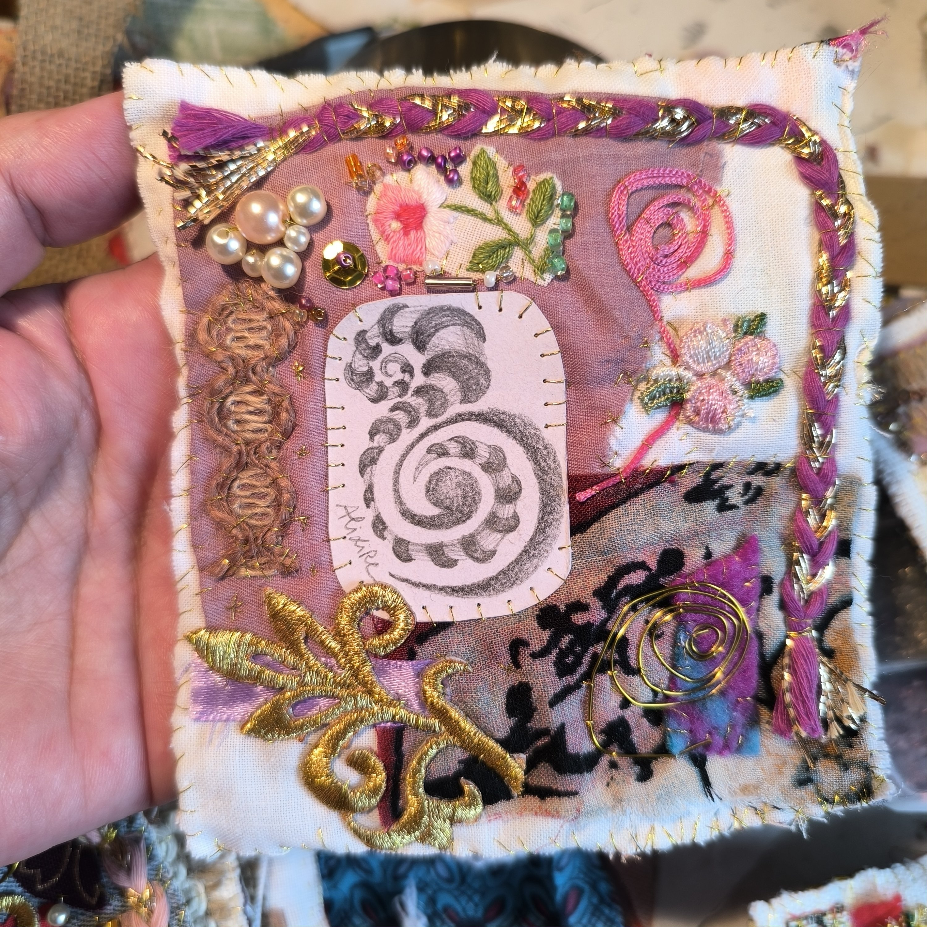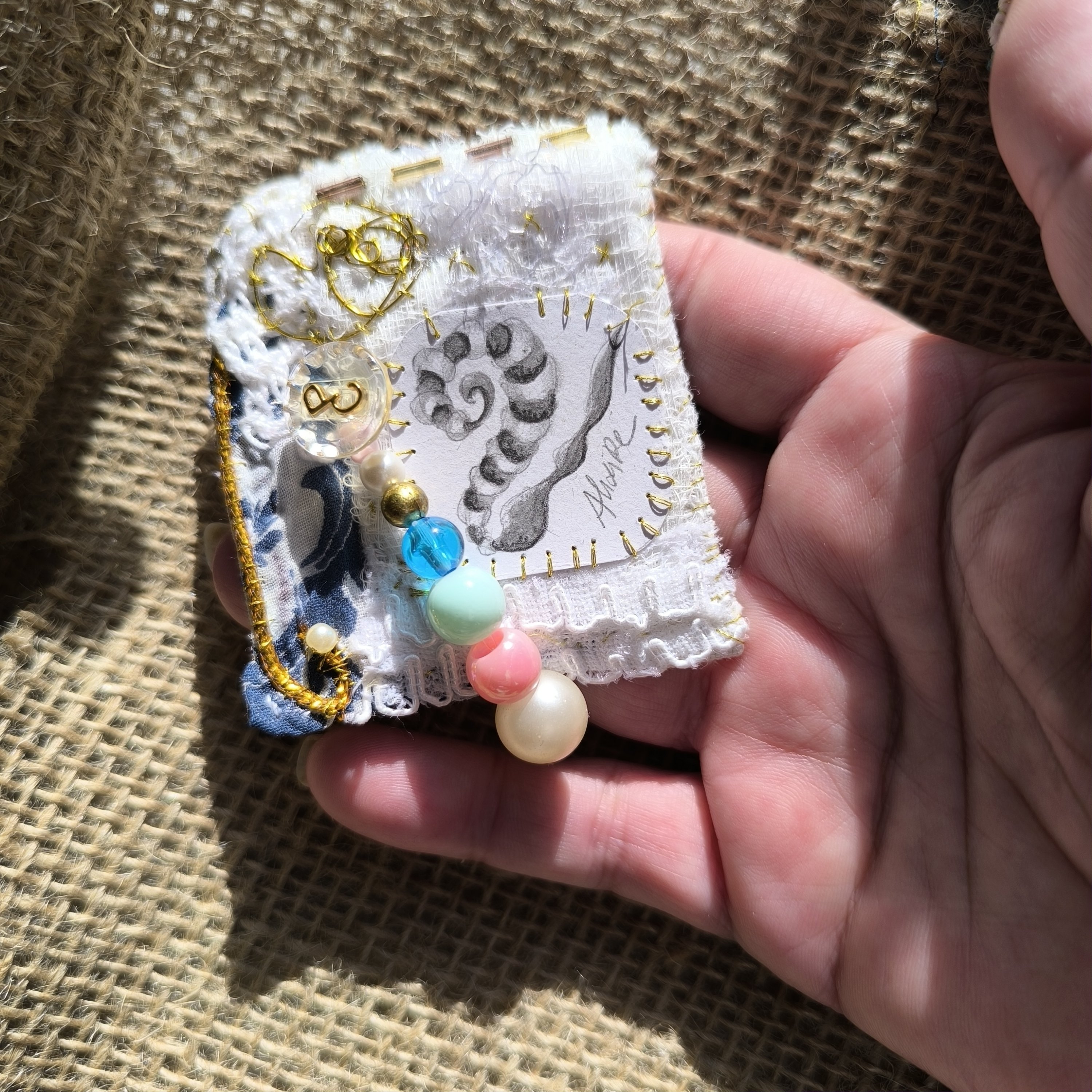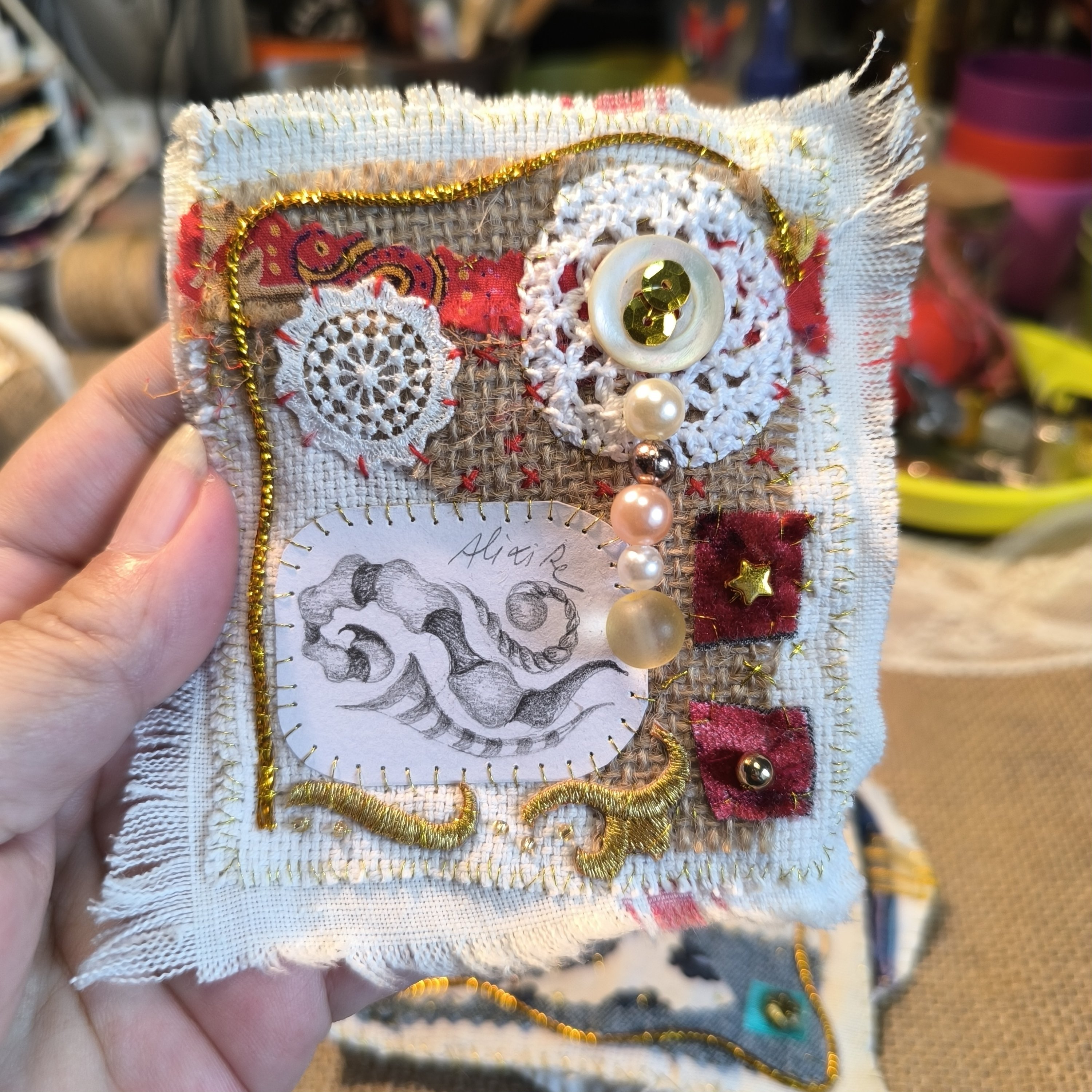 Comme une envie de travailler la miniature, le petit, le délicat. Créer de petites pièces aussi, accessibles aux petites bourses. Chaque pièce commence par un tout petit dessin, une volute miniature. Puis vient le temps de créer, d’imaginer une composition de tissus aux couleurs et matières variées, enrichie de rubans, perles, fils bourdons et boutons. J’y ajoute des pièces de crochet, des dentelles, des ficelles, et mille petites choses glanées dans mes tiroirs. Le tout, cousu d’un joli fil doré, ou pas.