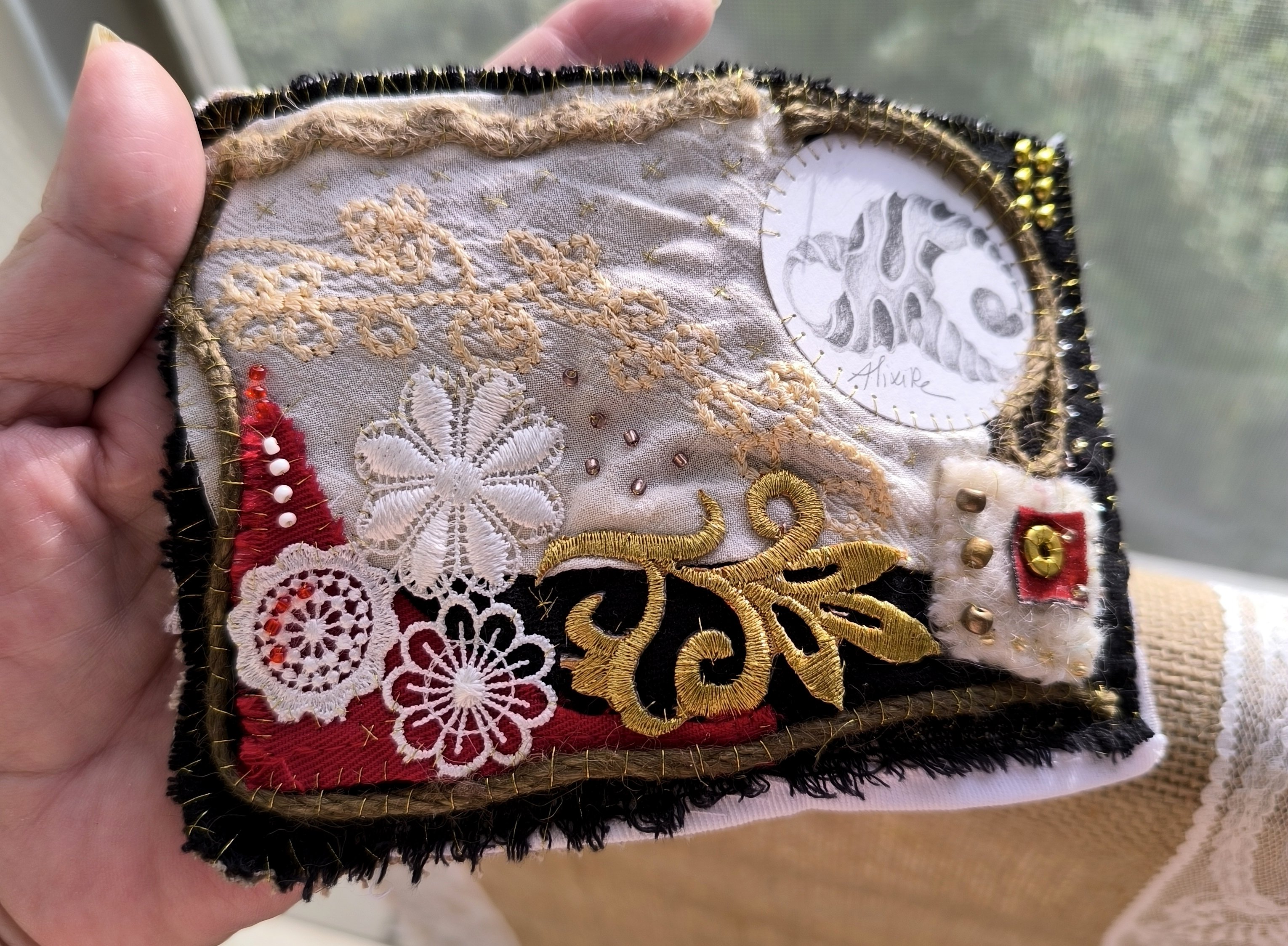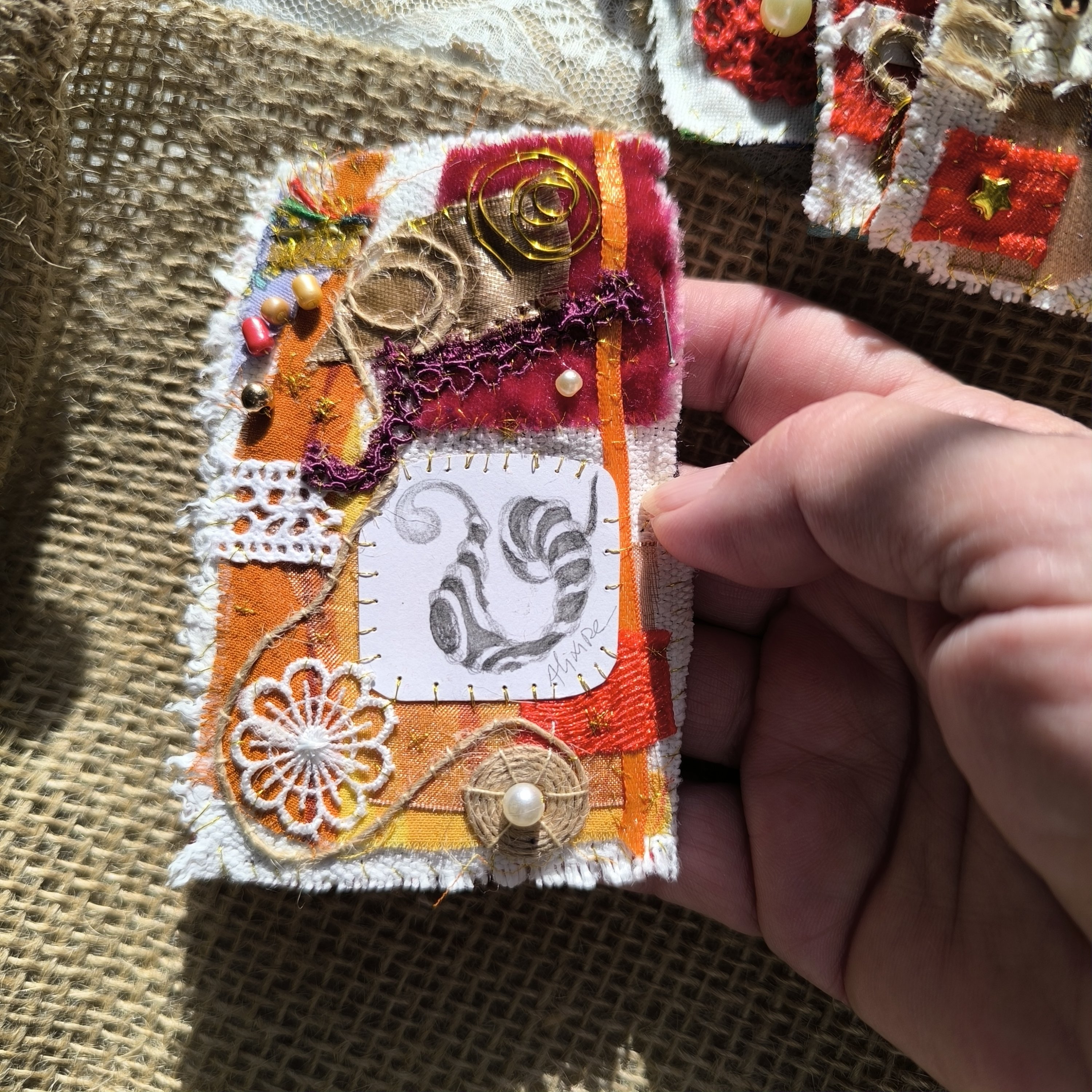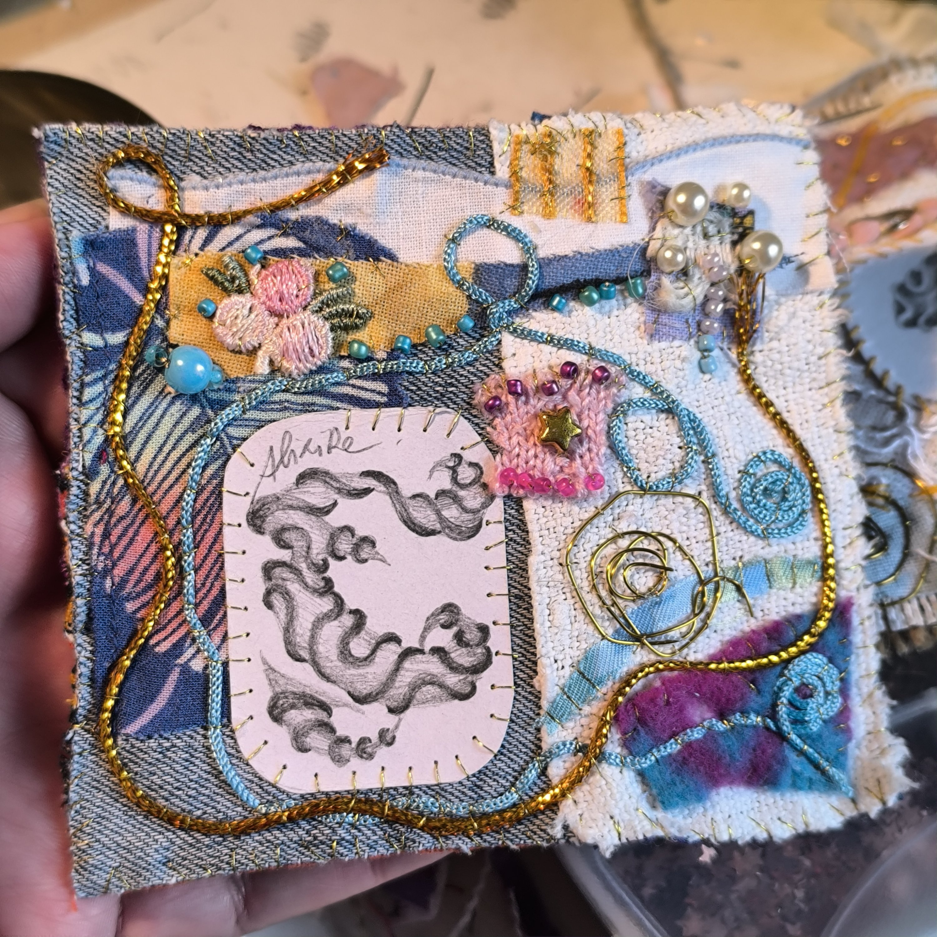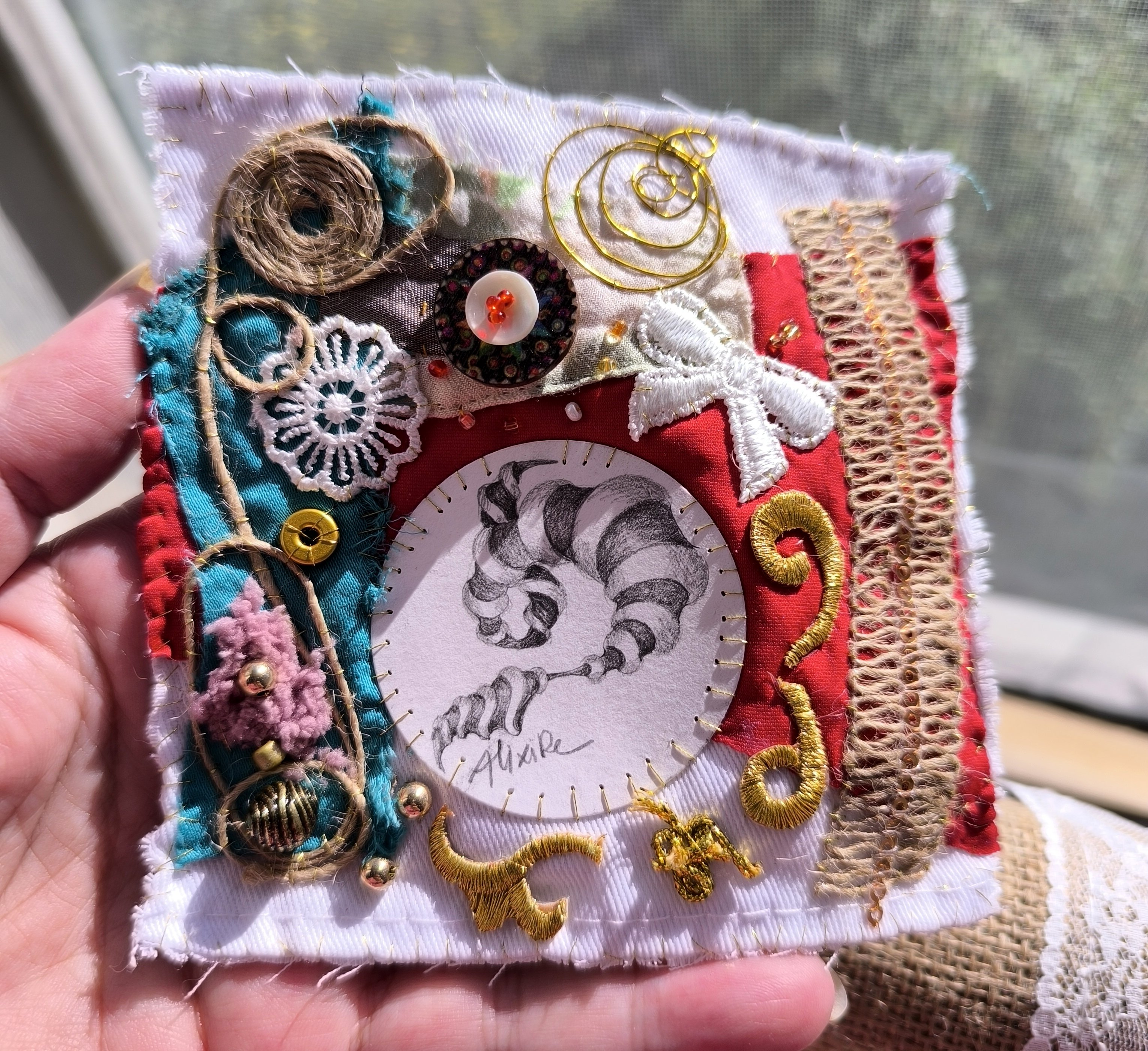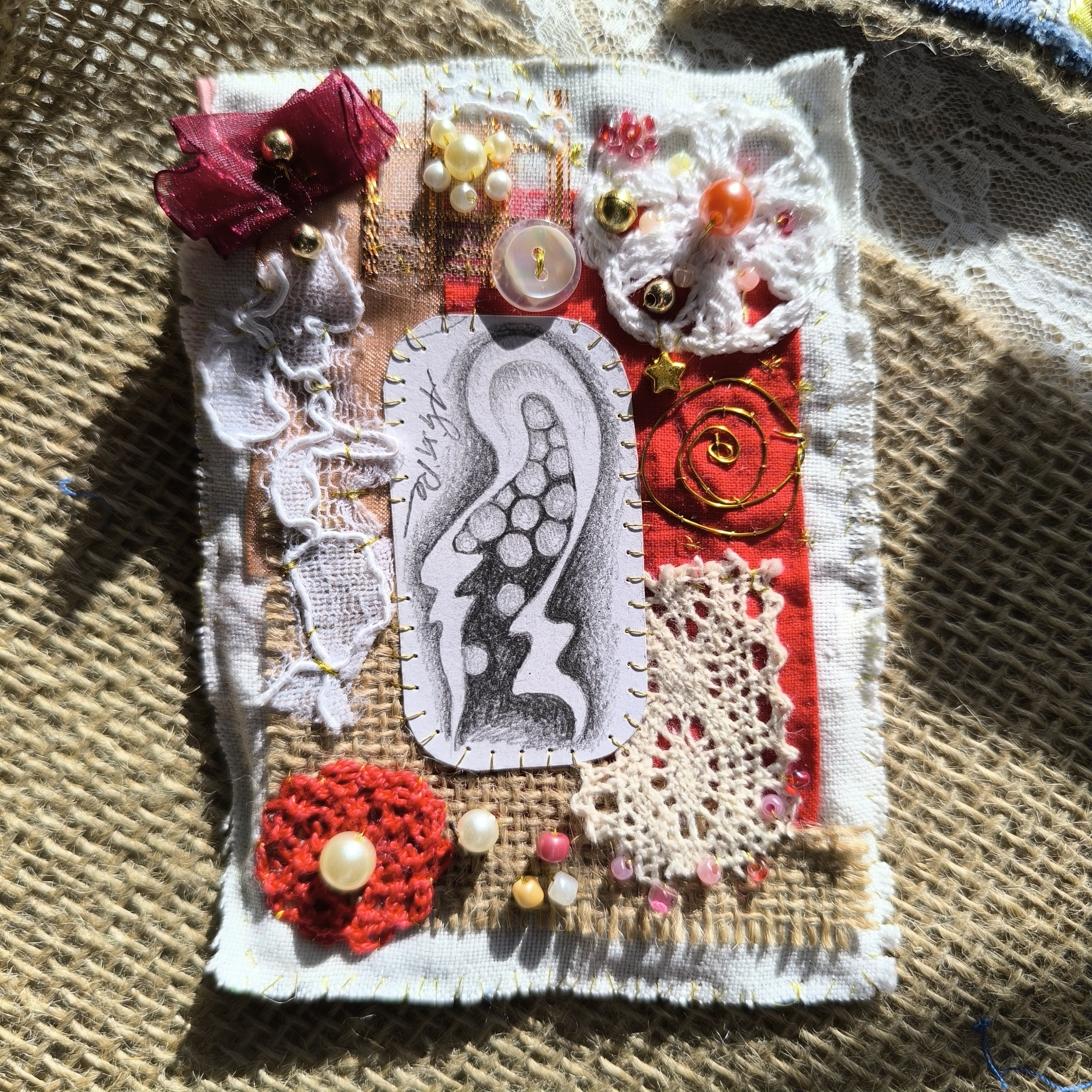 Comme une envie de travailler la miniature, le petit, le délicat. Créer de petites pièces aussi, accessibles aux petites bourses. Chaque pièce commence par un tout petit dessin, une volute miniature. Puis vient le temps de créer, d’imaginer une composition de tissus aux couleurs et matières variées, enrichie de rubans, perles, fils bourdons et boutons. J’y ajoute des pièces de crochet, des dentelles, des ficelles, et mille petites choses glanées dans mes tiroirs. Le tout, cousu d’un joli fil doré, ou pas.